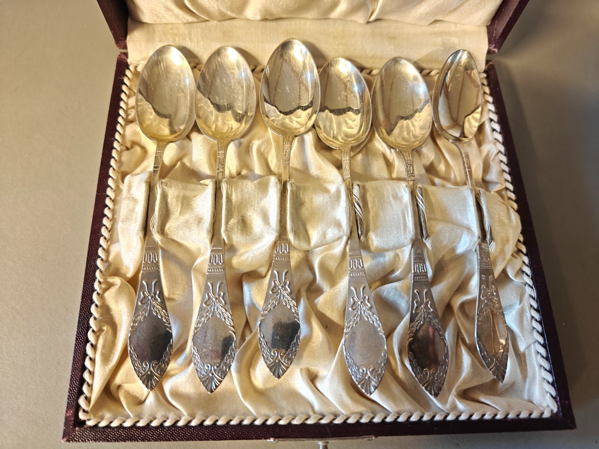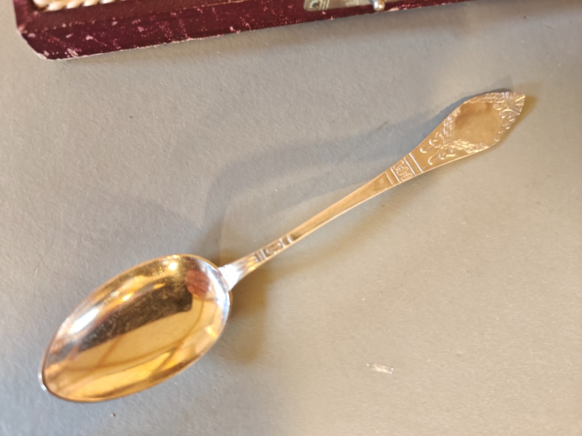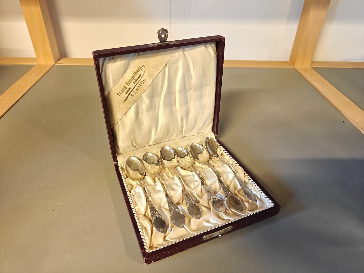 Æske med sølv mokkaskeer. 3-tårnet. 55g.