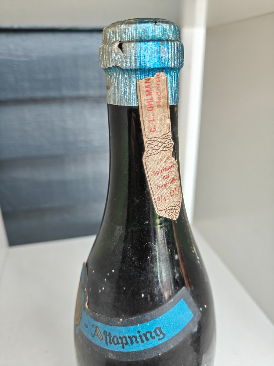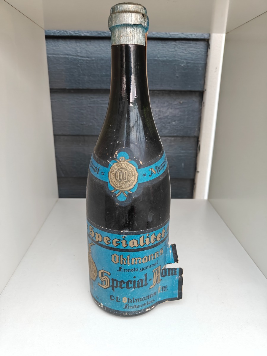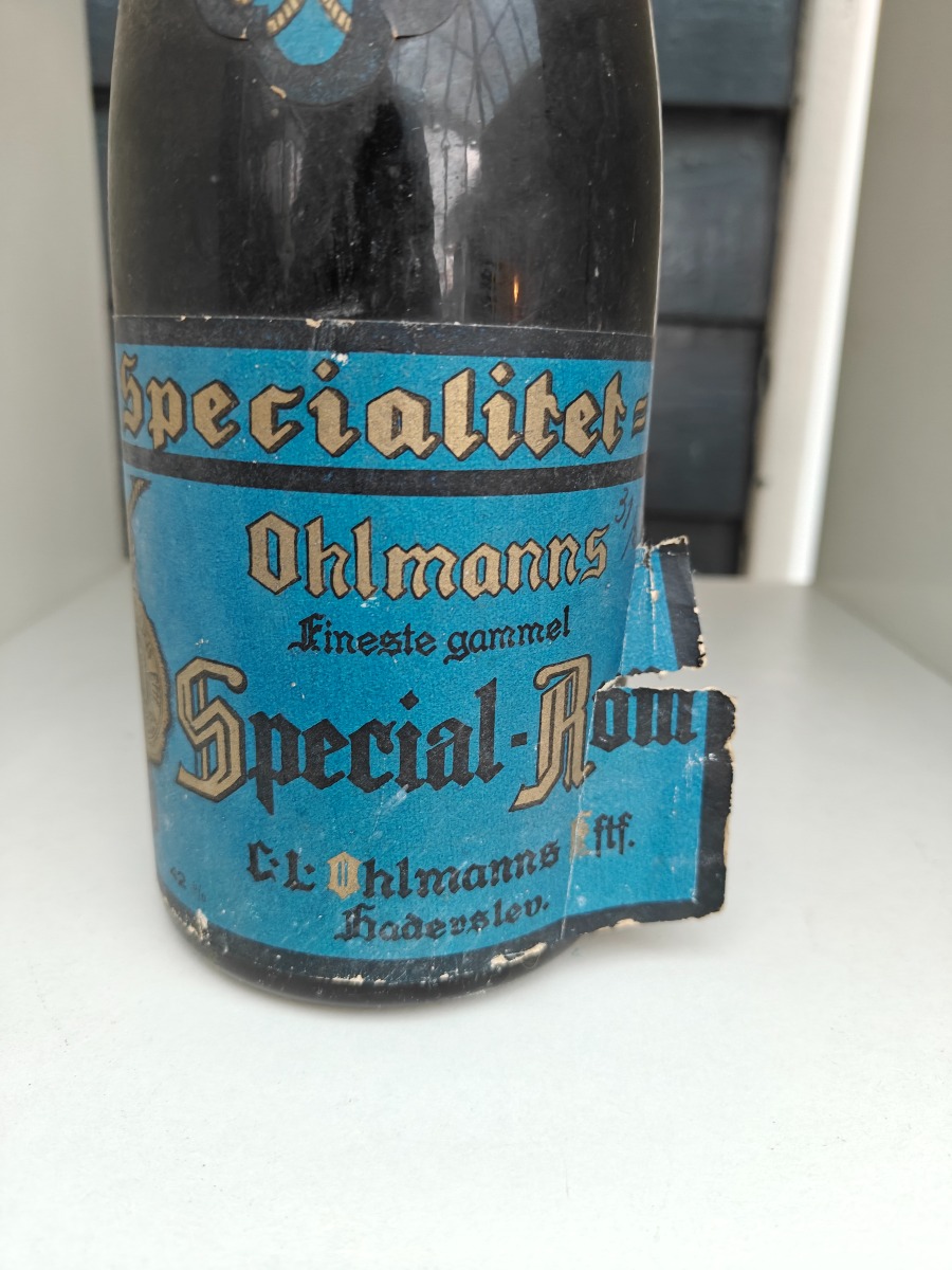 Ahlmanns fineste gammel Special-Rom. Etiket med skader og senere notat.
