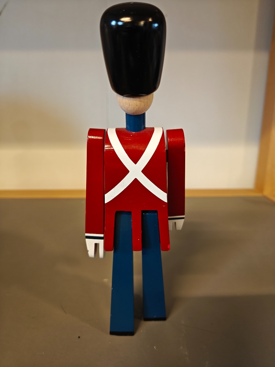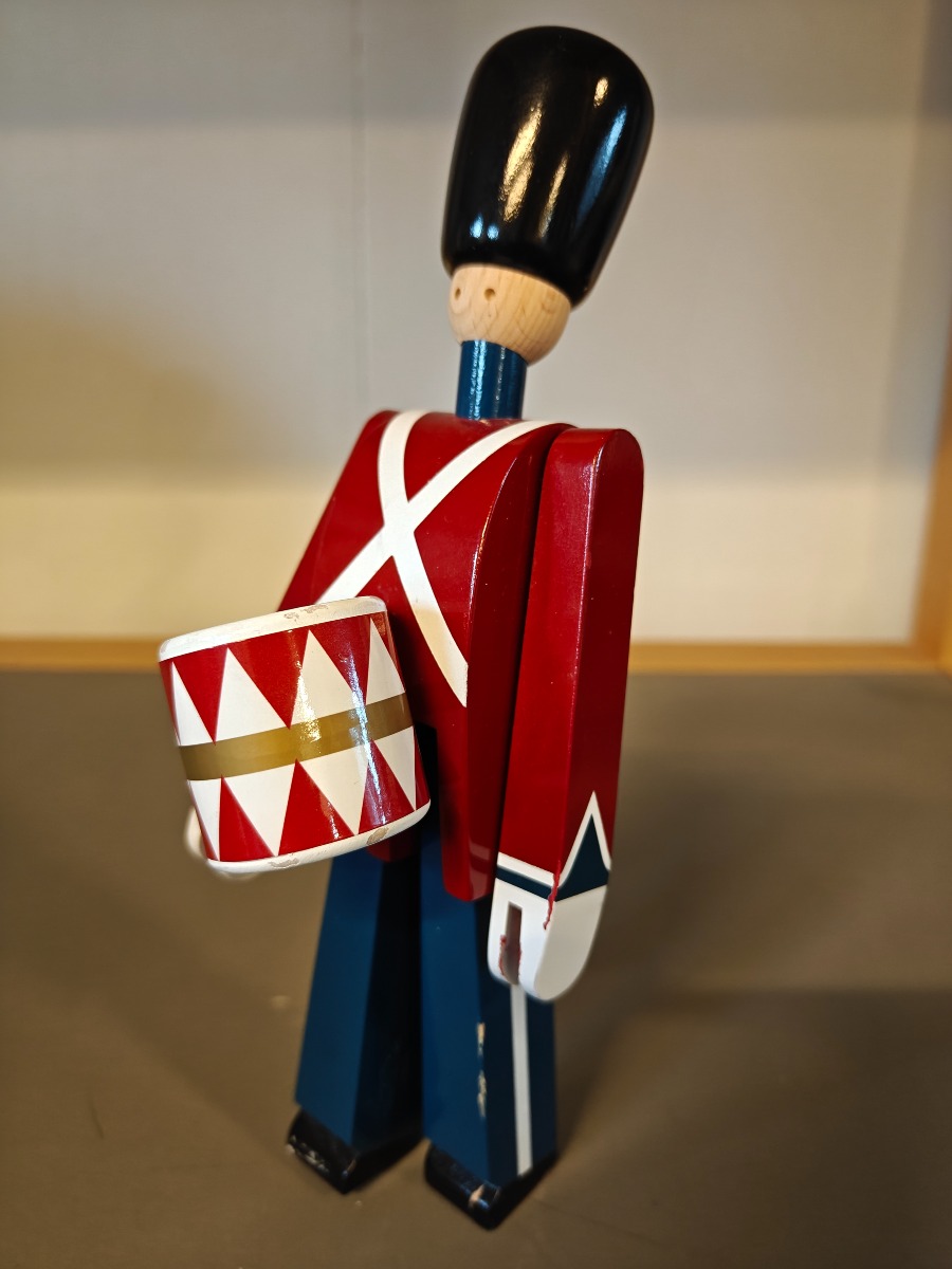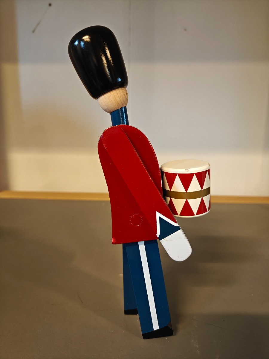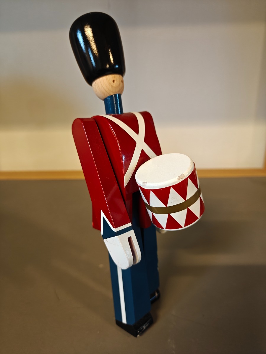 Kay Bojesen garder med tromme. Delvis bemalet bøg. H. 21,5 cm. Fremstillet hos Rosendahl. Fremstår med skader på lakering og trommestikker mangler.