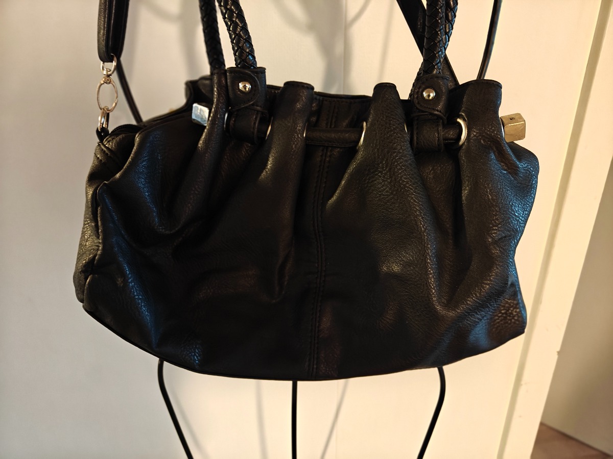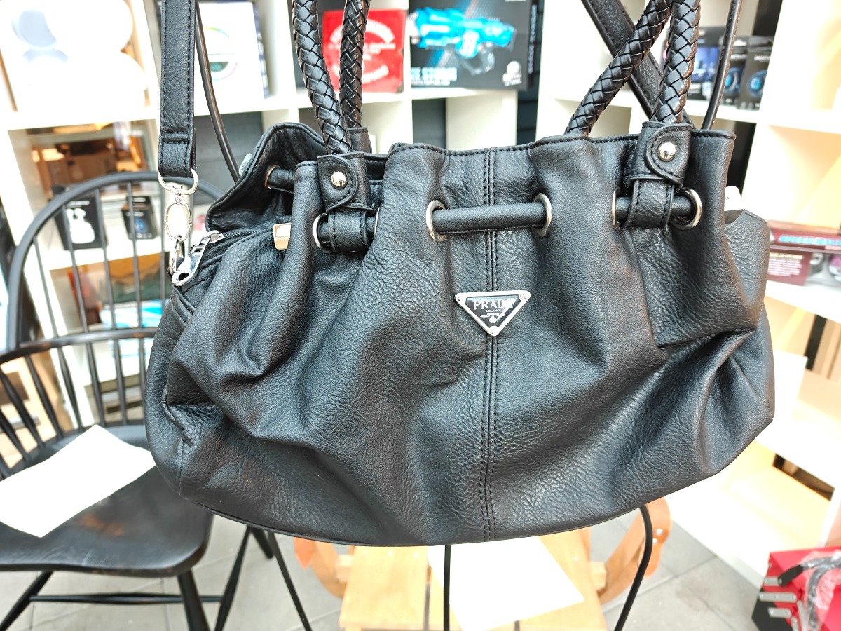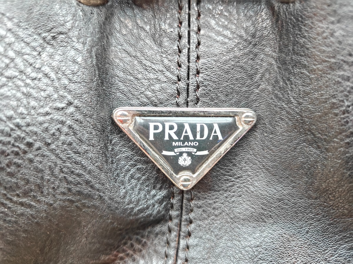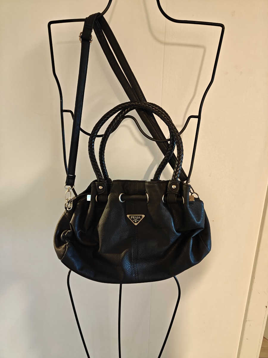 Prada håndtaske af sort læder. Indrettet med talrige rum. Aftagelig skulderstrop. Flettede greb på læderbeklædt metalstang. H. 23, B. 35 cm. Alm. let brugsslid.