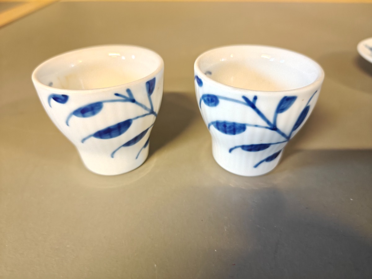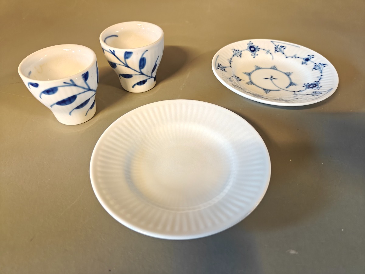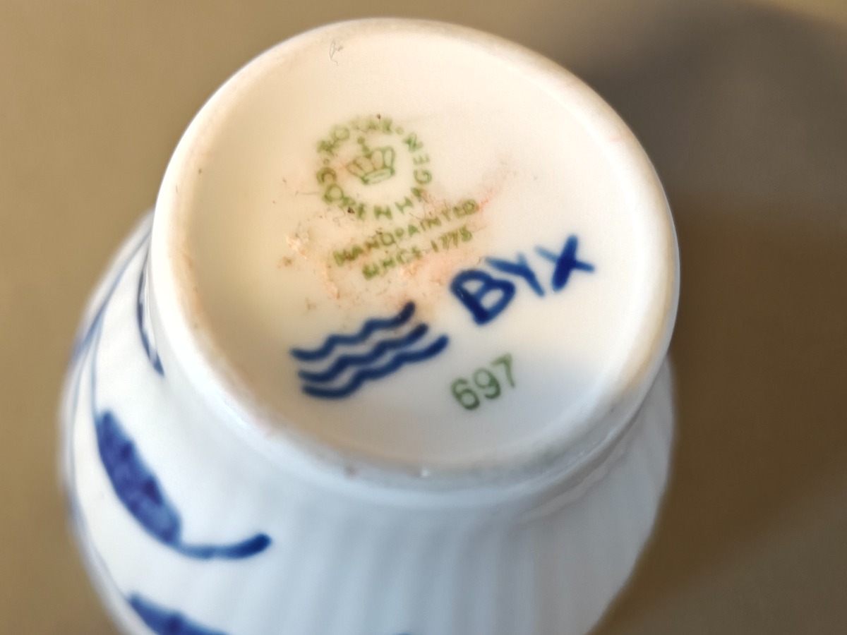Royal Copenhagen 2 Blå Mega æggebægre samt 2 riflede tall. 11 cm.