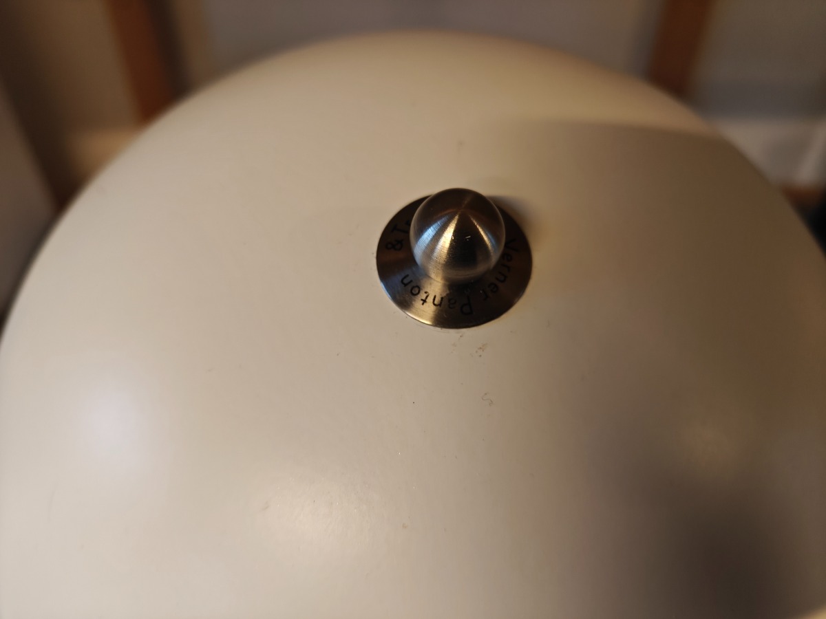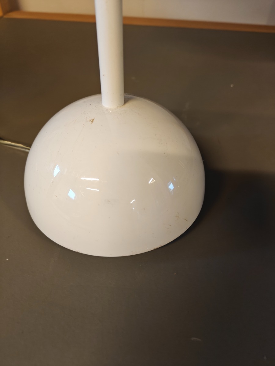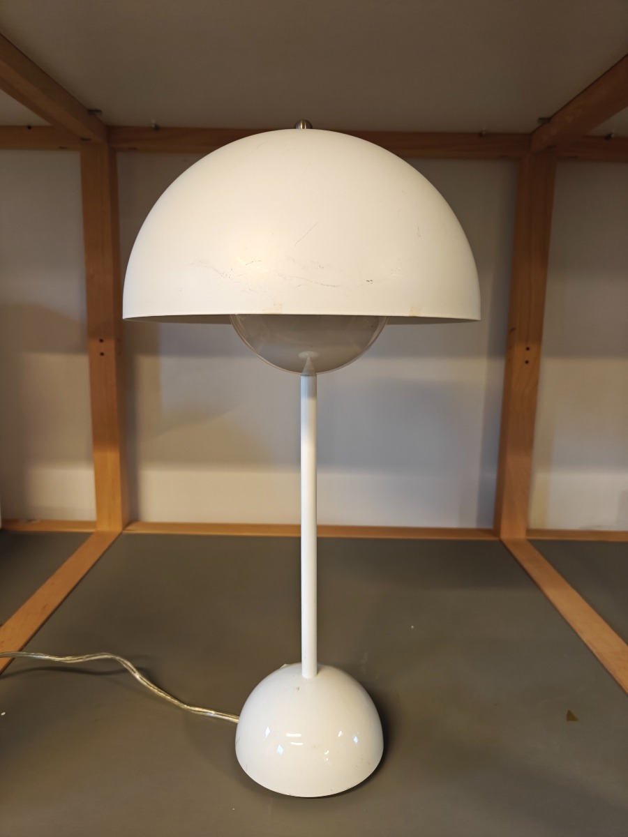 &Tradition Flowerpot VP3 Bordlampe. Design Verner Panton Mat hvid overskærm. H. 50 cm. Mindre brugsspor og skærmstativ med rep.