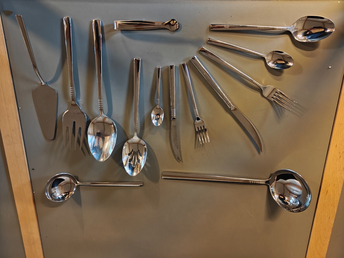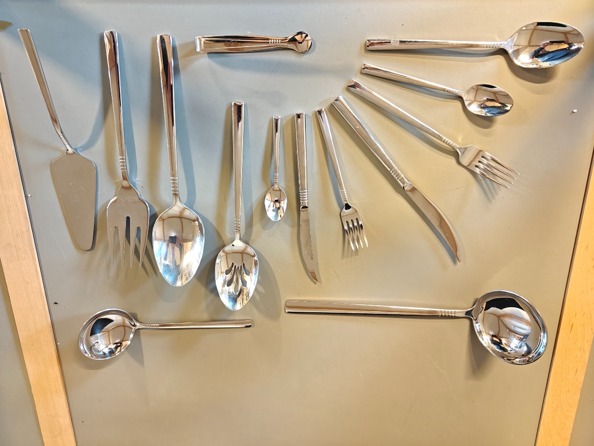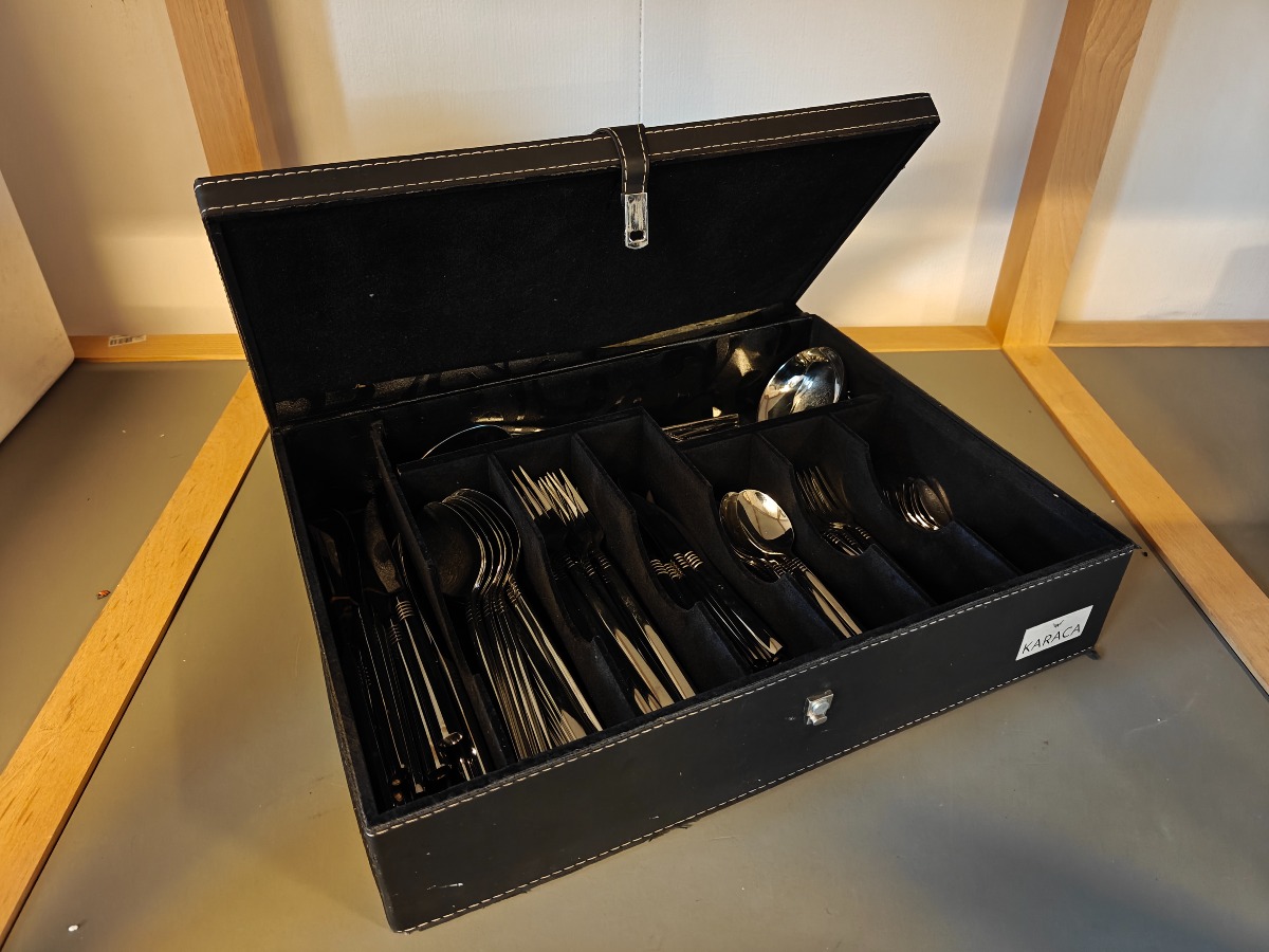 Karaca Elegance bestiksæt 12 pers. af poleret stål. Liggende i opbevaringskasse. Kagegafler kun 6 stk. Forskellige ta'ting. Liggende i defekt opbevaringskasse.