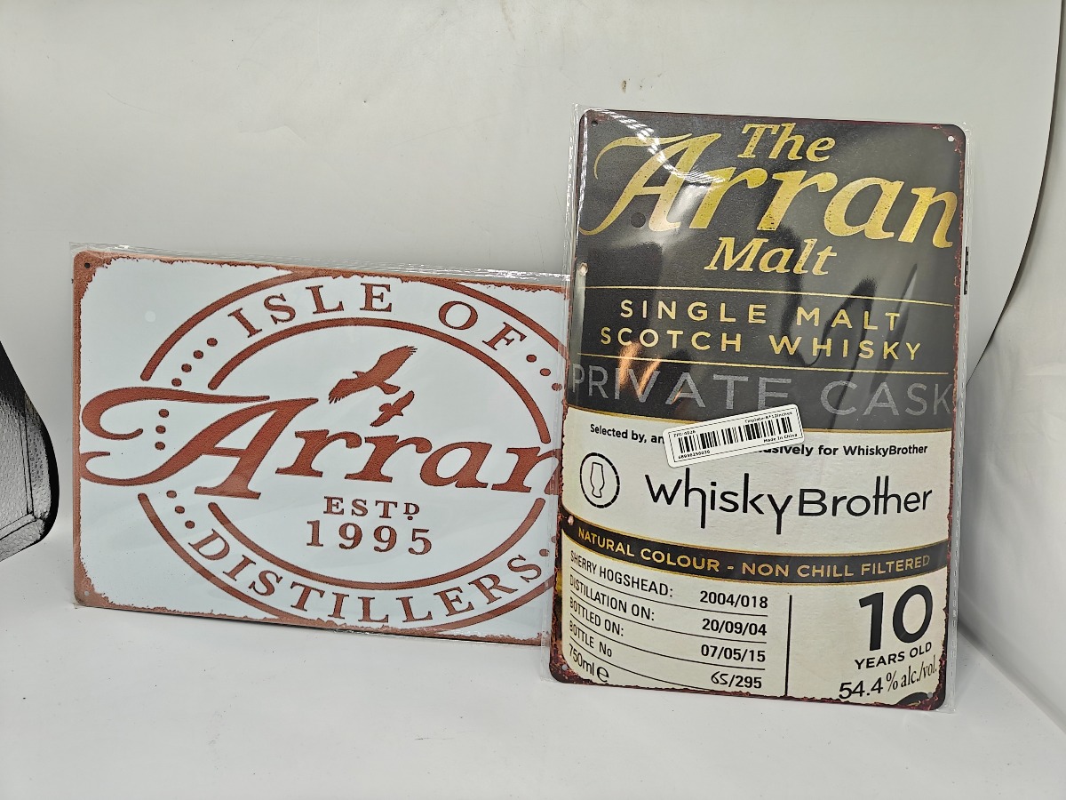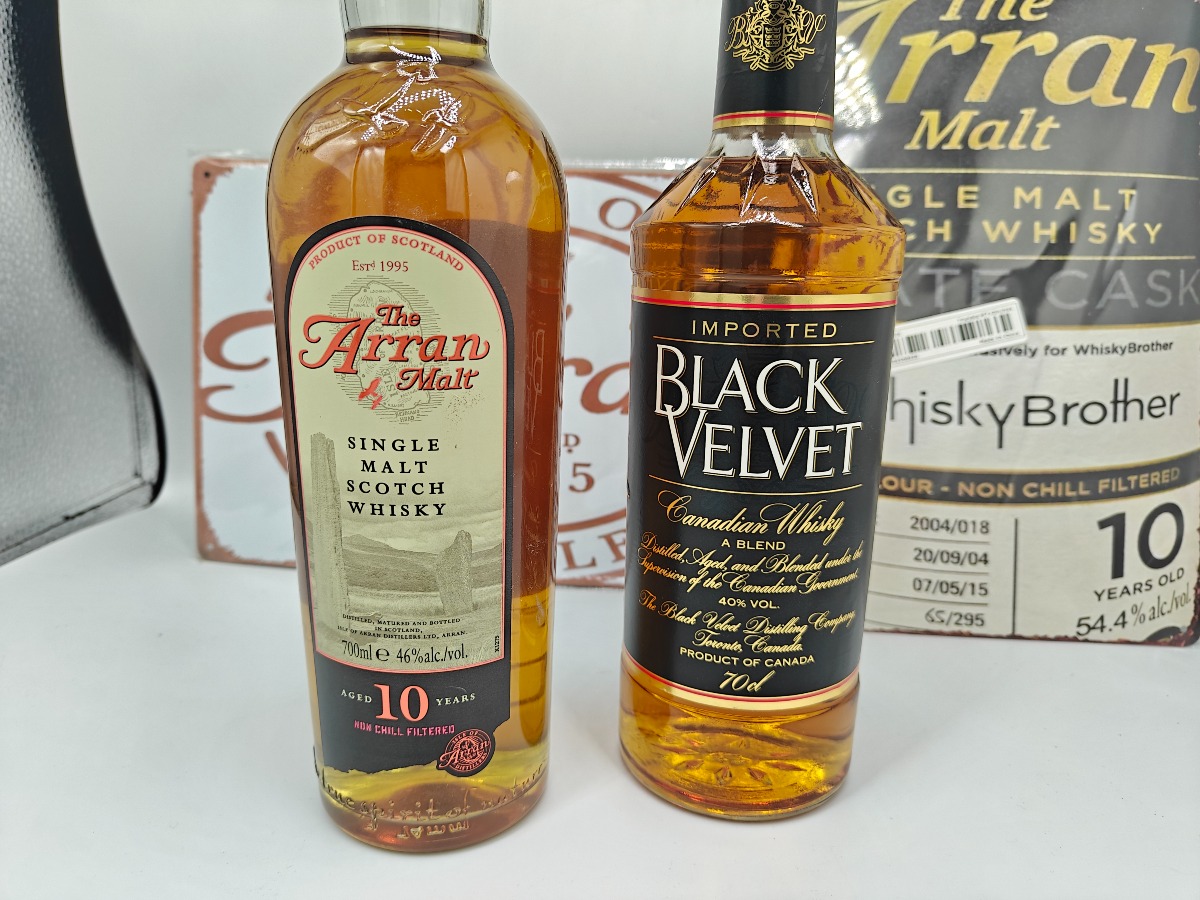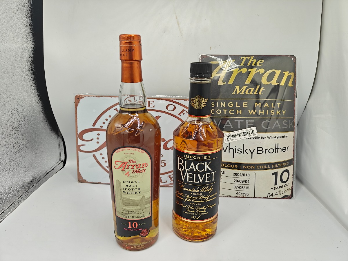 The Arran Malt whisky, single malt 10års samt Black Velvet blended (Canada). Hertil 2 metalskilte med reklame for The Arran Malt whisky.
