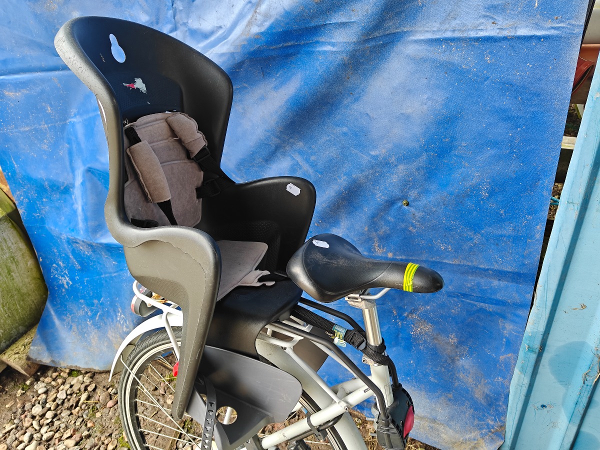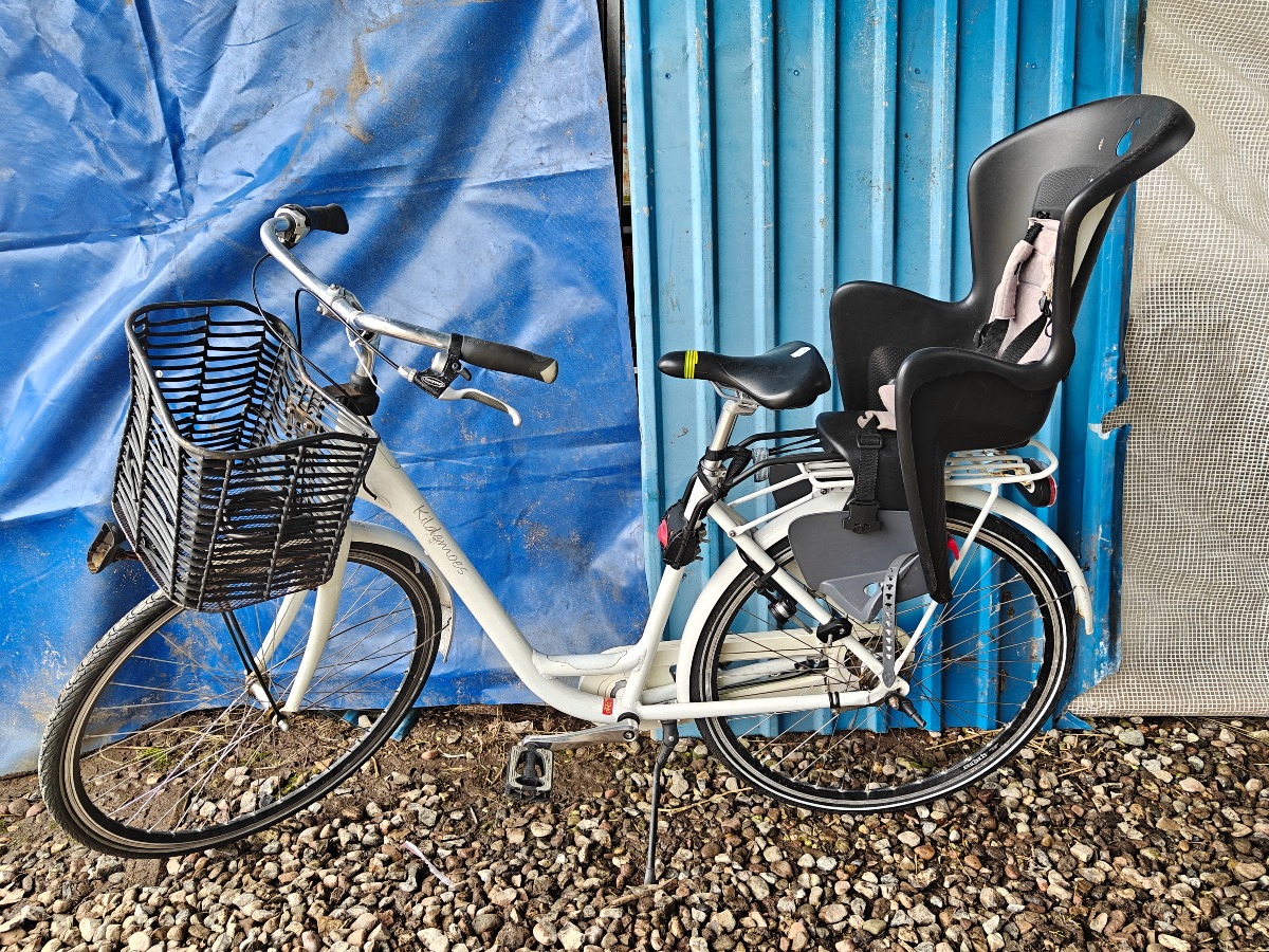 Kildemoes damecykel med barnesæde. Mangler og defekter kan forekomme. Vi garanterer ikke for funktionaliteten.