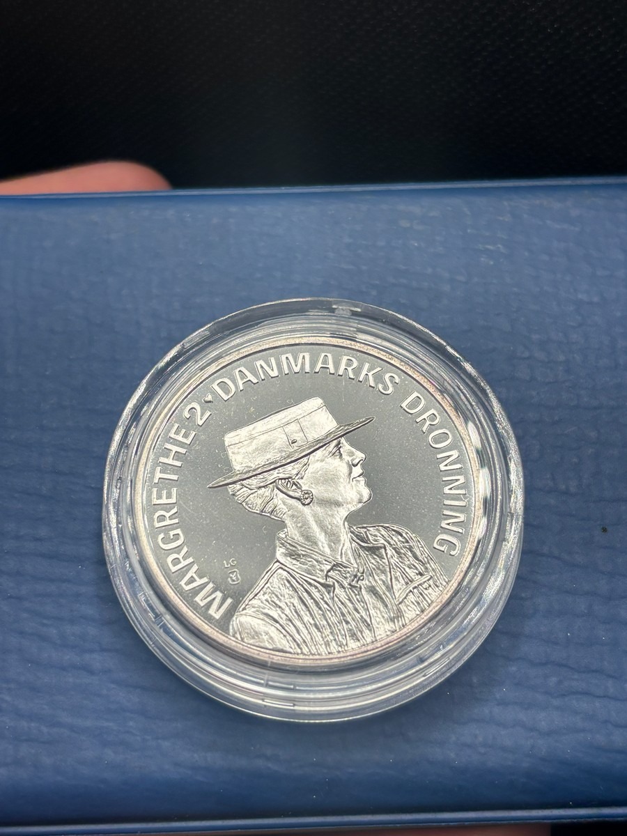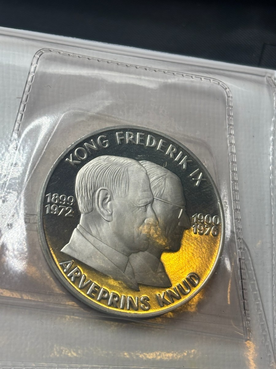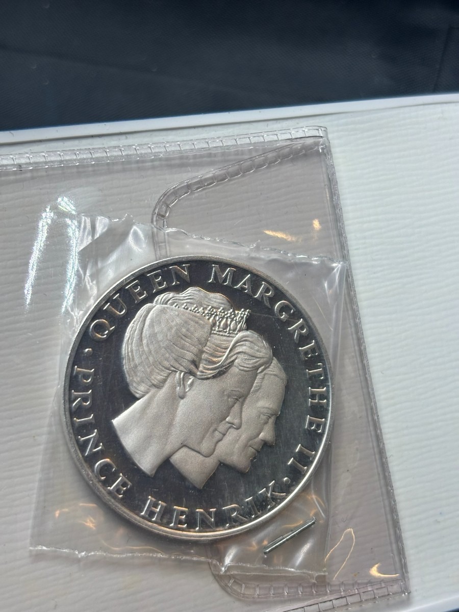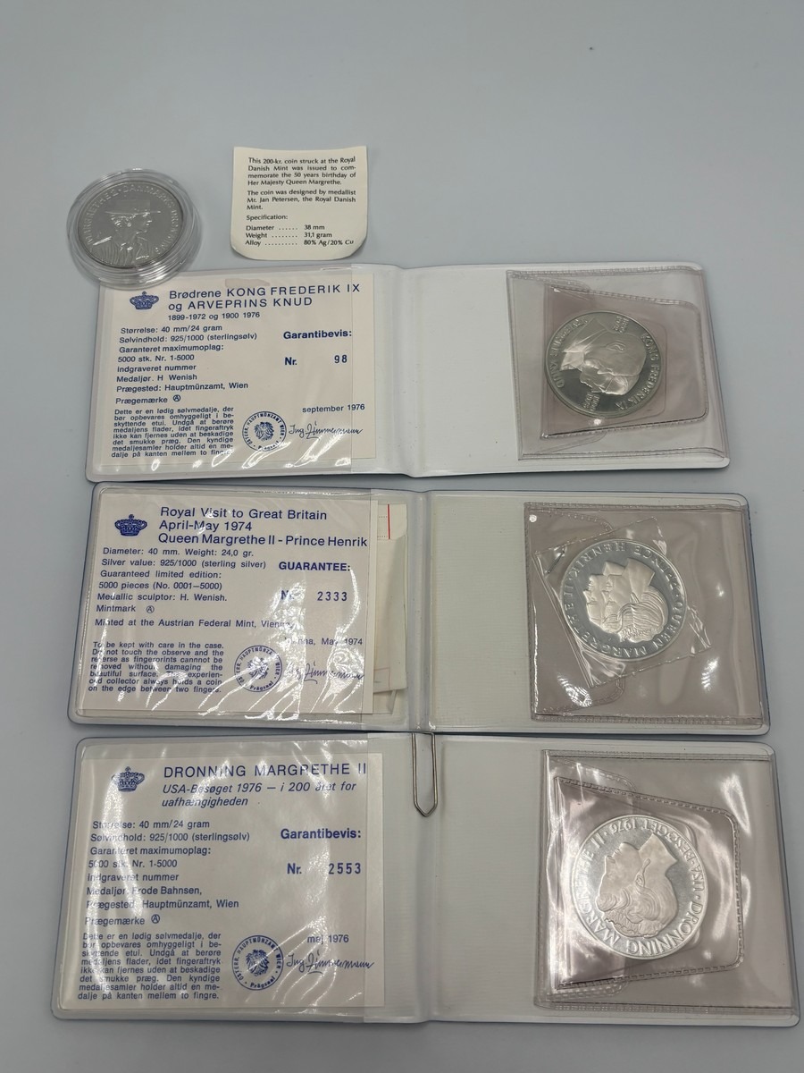 4 stk. sølvmønter - 2 x Dronning Margrethe II, Dronning Margrethe II & Prins Henrik og Kong Frederik IX & Arveprins Knud.
