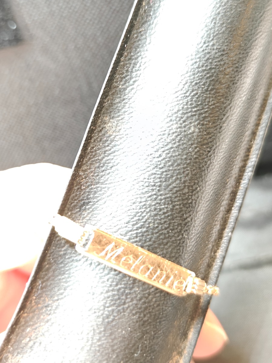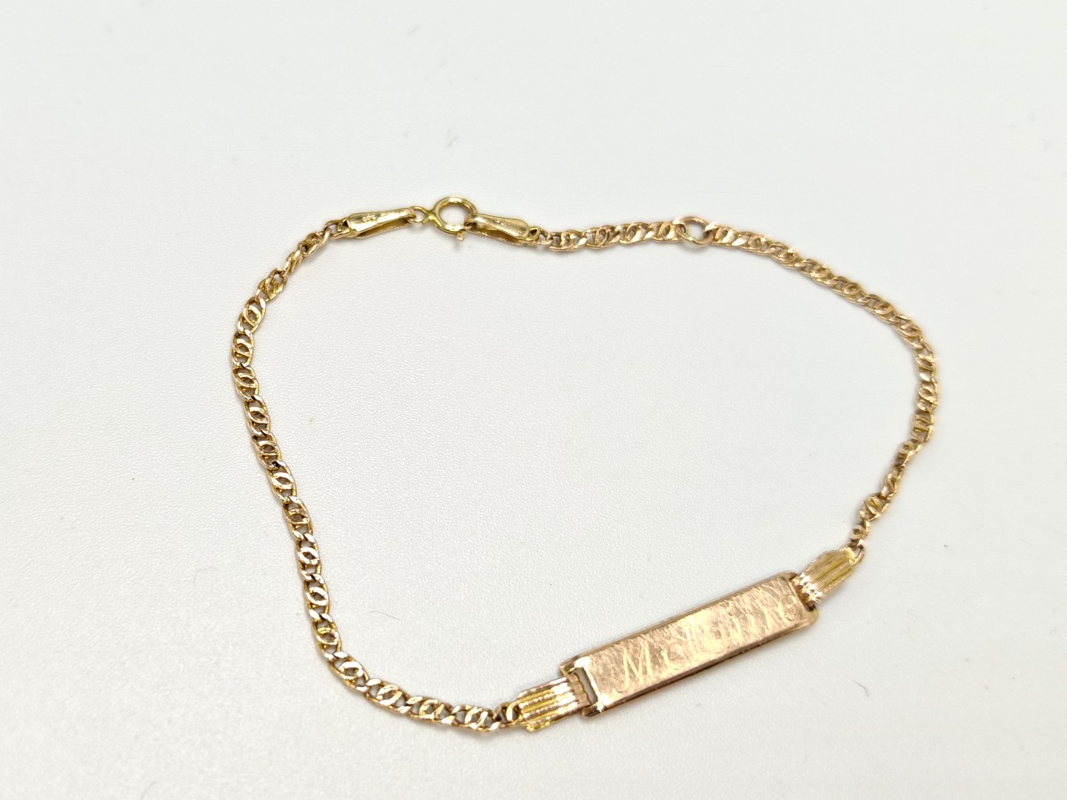 Armbånd med navneplade 14 karat. Den er stemplet 585 og vejer 2 gram. På navnepladen er der graveret "Melanie" Trænger evt. til rens. Brugt. Salg for offentlig myndighed.