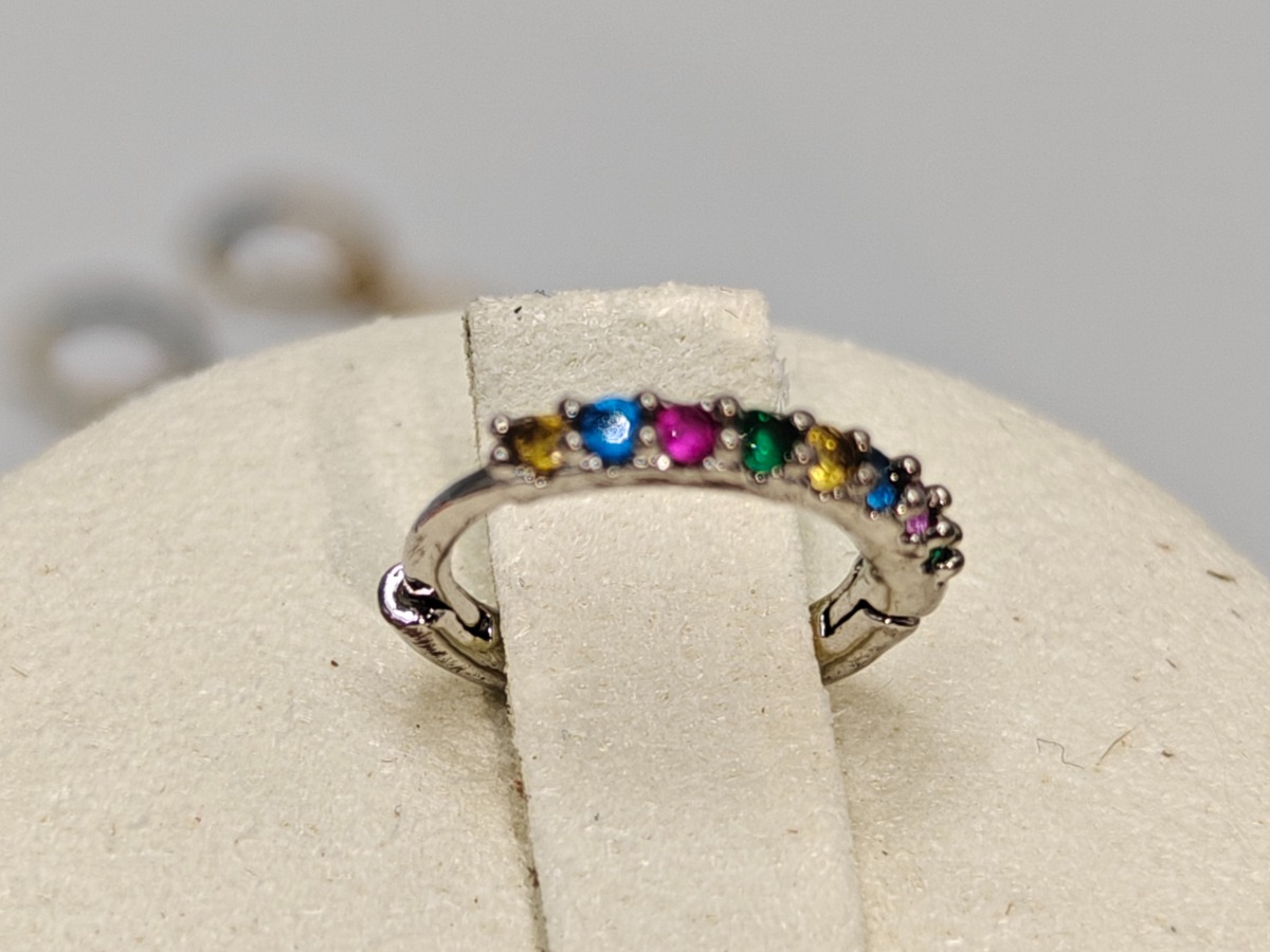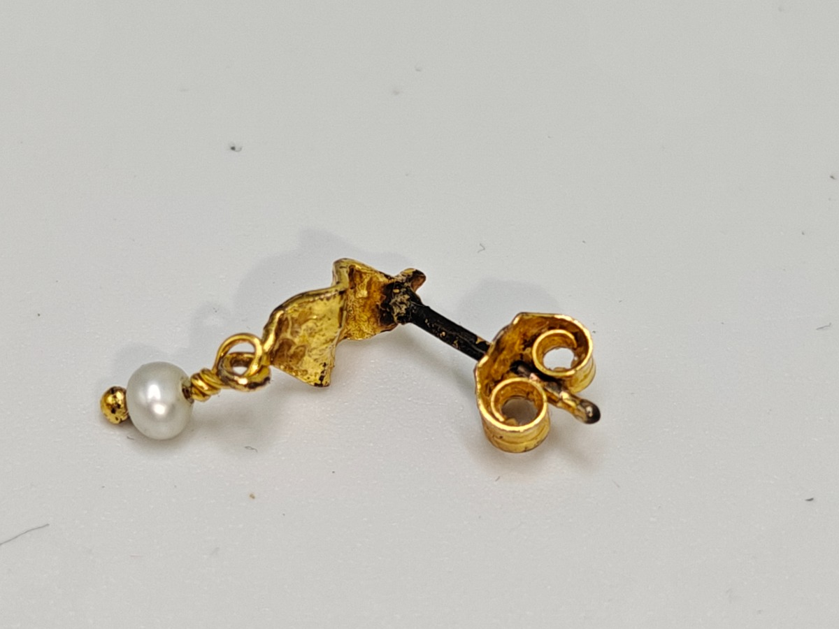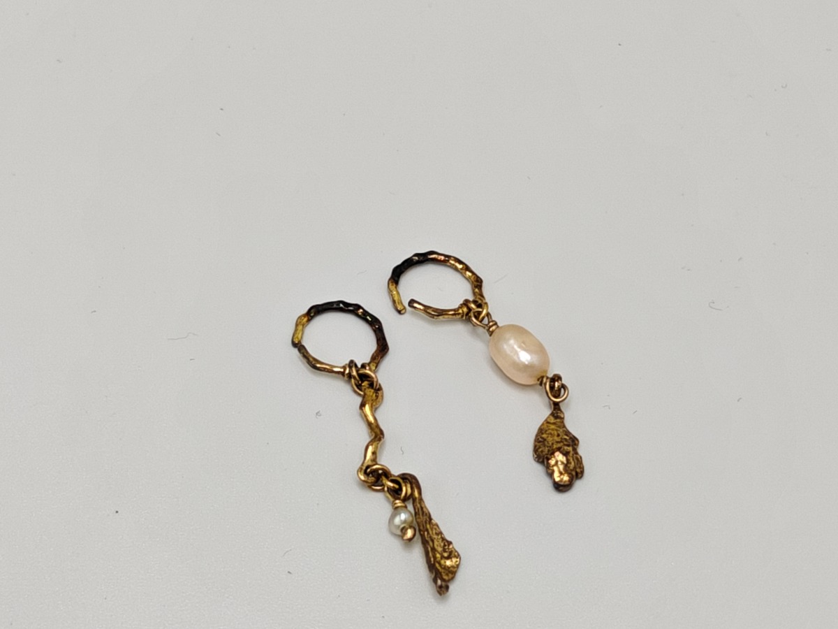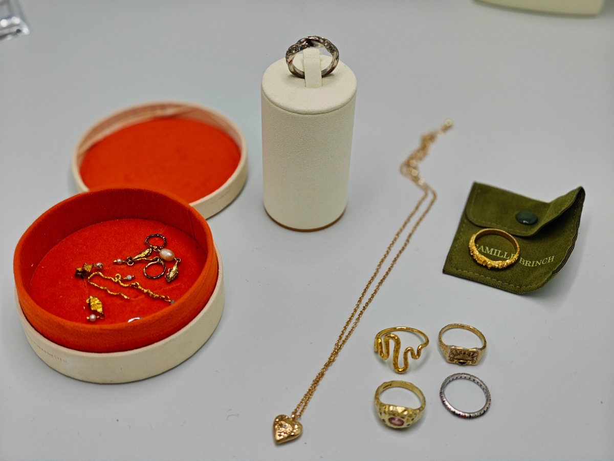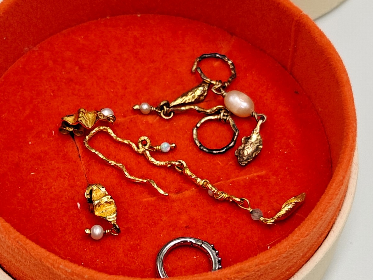 Månestens smykker (12). 6 stk ringe, kæde med hjerte, 1 sæt øreringe med perle, andre enkelte øreringe. Trænger evt. til rens. Brugt. Salg for offentlig myndighed.