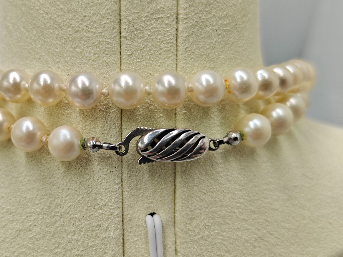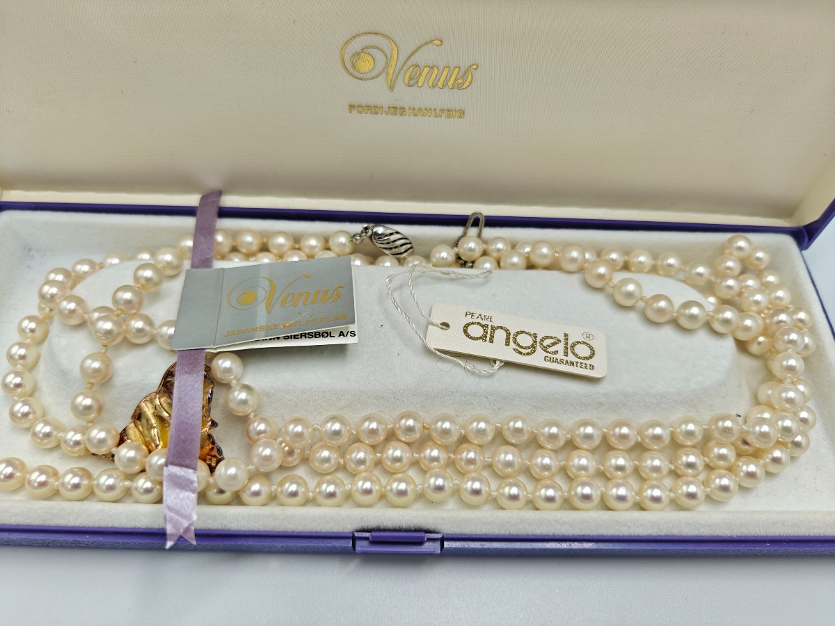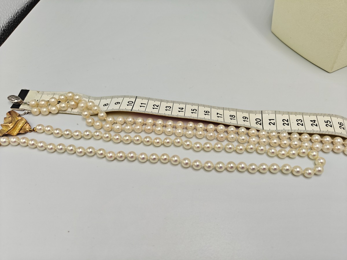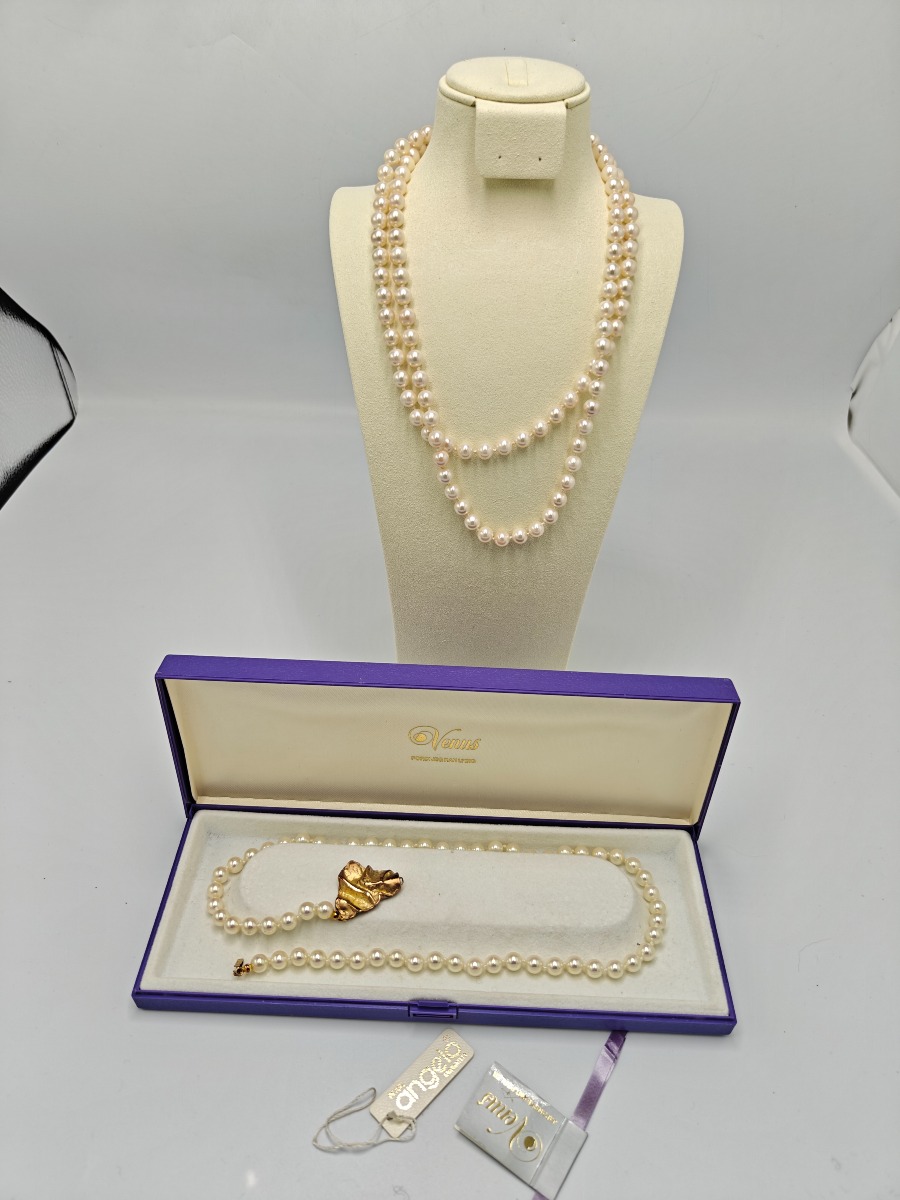 Perlekæder (2). Perlekæde forgyldt sterlingsølv, Jens Aagaard, den er stemplet 925. Den måler 42 cm. Perlekæde med sterlingsølv lås. Stemplet 925. Måler 80 cm. Trænger evt. til rens. Brugt. Salg for offentlig myndighed.