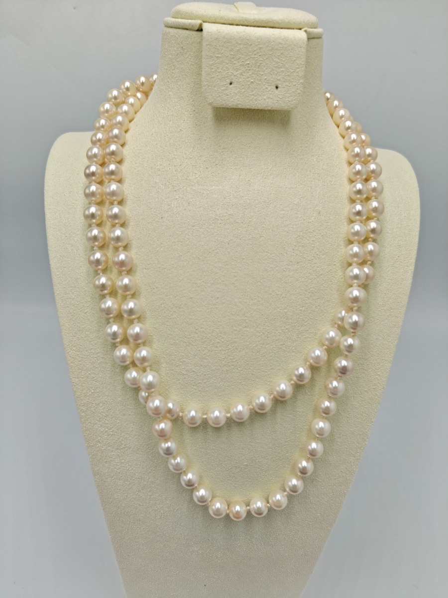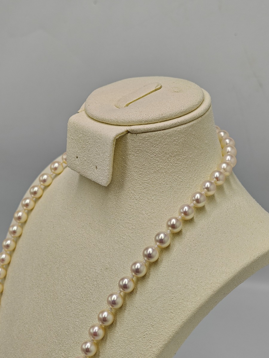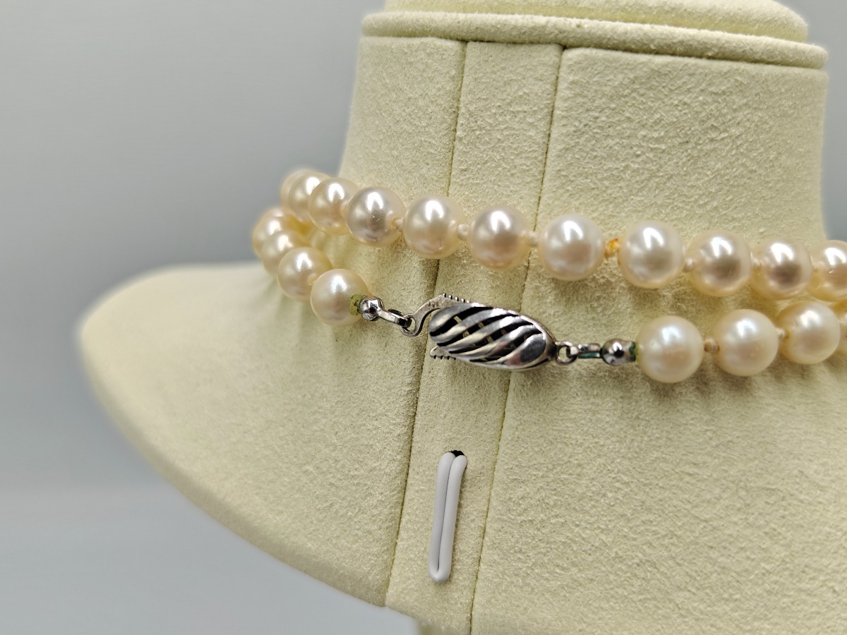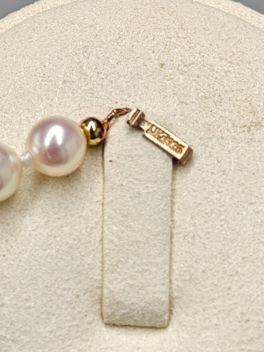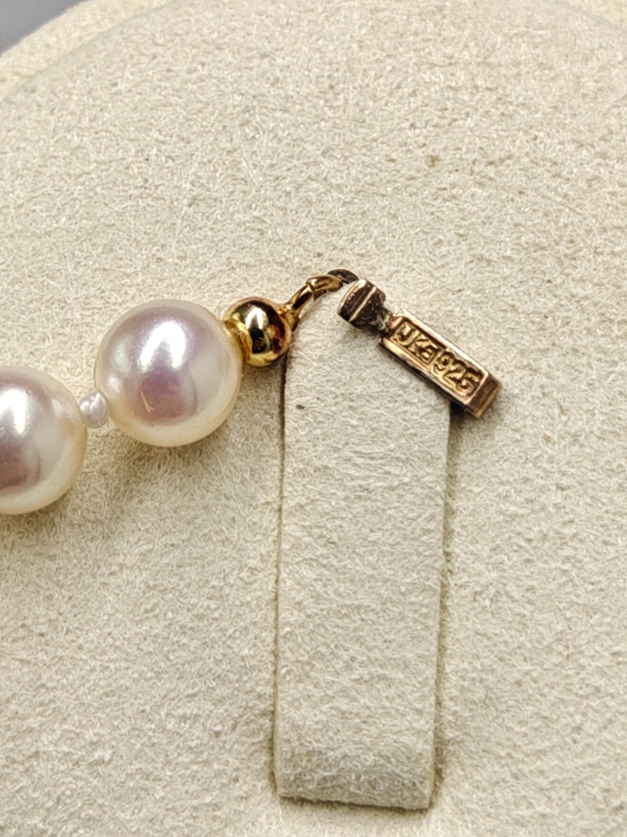 Perlekæder (2). Perlekæde forgyldt sterlingsølv, Jens Aagaard, den er stemplet 925. Den måler 42 cm. Perlekæde med sterlingsølv lås. Stemplet 925. Måler 80 cm. Trænger evt. til rens. Brugt. Salg for offentlig myndighed.