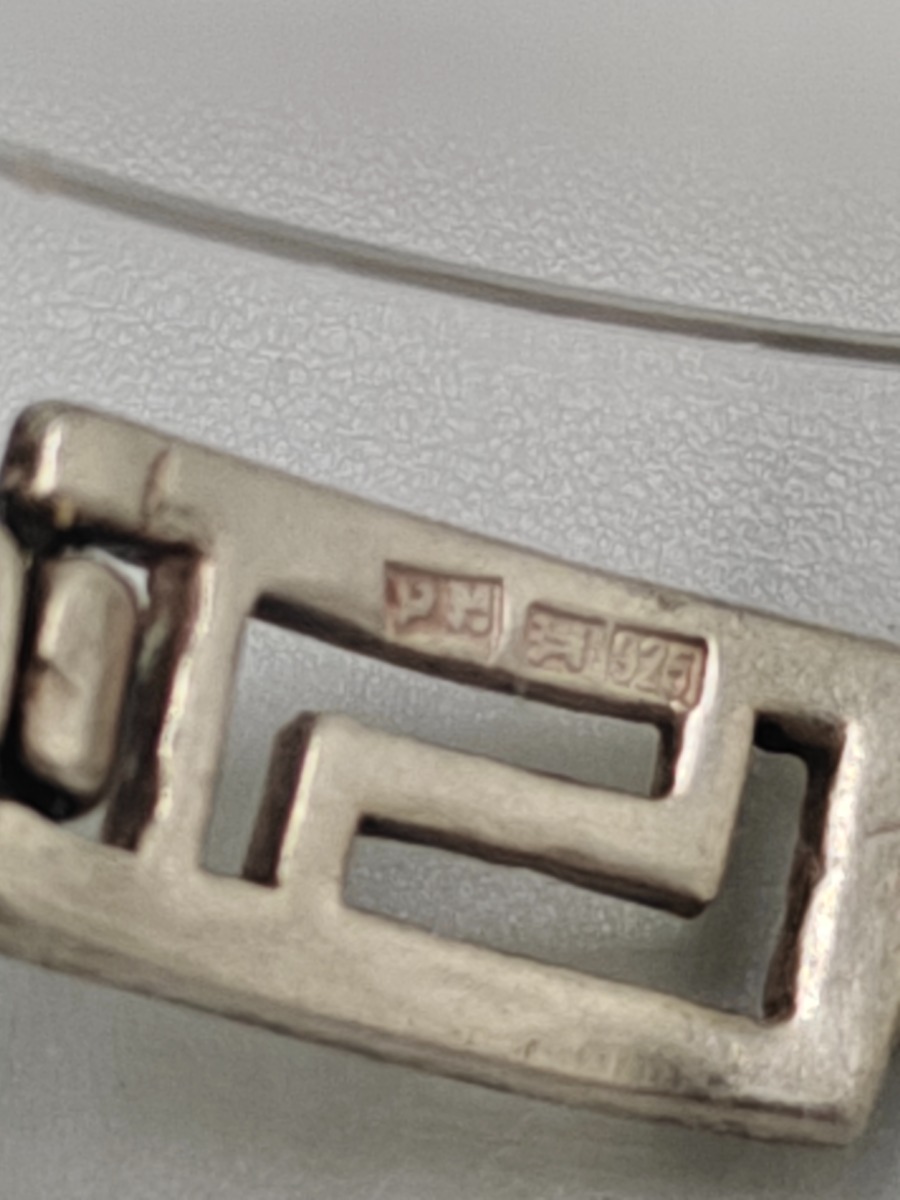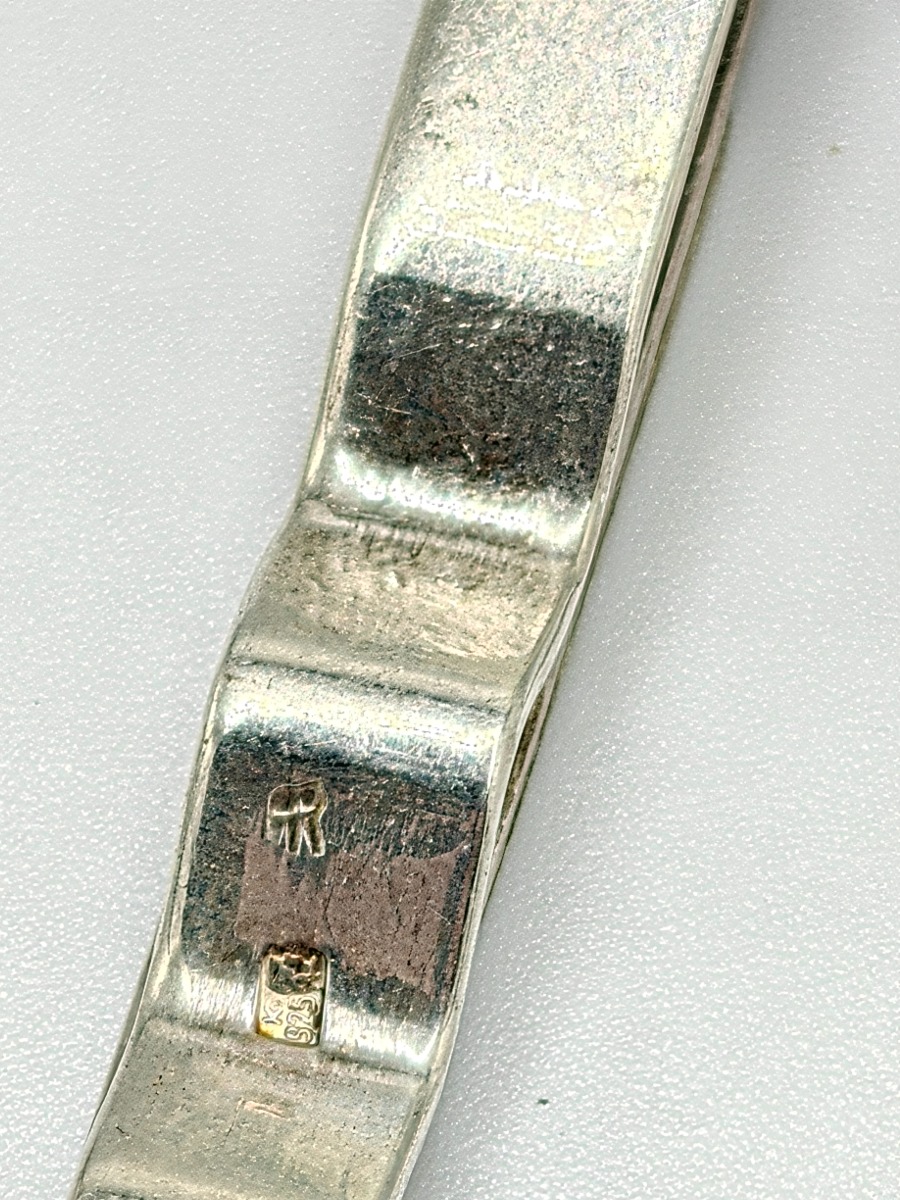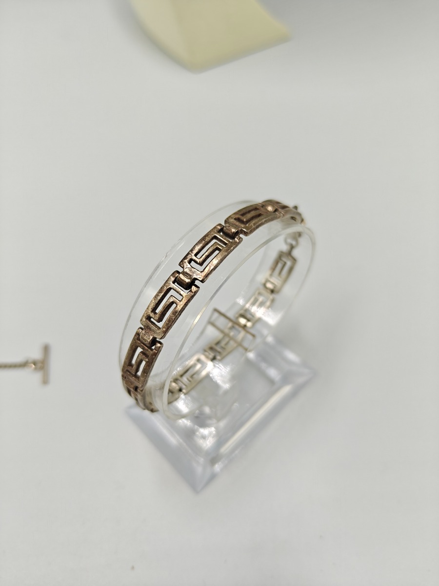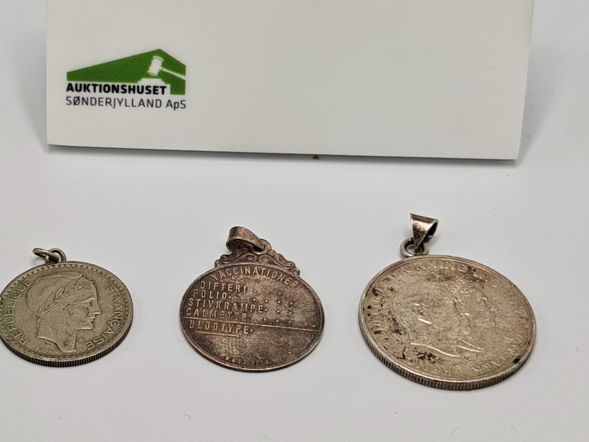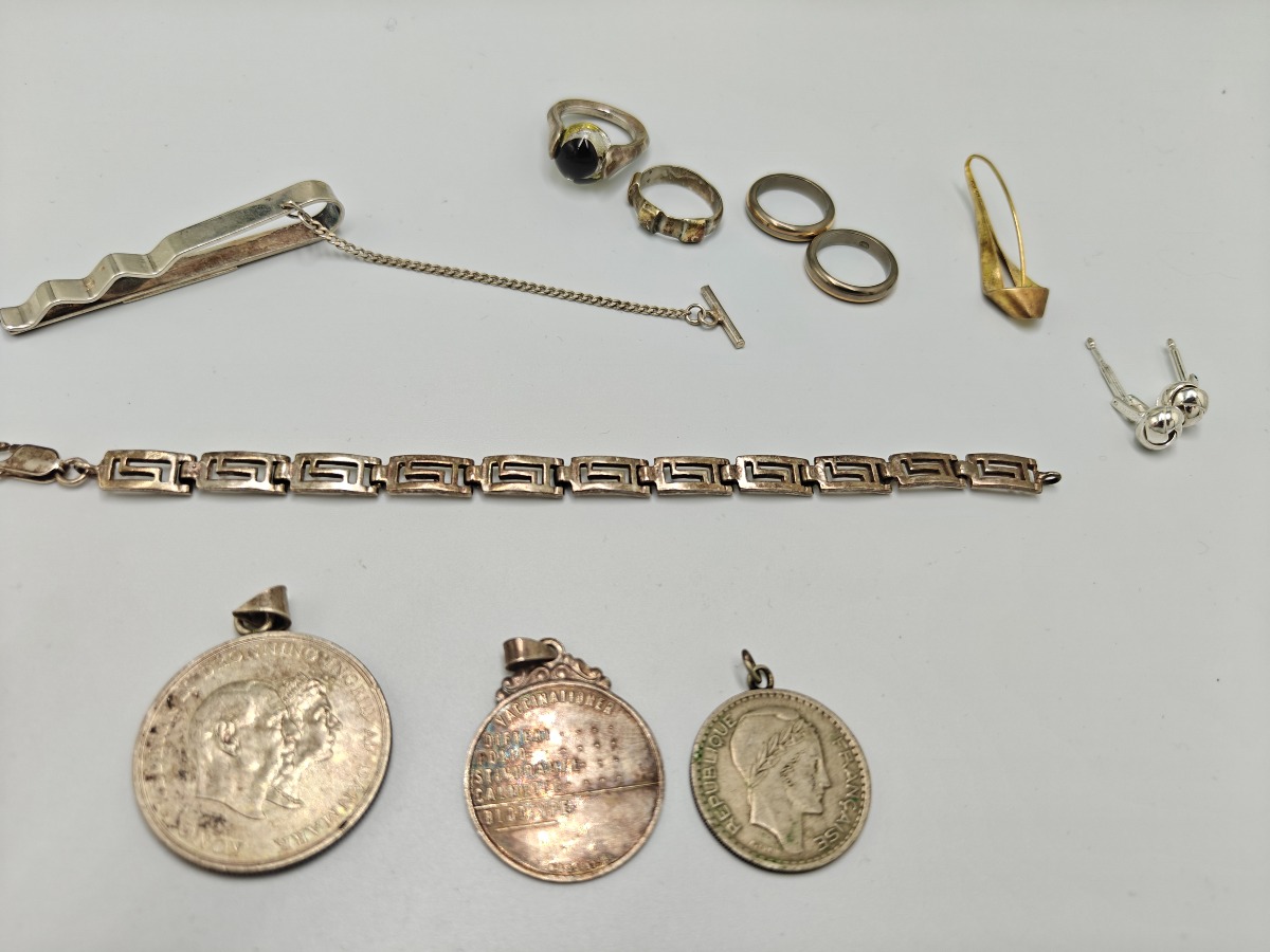 Smykker (11). Armbånd sterling sølv, stemplet 925, måler 18 cm og vejer 14 g. Slipsenål, stemplet PGNIG og vejer 11 gram, Forgyldt broche, stemplet PCO 925 og vjer 3 gram, Ring med glassten. Stemplte 925, vejer 6 gram uden sten og 8 gram med sten. Måler 53. 2 stk ens ringe stemplet, måler 49. Ring med forgyldt firkanter, stemplet 925 og vejer 3 gram. Manchetknapper stemplet 925 sterling sølv, vejer 3 gram, Møntevedhæng stor vejer 18 gram, mellem vejer 6 gram og lille vejer 7 gram. Trænger evt. til rens. Brugt. Salg for offentlig myndighed.