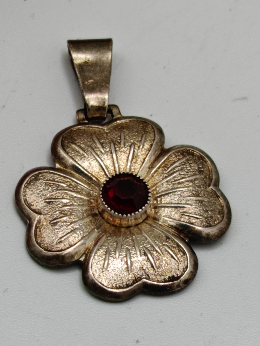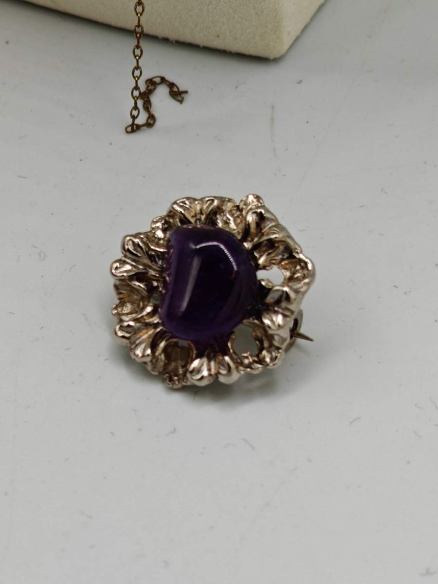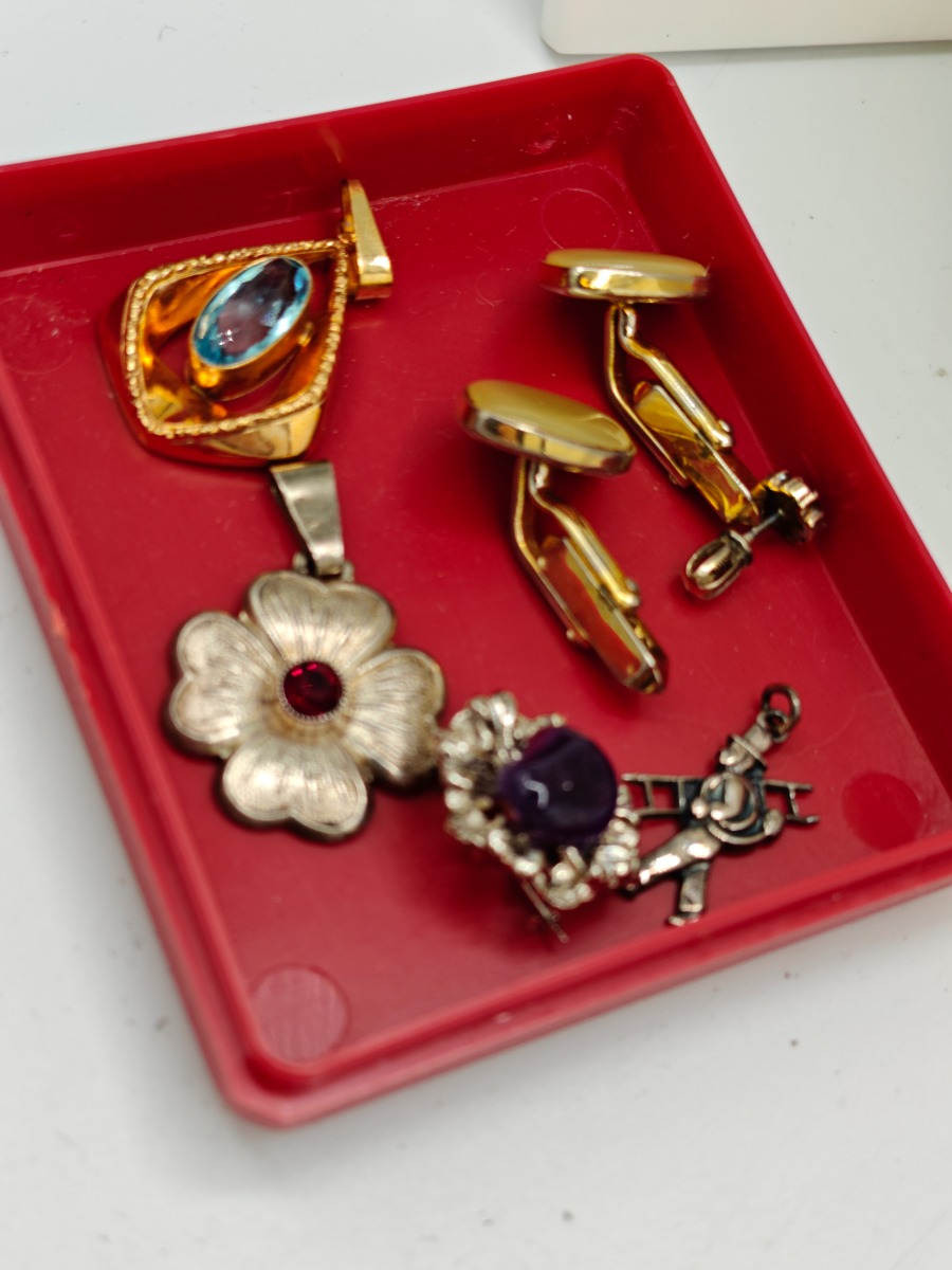 Diverse bijouteri smykker. 3 smukke vedhæng, broche med lilla sten, kæde samt knaphuls machetter. Brugte