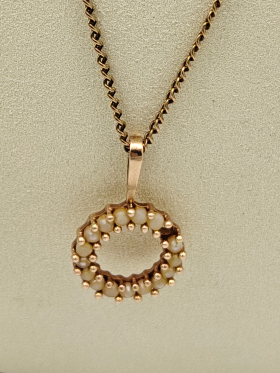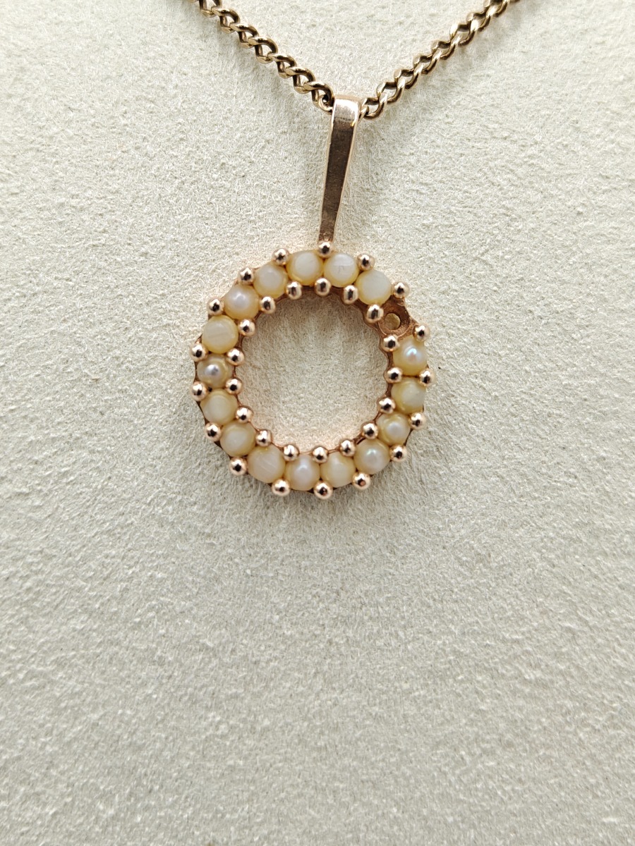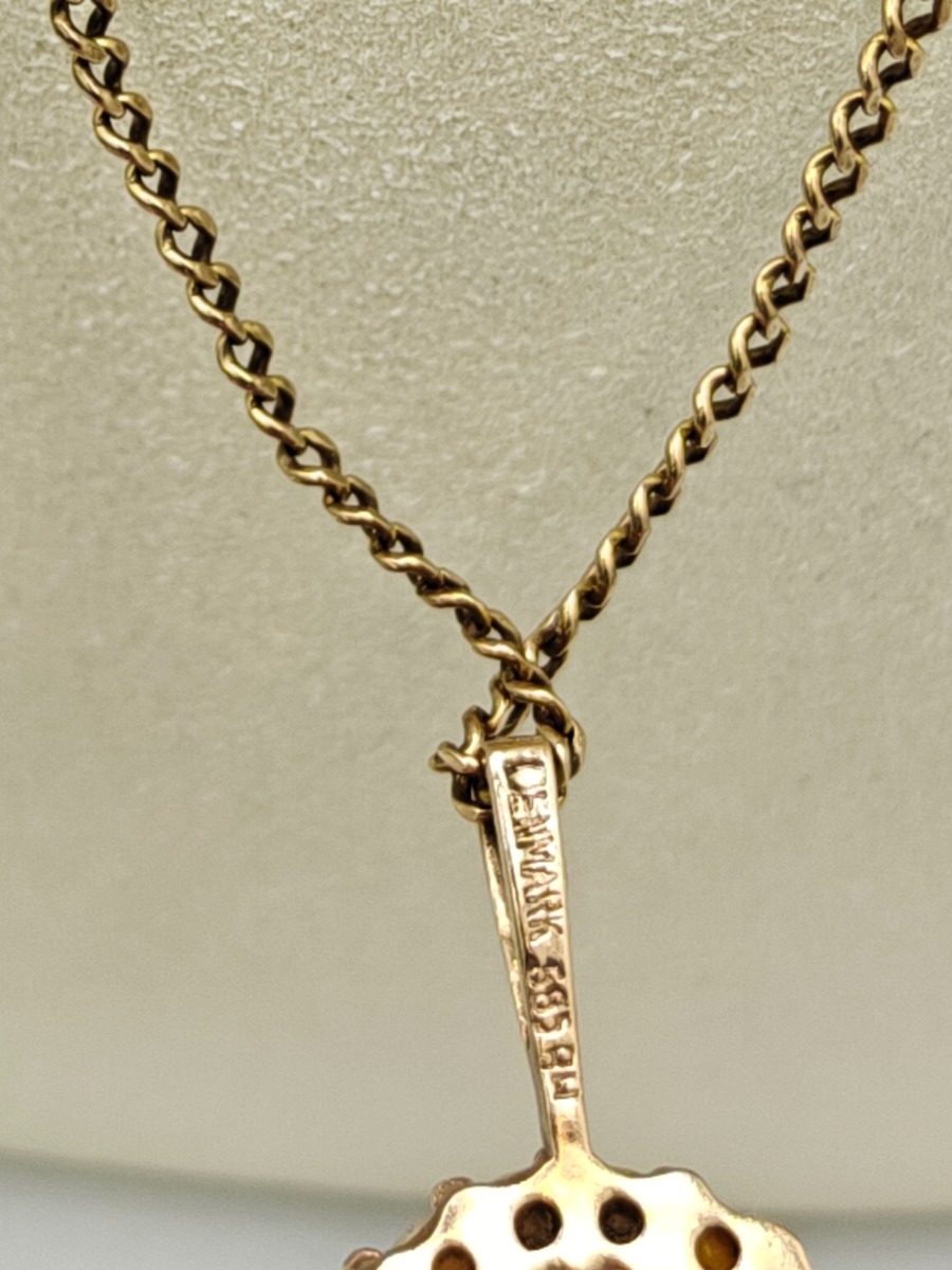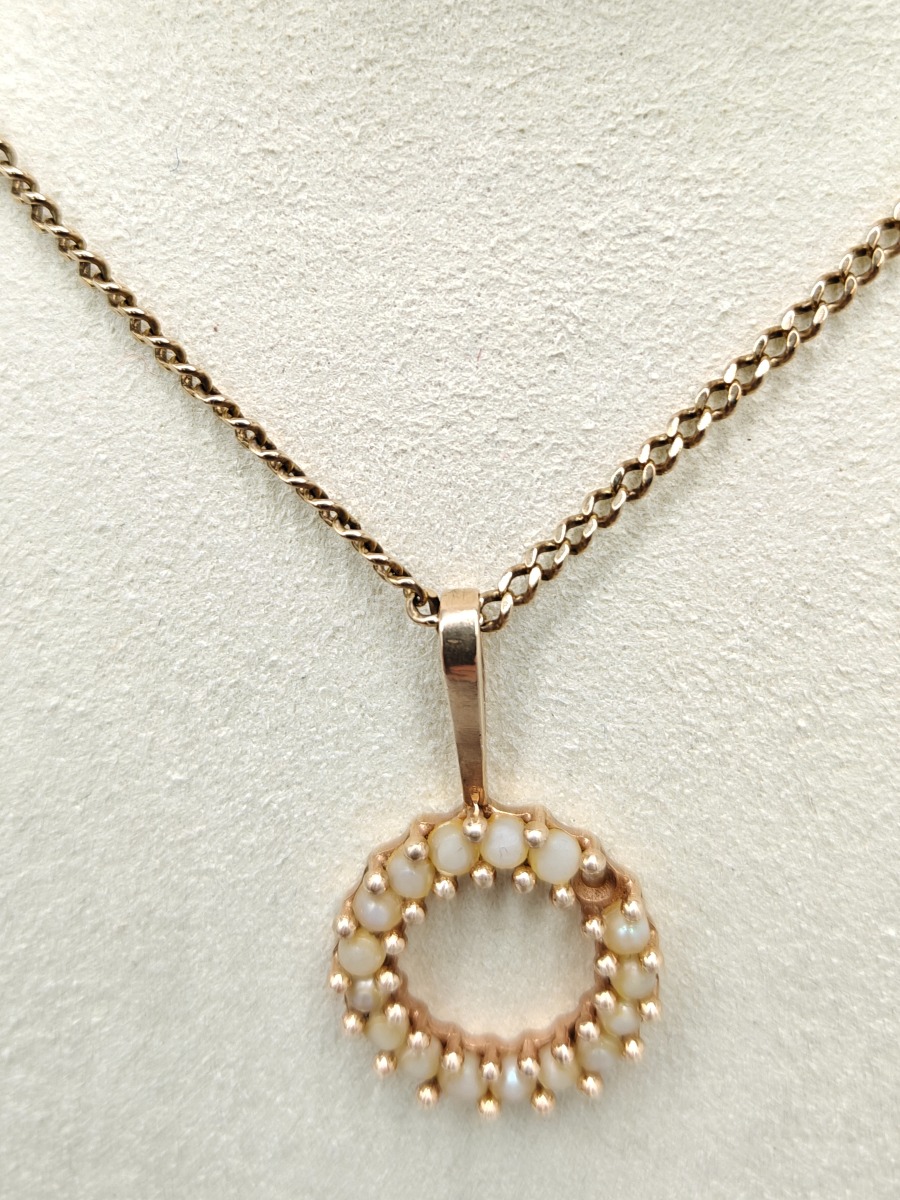 Guldkæde med vedhæng, 14 karat. Stemplet 585. Vejer 8 gram. Vedhæng er perler, men mangler glans. Brugt