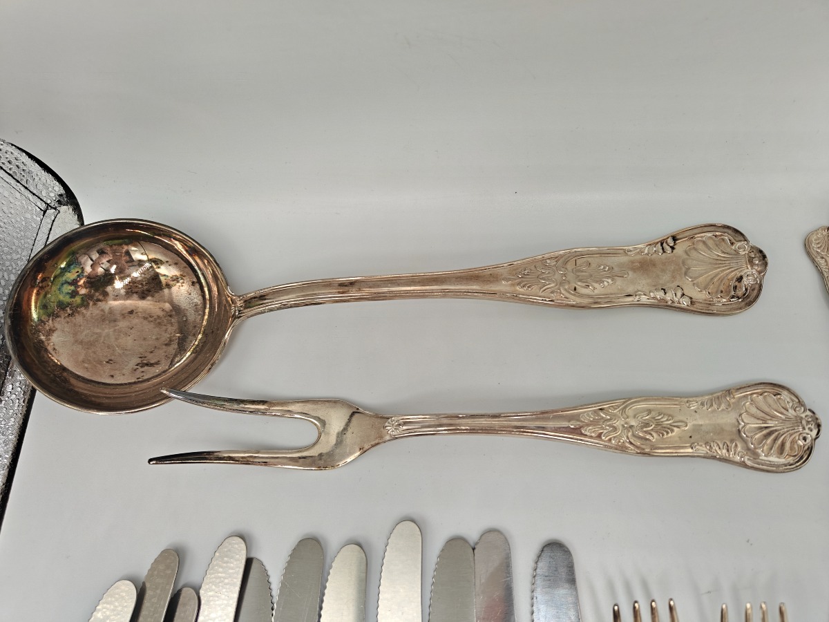 Komplet spiseservice i pletsølv, 49 dele. 12 spiseskeer, 12 gafler, 11 knive, 12 teskeer, opøseske og stegegaffel. Vejer 3000 gram. Brugt og i pæn stand.