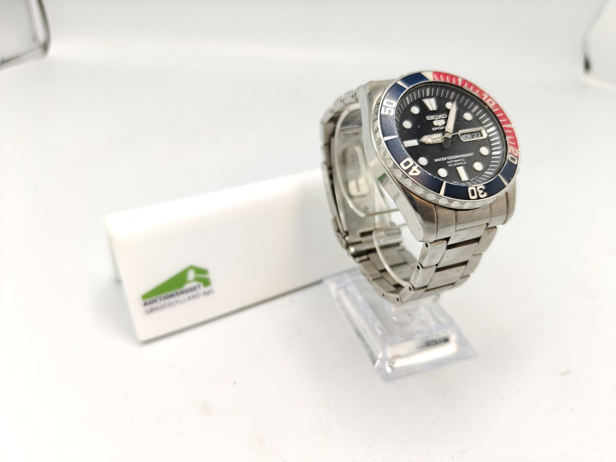 Seiko 5 Sports herreur med sort urskive og lænke i rustfrit stål. Pæn stand. Brugt og trænger til rengøring.