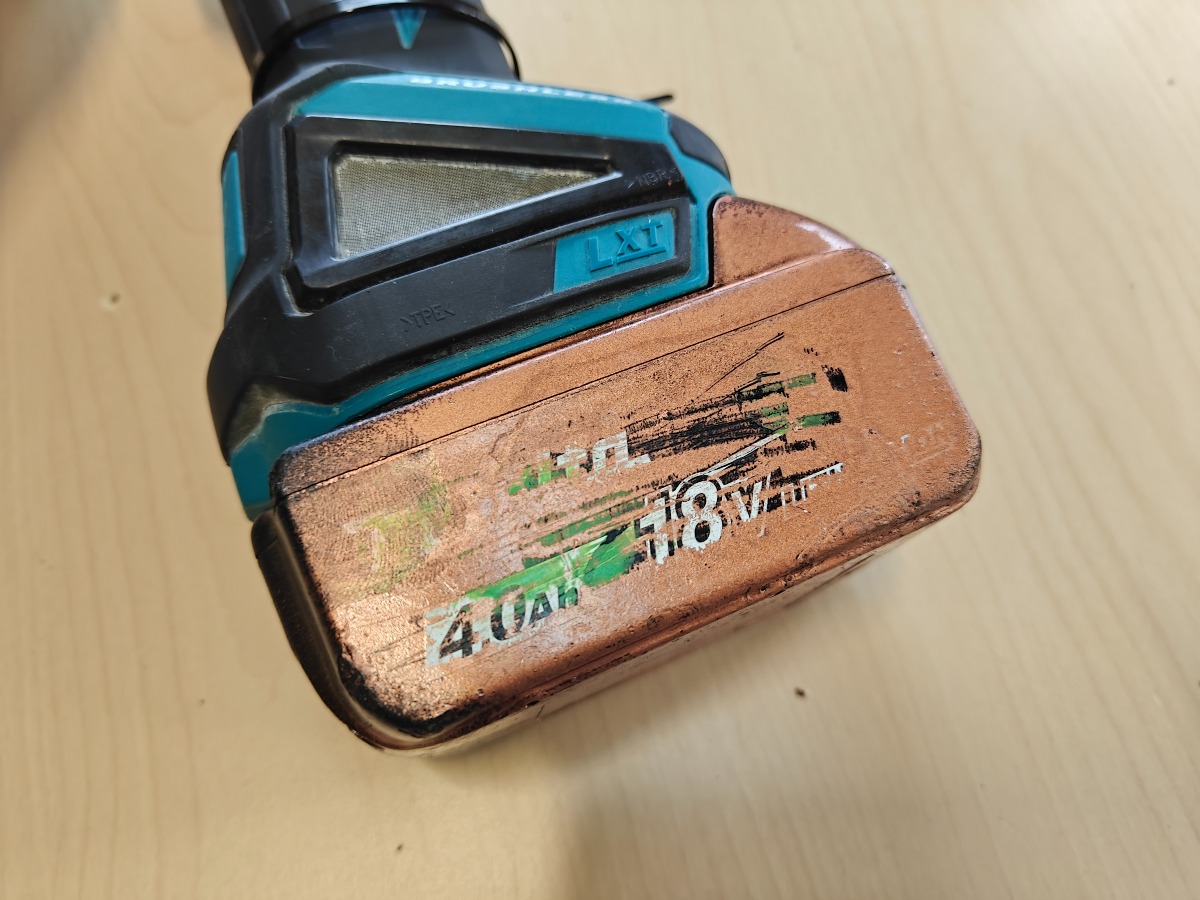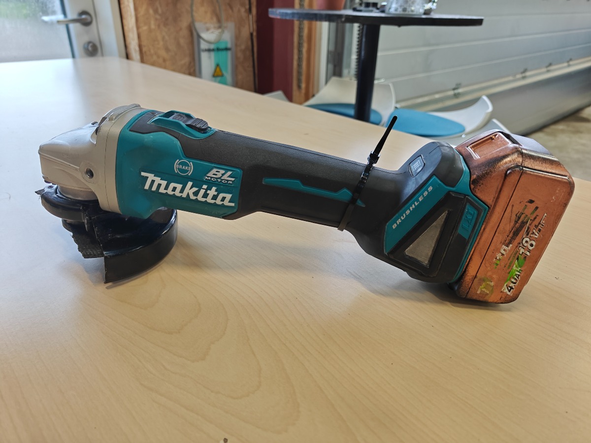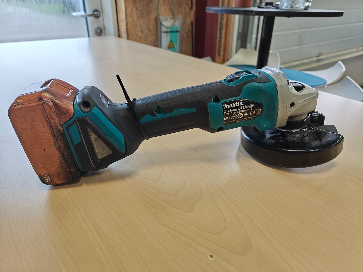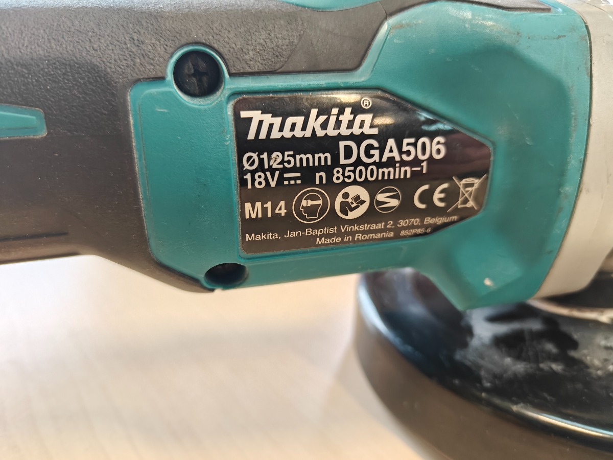 Makita DGA506 Aku vinkelsliber med batteri. Maskinen er med brugsspor og batteriet delvis overmalet. VI garanterer ikke for funktionaliteten.