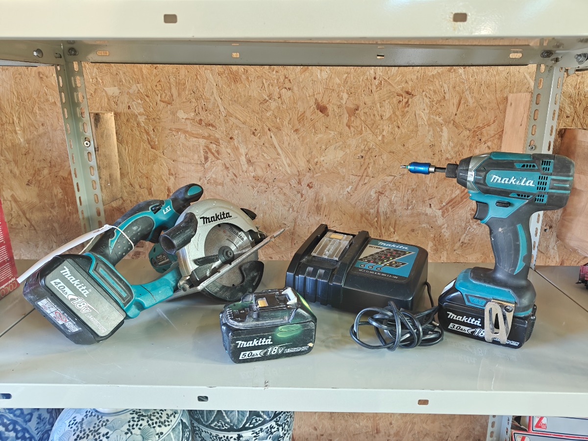 Makita håndværktøj: Makita DTD152 18V LXT slagskruetrækker, Makita DSS501 18V LXT rundsav. Hertil 3 batterier, 3, 4 og 5 Ah samt batterioplader. Delene er brugt og vi garanterer ikke for funktionaliteten.