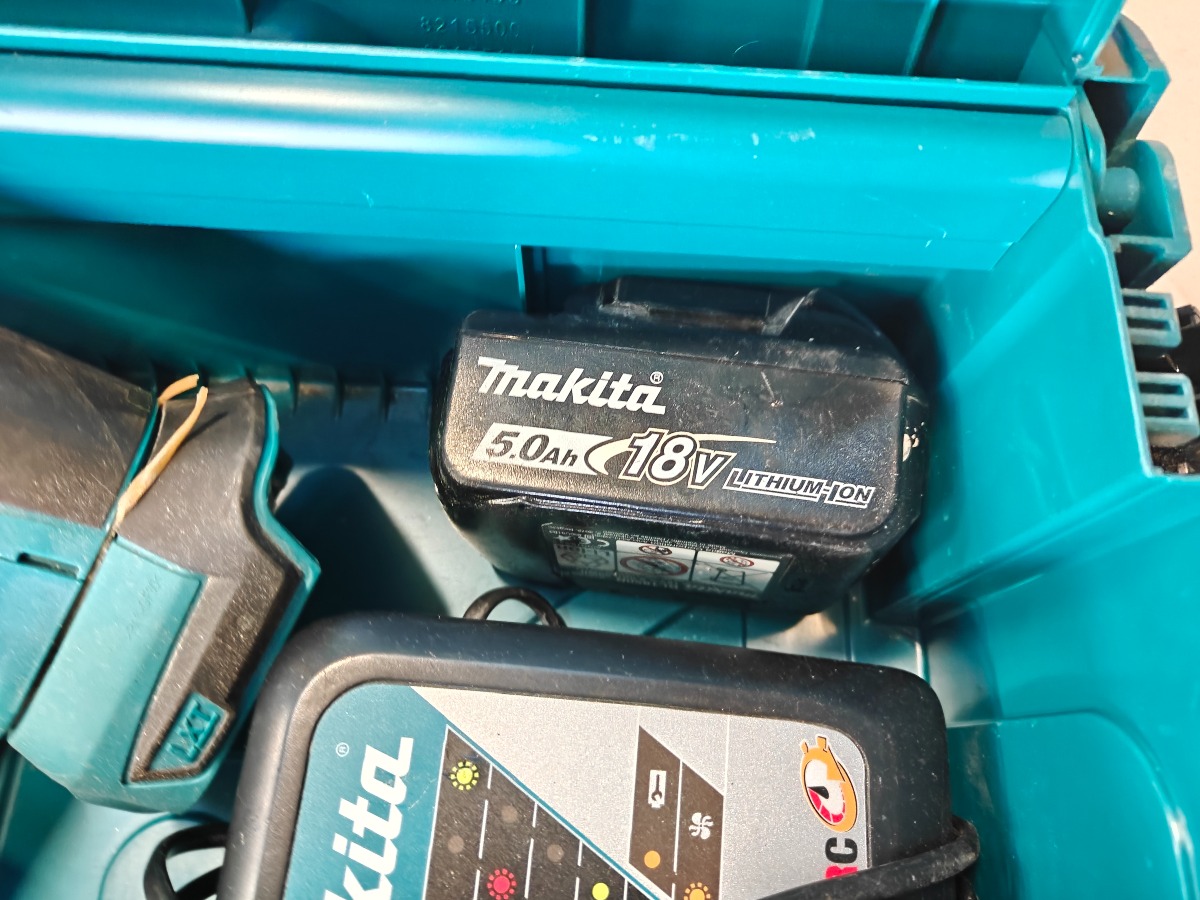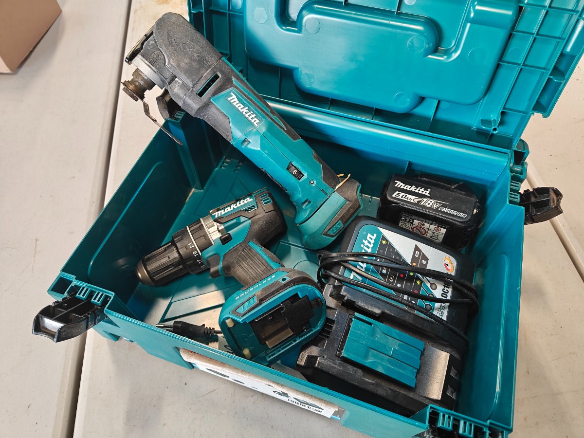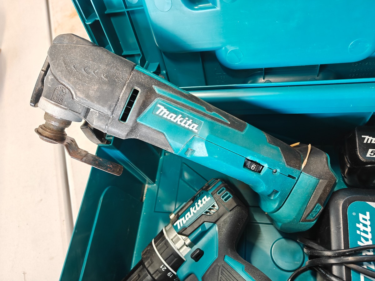 Makita håndværktøj i kuffert. Fincutter DTM51, slagboremaskine DHP484 samt oplader og 5 Ah batteri. Vi garanterer ikke for funktionaliteten.