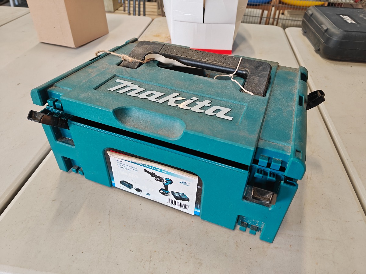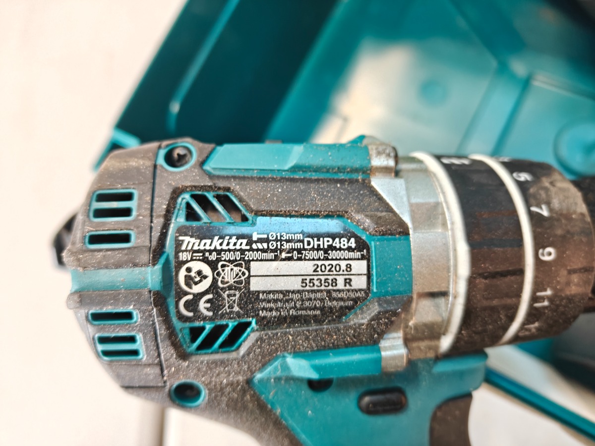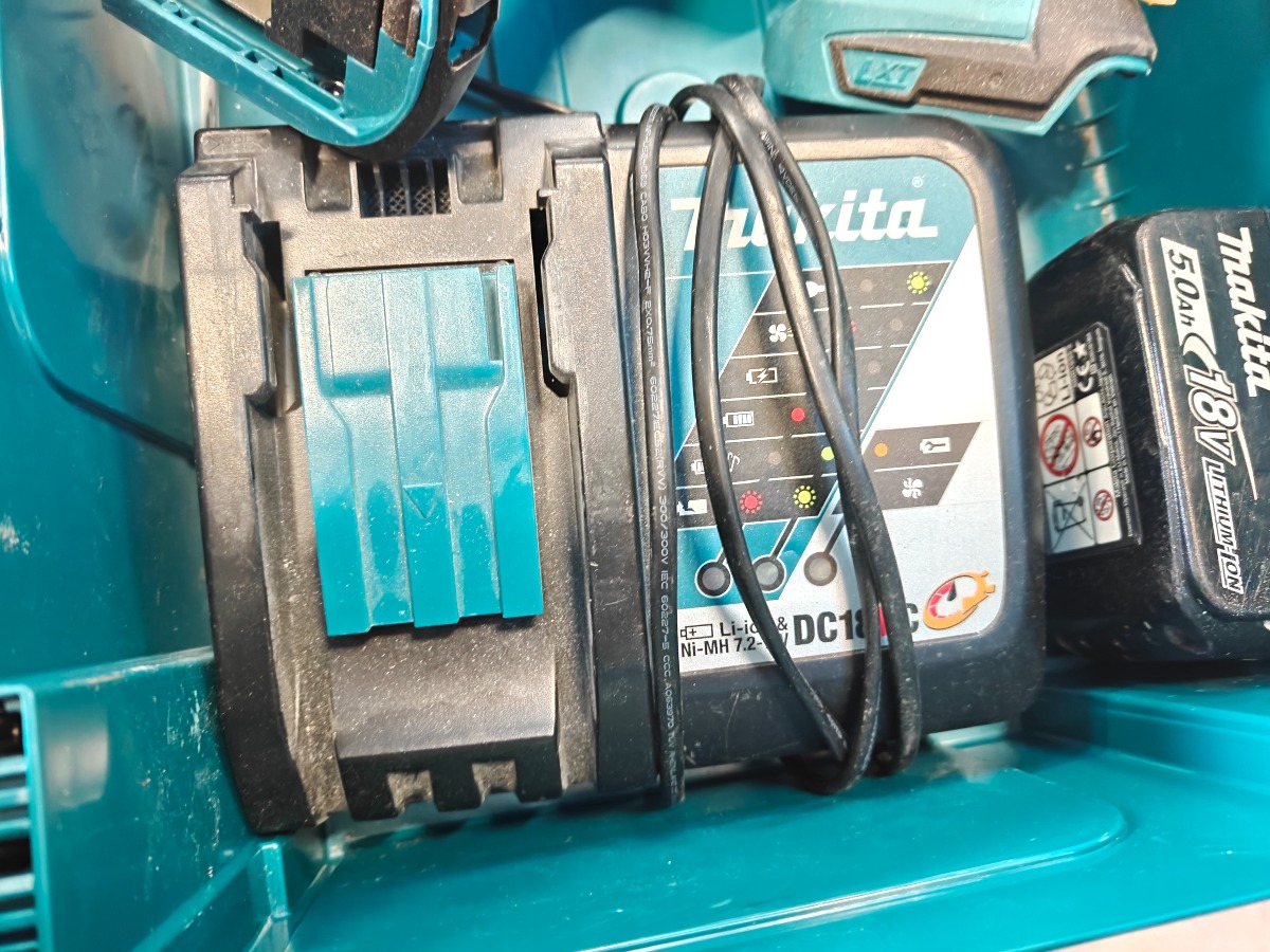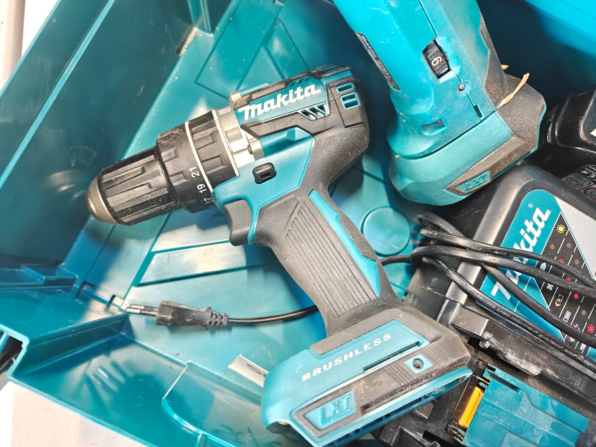 Makita håndværktøj i kuffert. Fincutter DTM51, slagboremaskine DHP484 samt oplader og 5 Ah batteri. Vi garanterer ikke for funktionaliteten.