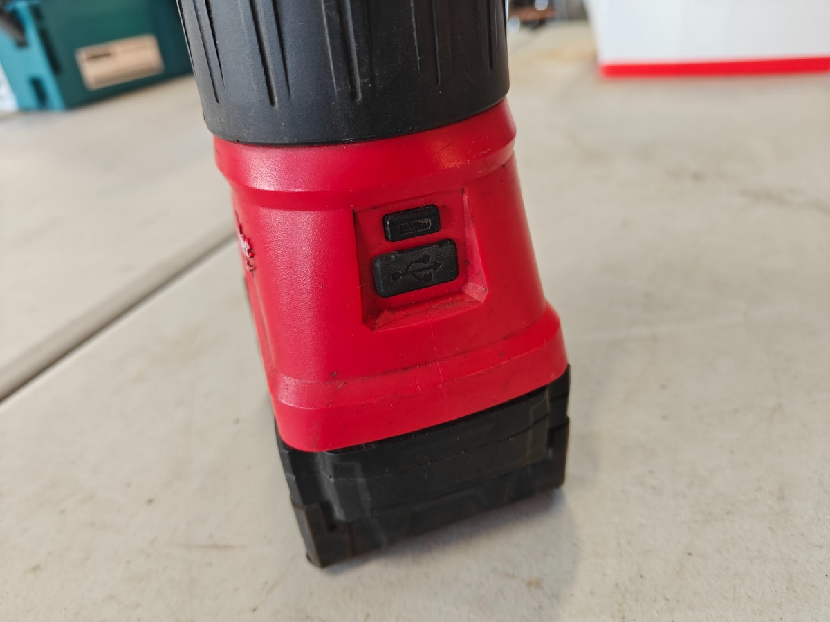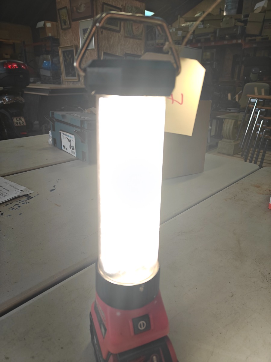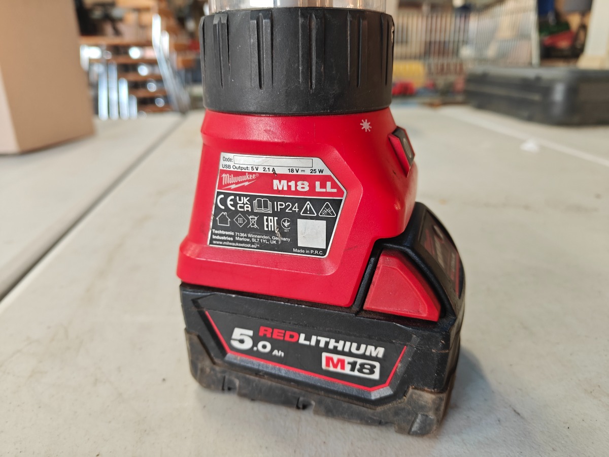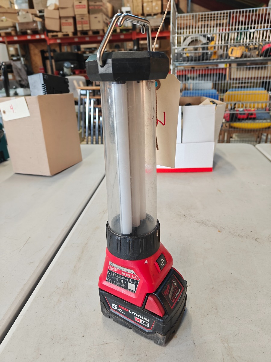 Milwaukee M18 LL arbejdslampe med 5 Ah batteri. Varen er brugt og vi garanterer ikke for funktionaliteten.