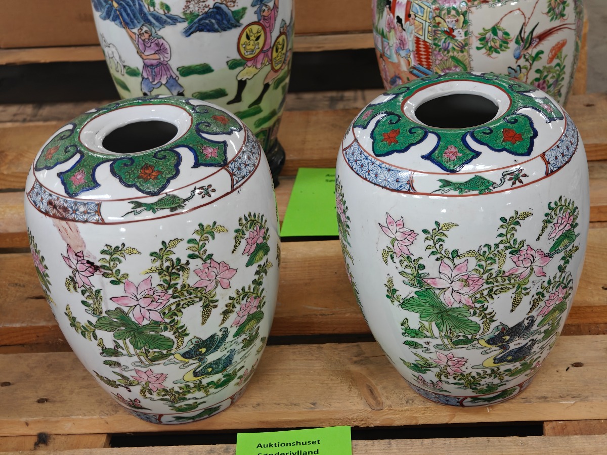 2 stk Kinesiske vaser. Håndmalede. H: ca 30 cm. Oplyst datering fra første halvdel af 1900-tallet.