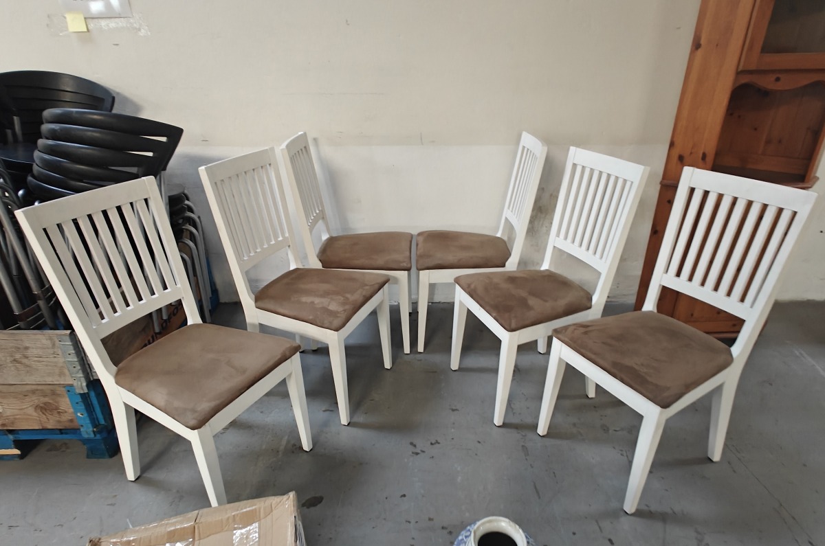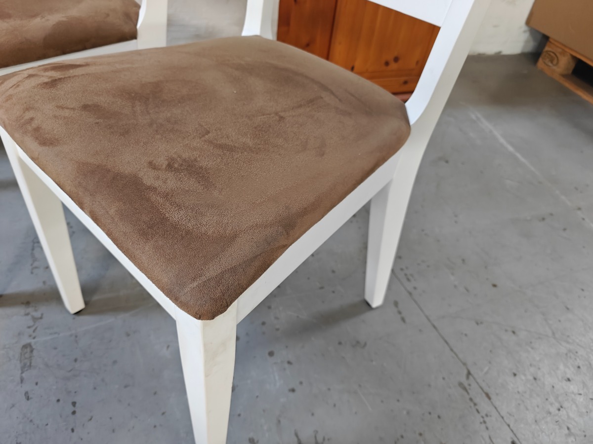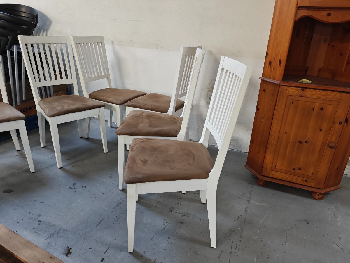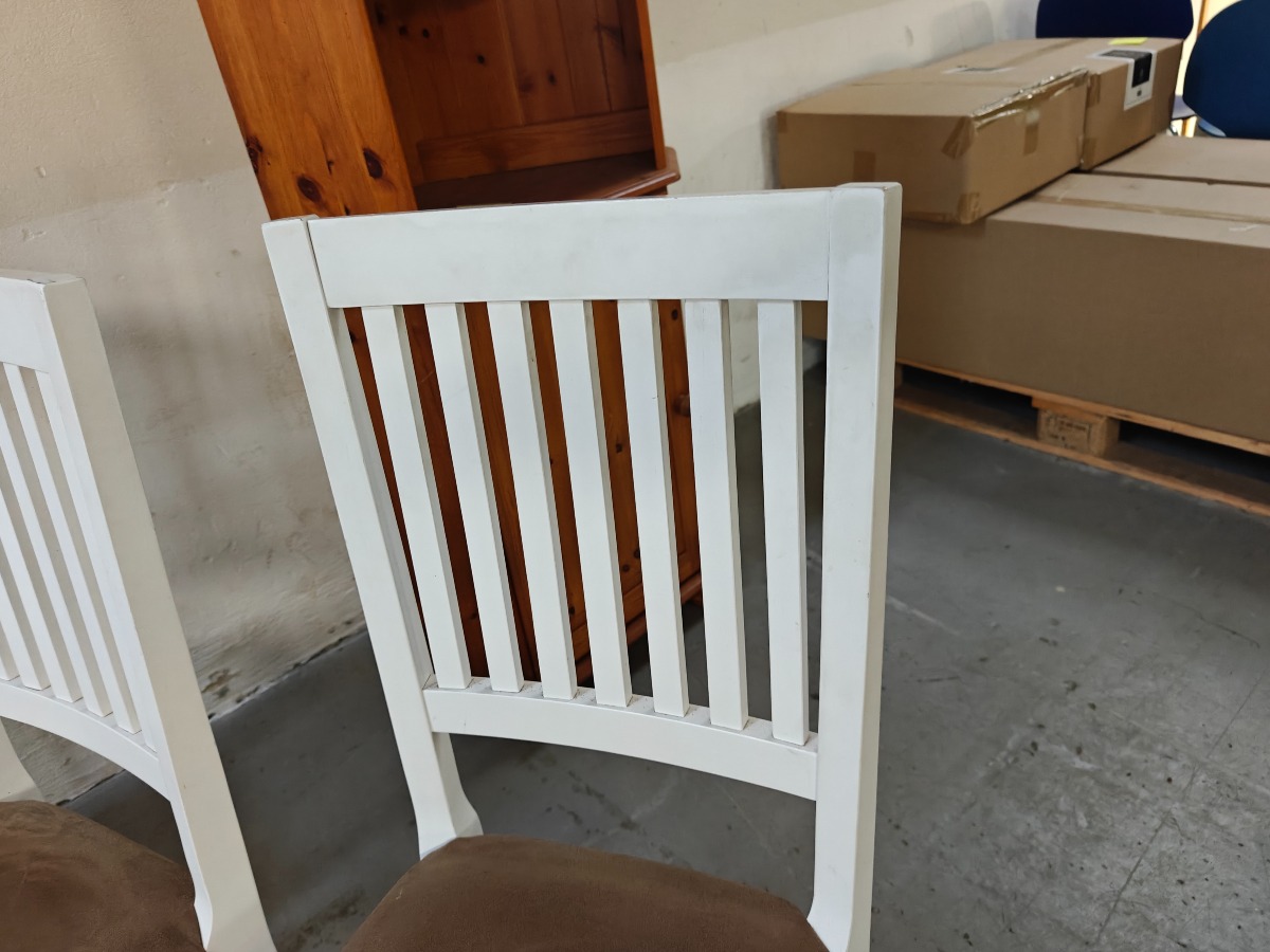 6 Spisebordsstole m/polstrede sæder. Hvidmalet træ. Brugte.
