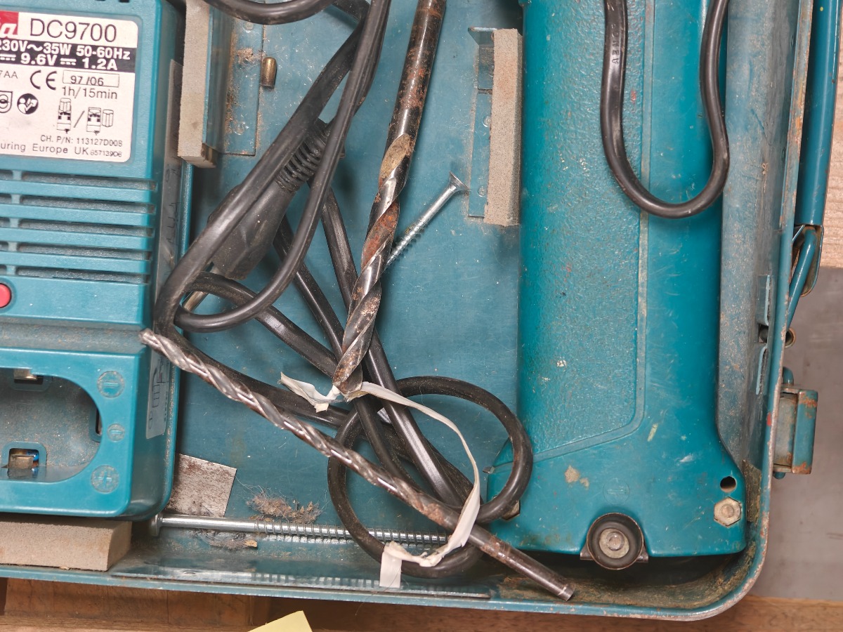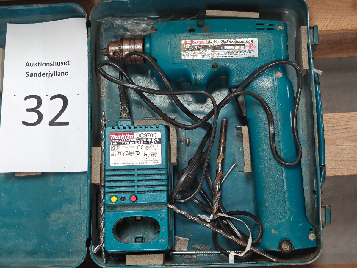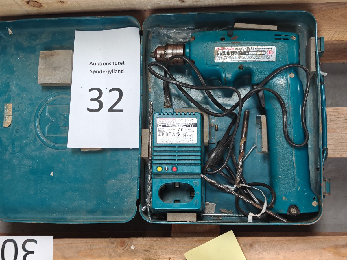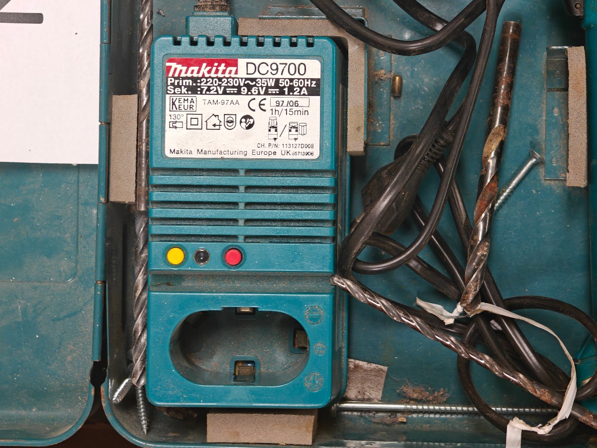 Makita akku-boremaskine i kuffert. Model: 6092D. Lader og div bor medfølger. Brugt.