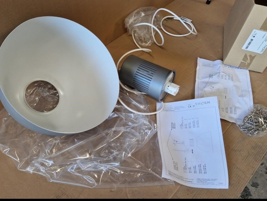 Pendel. Mrk Thorn. Model: Glacier II. Industrielt design. Mål: skærm: Ø 34 cm. Ubrugt, usamlet og i emballage.