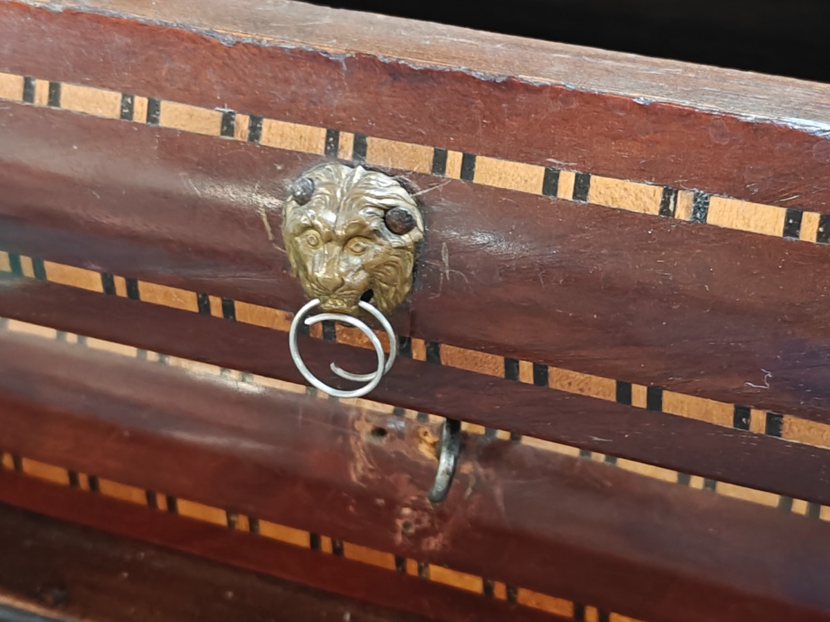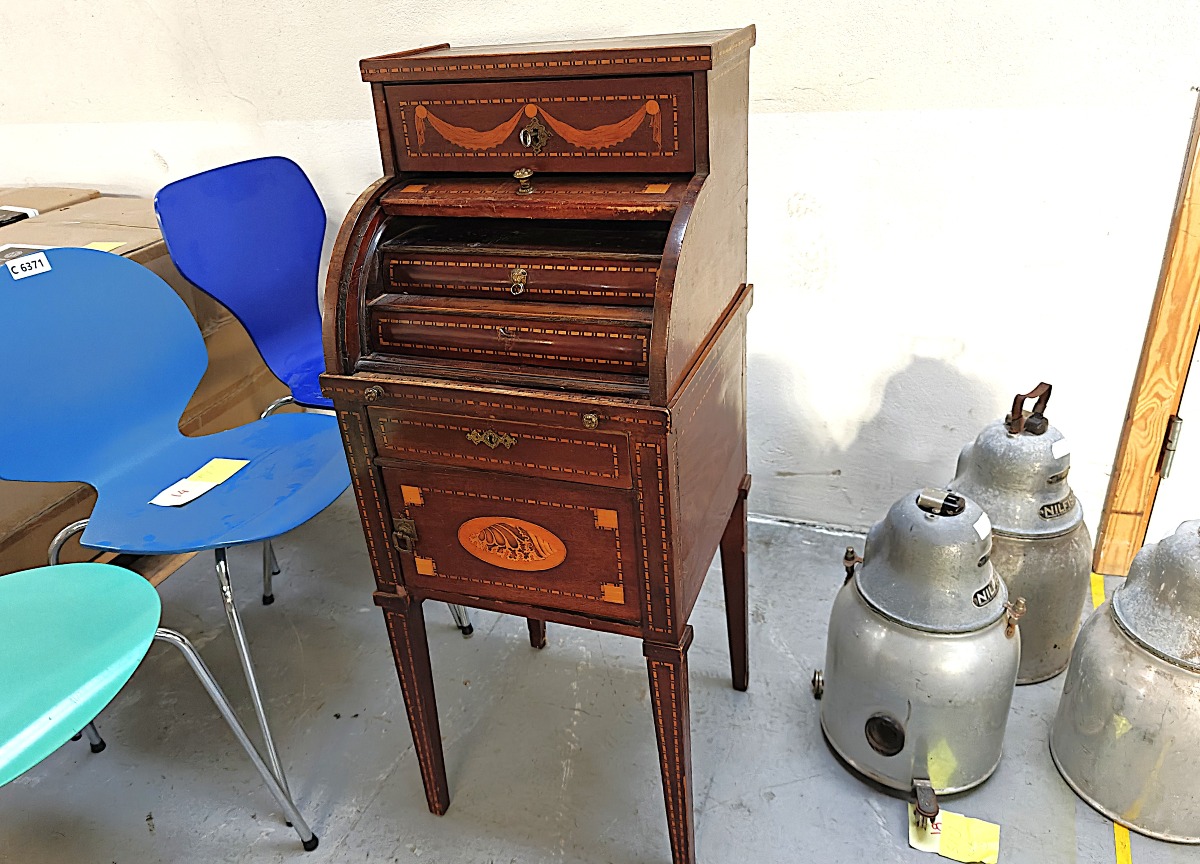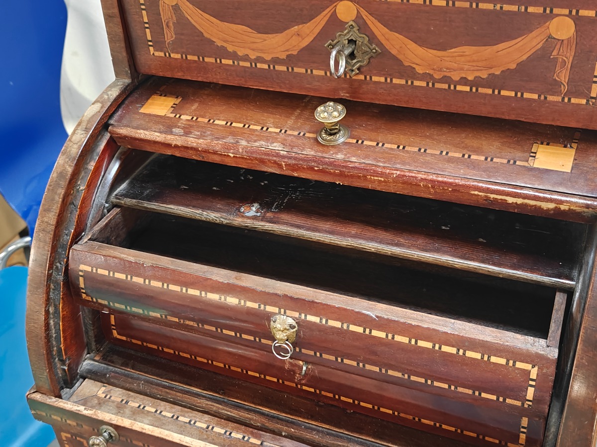 Sekretær/cylinder chatol. Udført m/div. skuffer/rum og mange udsmykkede detaljer. Mål: H: 105 cm. B: 42 cm. D: 40 cm. Brugt.