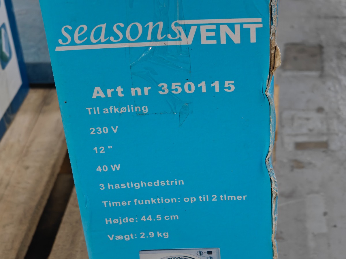 Ventilator. 12". Mrk Seasons Vent. Til afkøling. 230V. 40W. 3 Hastighedstrin og timer funktion. Mål: H: 44.5 cm. Ubrugt og i emballage.