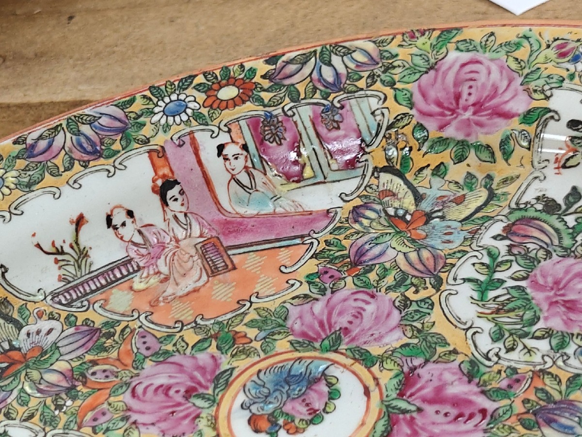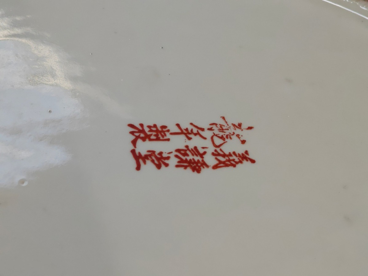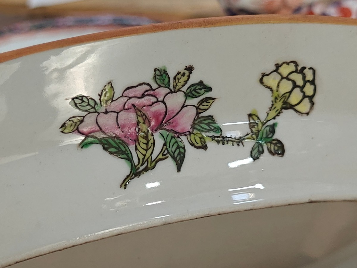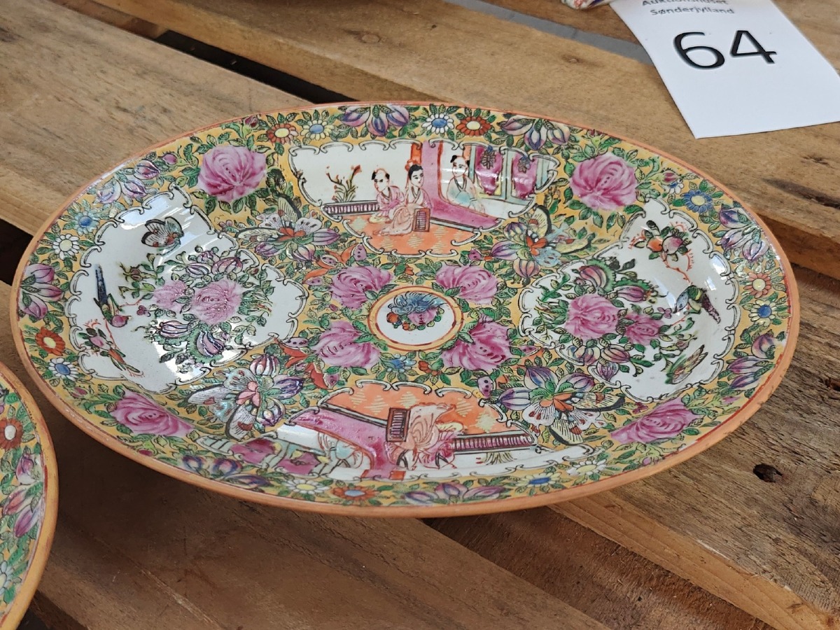 2 Serveringsfade. Håndmalede. Mål: 23 x 29 cm. Oplyst datering fra første halvdel af 1900-tallet.