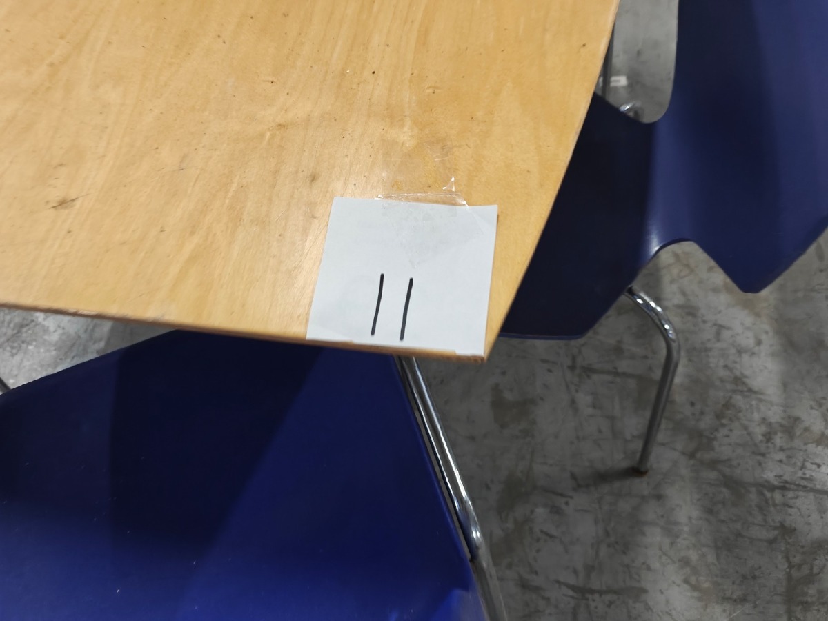 Bord m/6 stole. Spisebord: Bådformet m/søjlefod. Mål: L: 130 cm. B: 90 cm. H: 72 cm. 4 Blå skalstole m/kromfarvet stel. 2 Blå stole m/plast skålesæde og kromfarvet stel. Brugt.