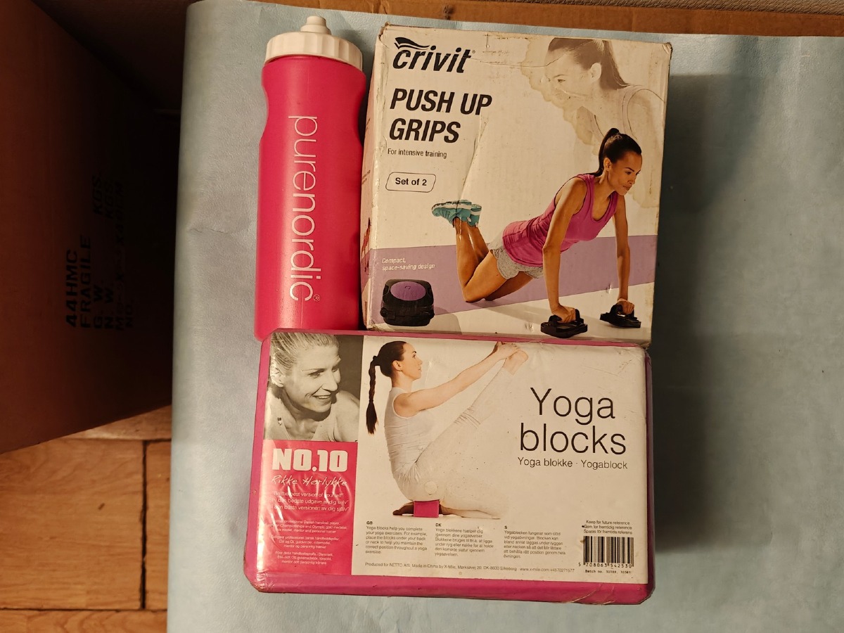 Fitness: Yogablokke af Rikke Hørlykke, Push up grips Mrk Crivit & drikkedunk Mrk Pure Nordic. Ubrugt. MOMSFRI.