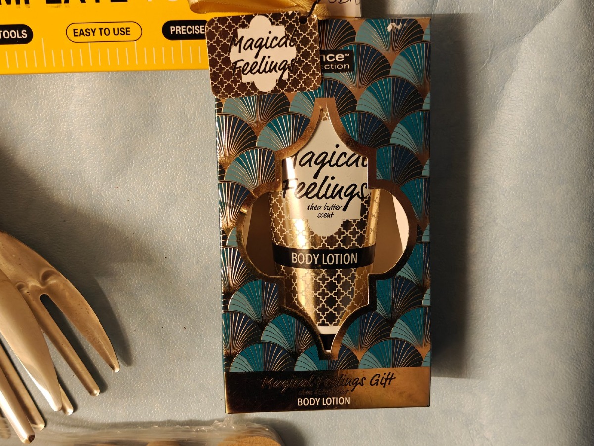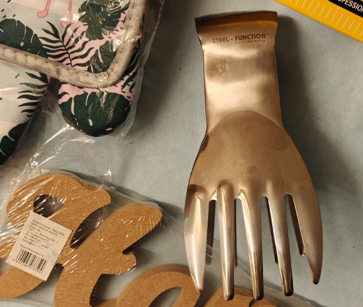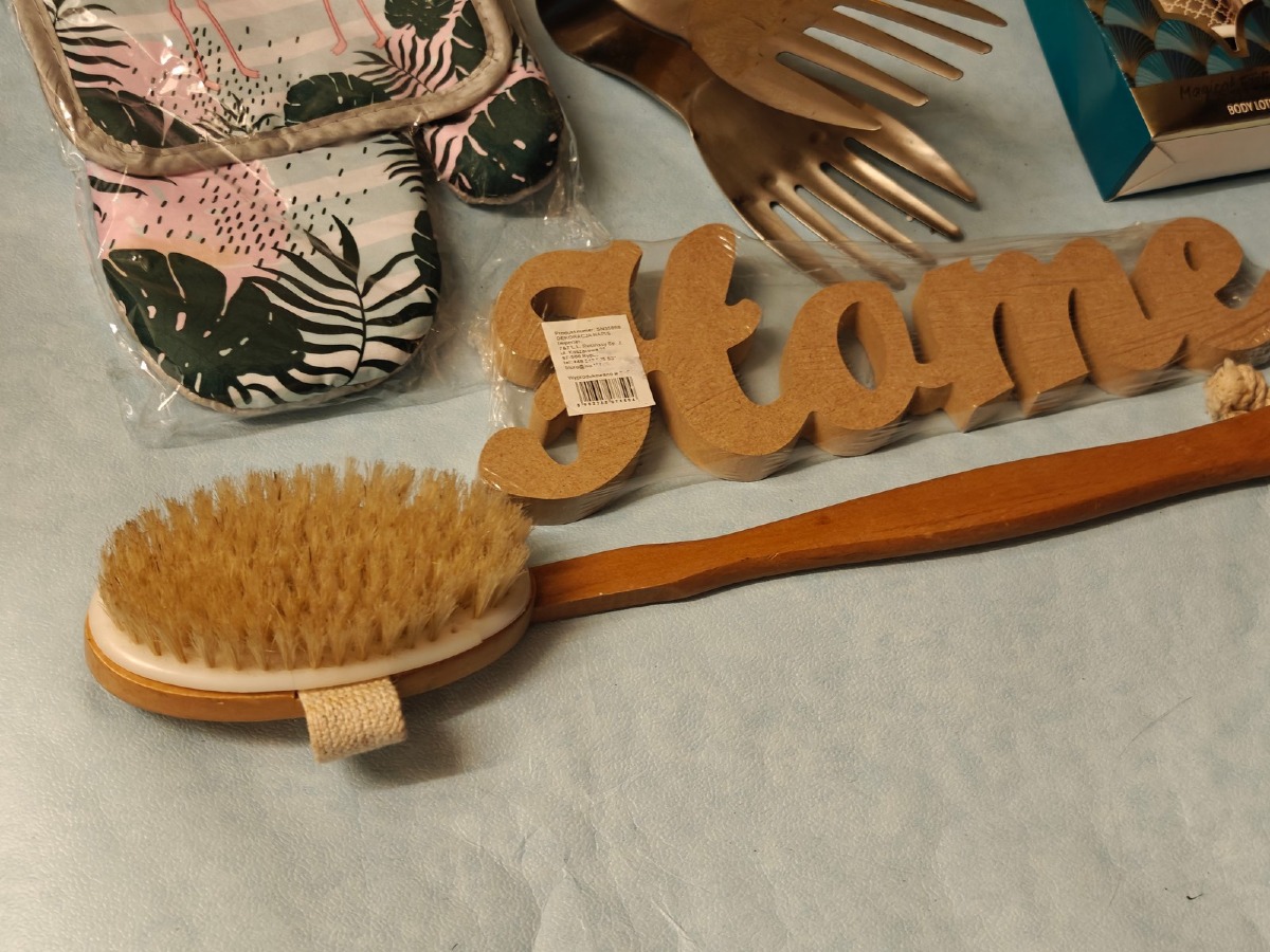 Gave-lot: Salathånd. Mrk: Steel- Function Of Scandinavia. Ovnhandske & grydelap m/motiver, 'Home' skilt. Wellness børste. Body Lotion i gaveæske 'Magical Feelings' Mrk Sence Collection  & måleværktøj. Ubrugt. MOMSFRI.