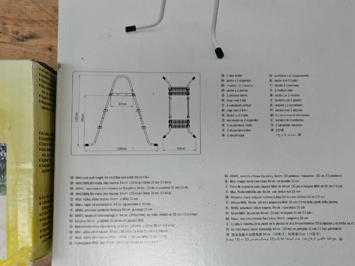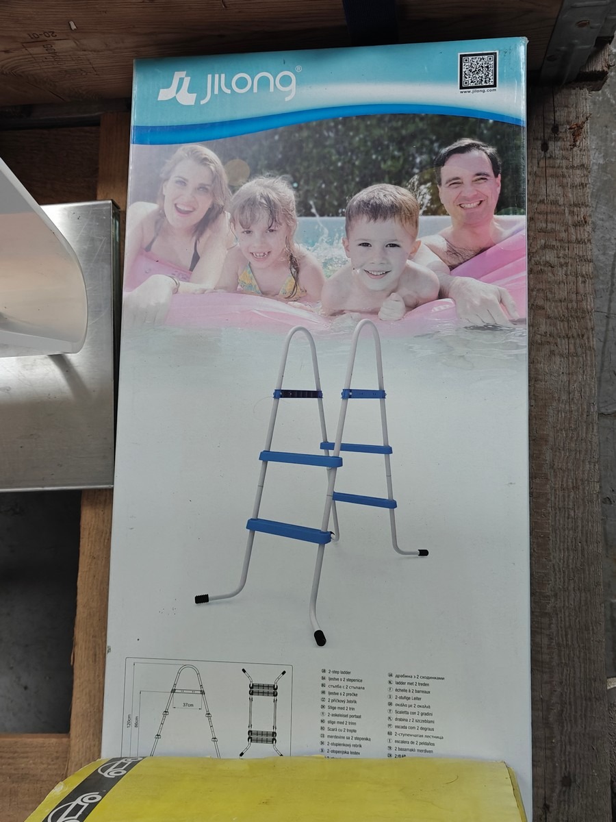 Helgarage & poolstige. Helgarage t/bil. Mrk Satex. Mørkeblå. Str: Small ( 433 x 171 x 119 cm. Poolstige m/2 trin. (dobbelt-sidet). Mrk JiLong. Mål: Totalhøjde: 120 cm. B: (bund) 120 cm. Ubrugt og i emballage. MOMSFRI.