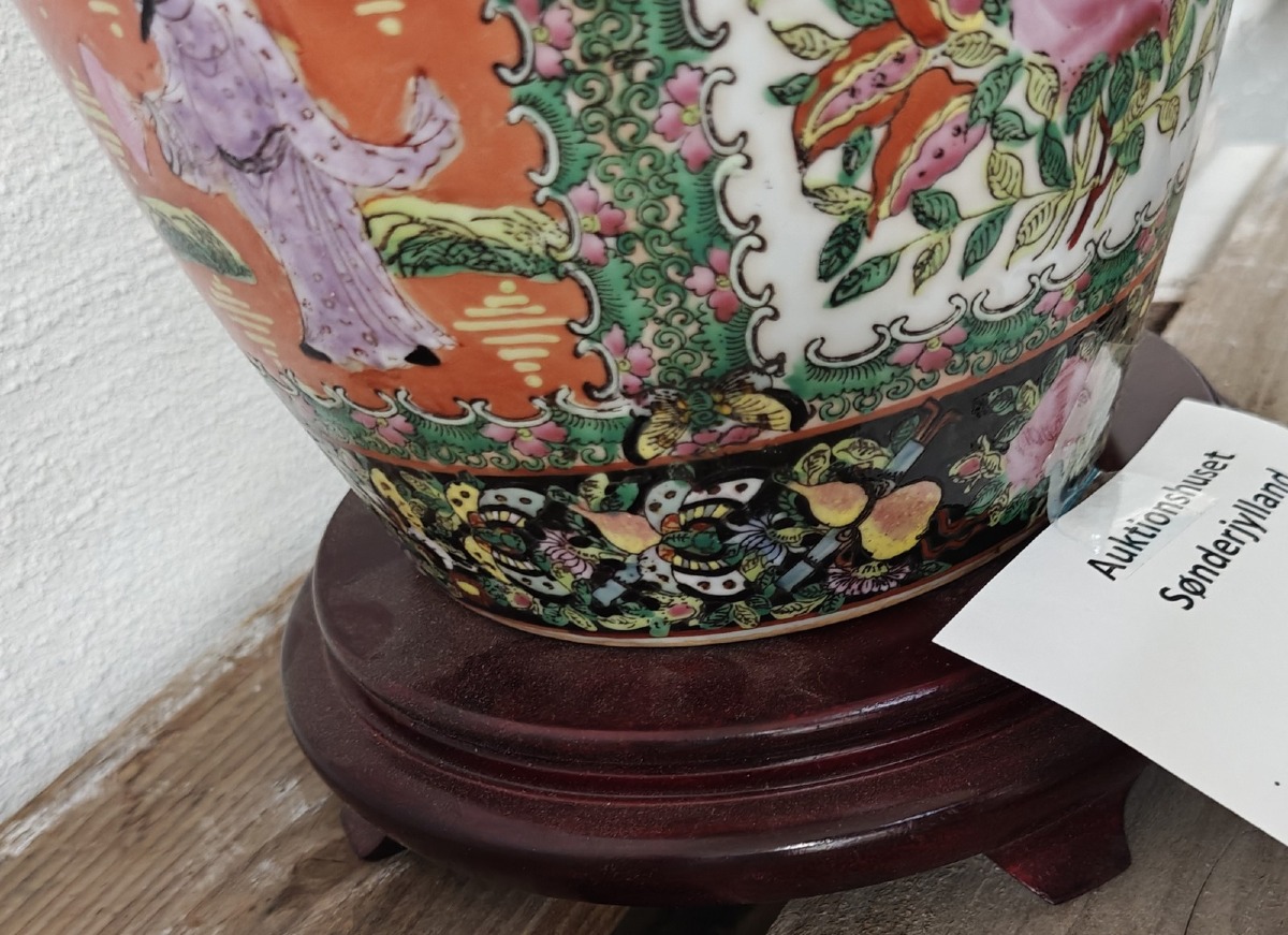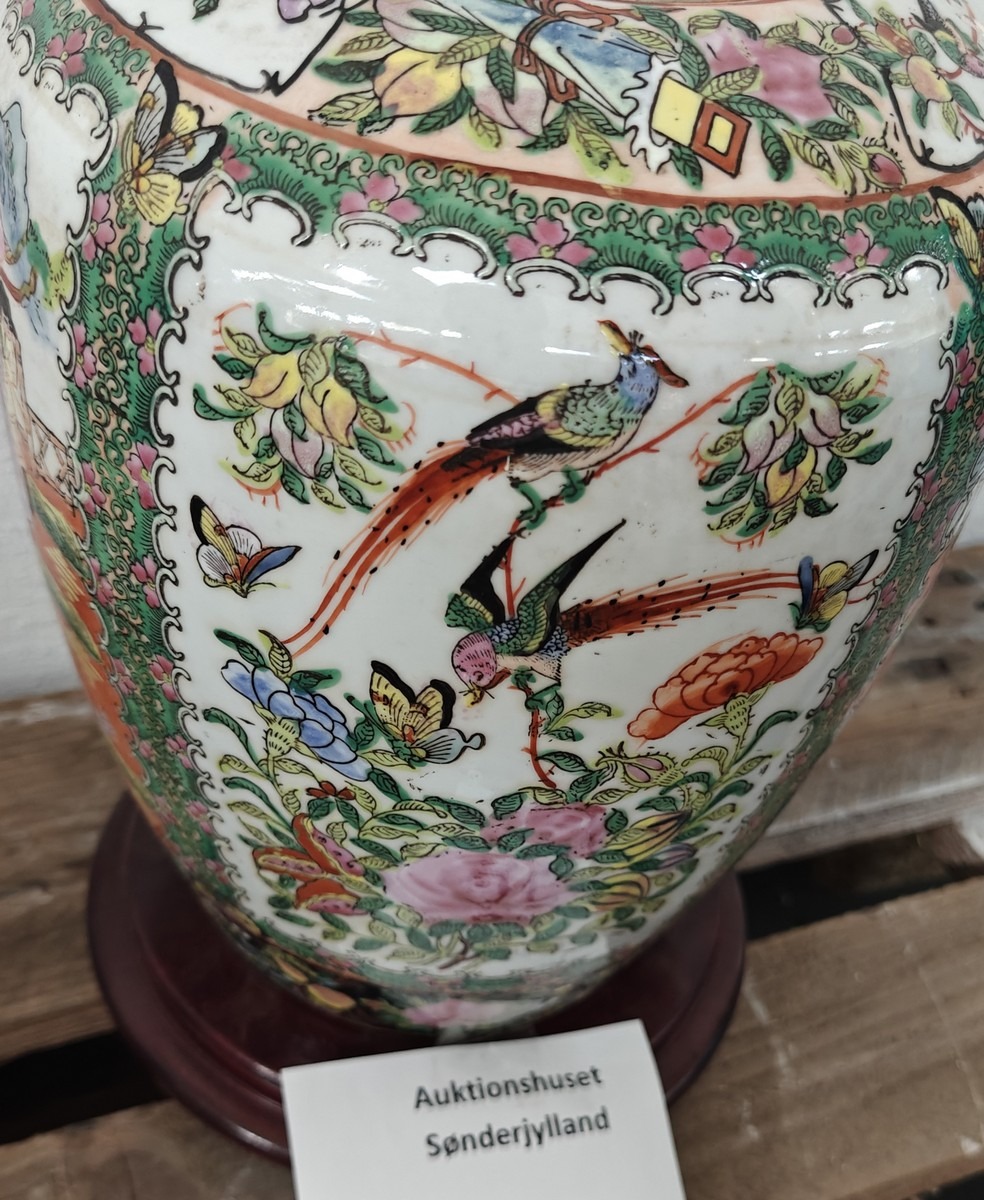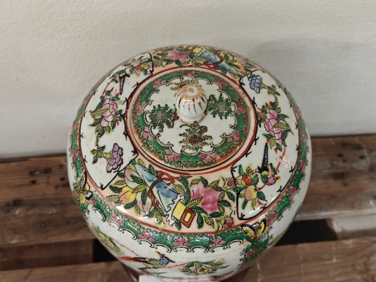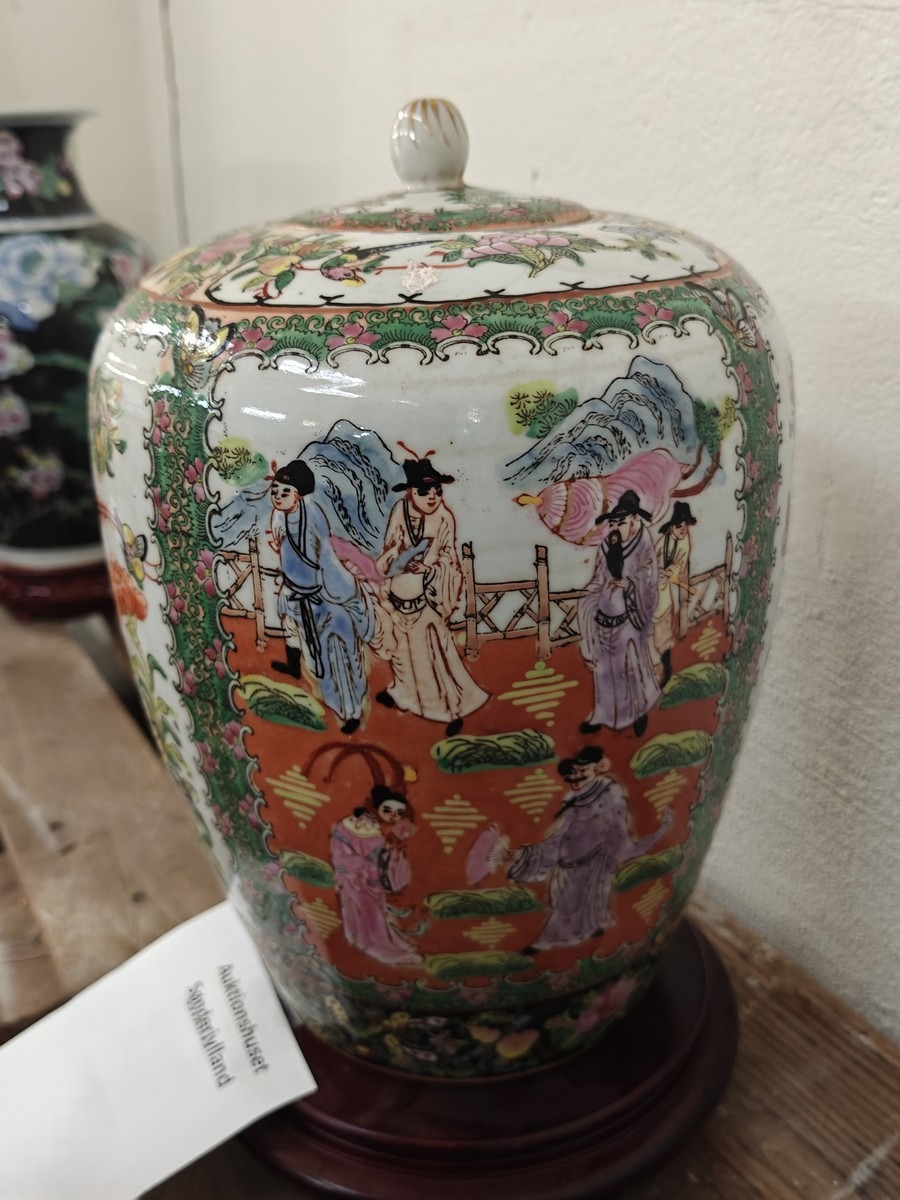 Kinesisk krukke m/låg incl opsats. Håndmalet. H: 32 cm. Oplyst datering fra første halvdel af 1900-tallet.