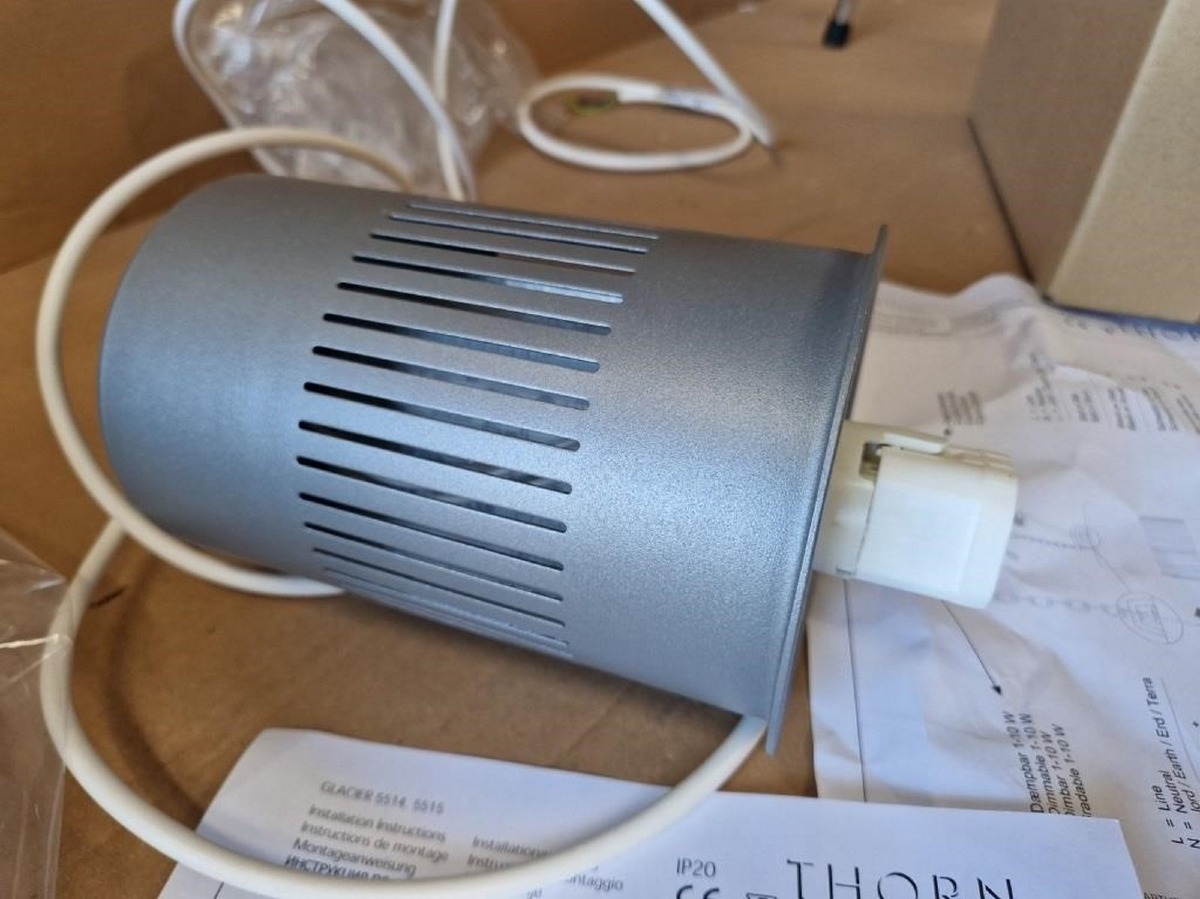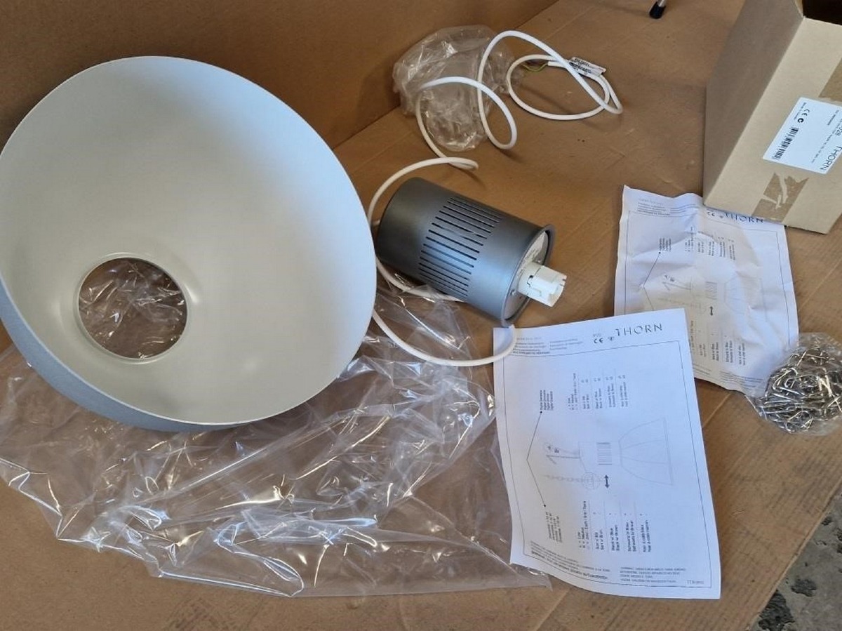 Pendel. Mrk Thorn. Model: Glacier II. Industrielt design. Mål: skærm: Ø 34 cm. Ubrugt, usamlet og i emballage. MOMSFRI