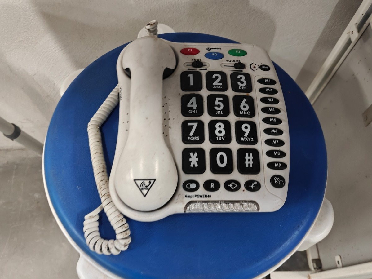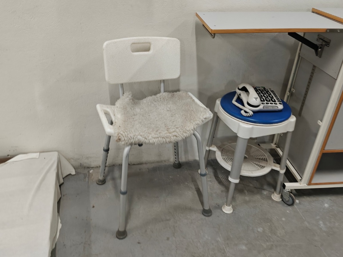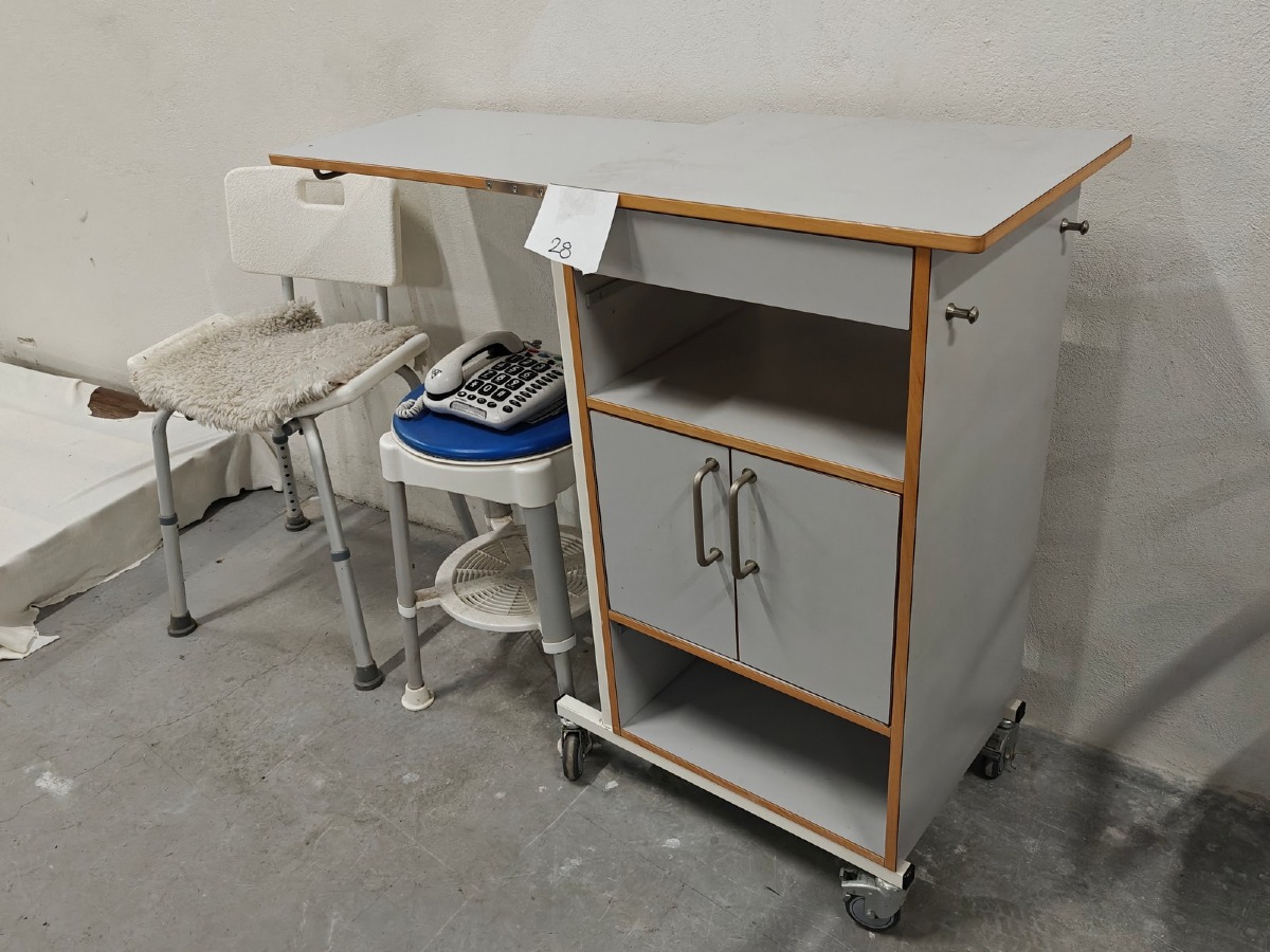 Sengebord & hjælpemidler: Badestol, skammel og telefon m/store taster. Brugt.