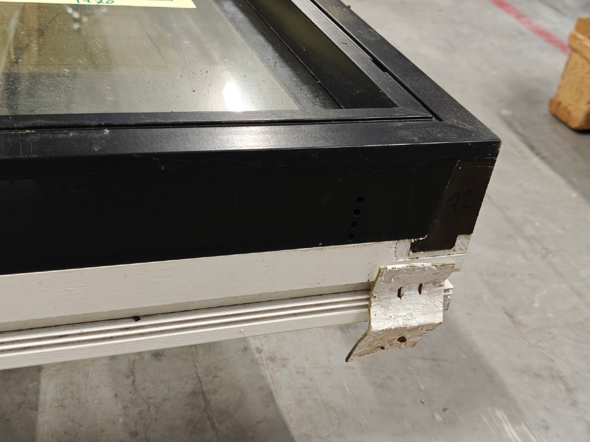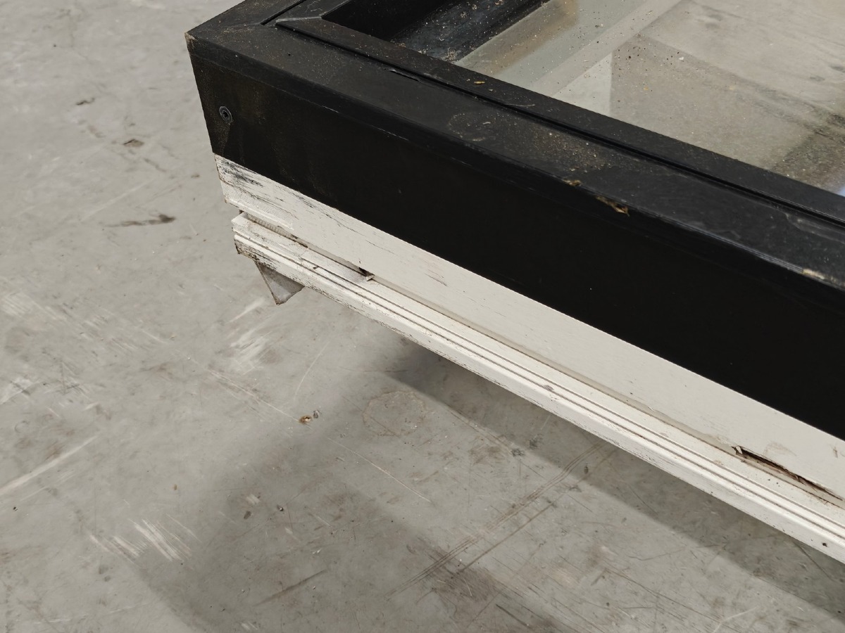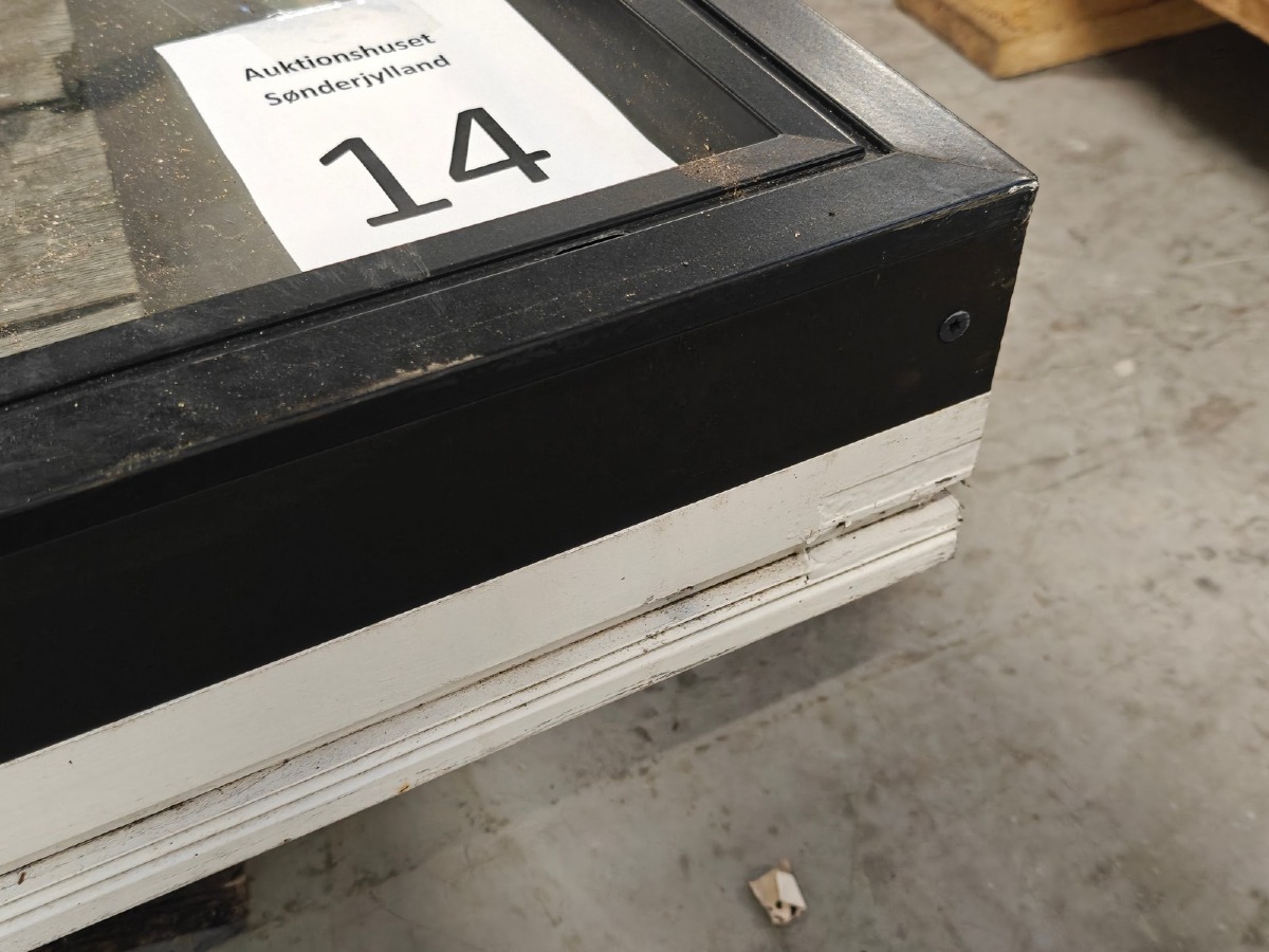 Skråtstillet  vinduesparti m/2 fag. Sortmalet. Mål: H: (v.side) 147 cm. H: (h. Side) 84.5 cm. B: (bund) 133.5 cm. B: (top) 147.5 cm.