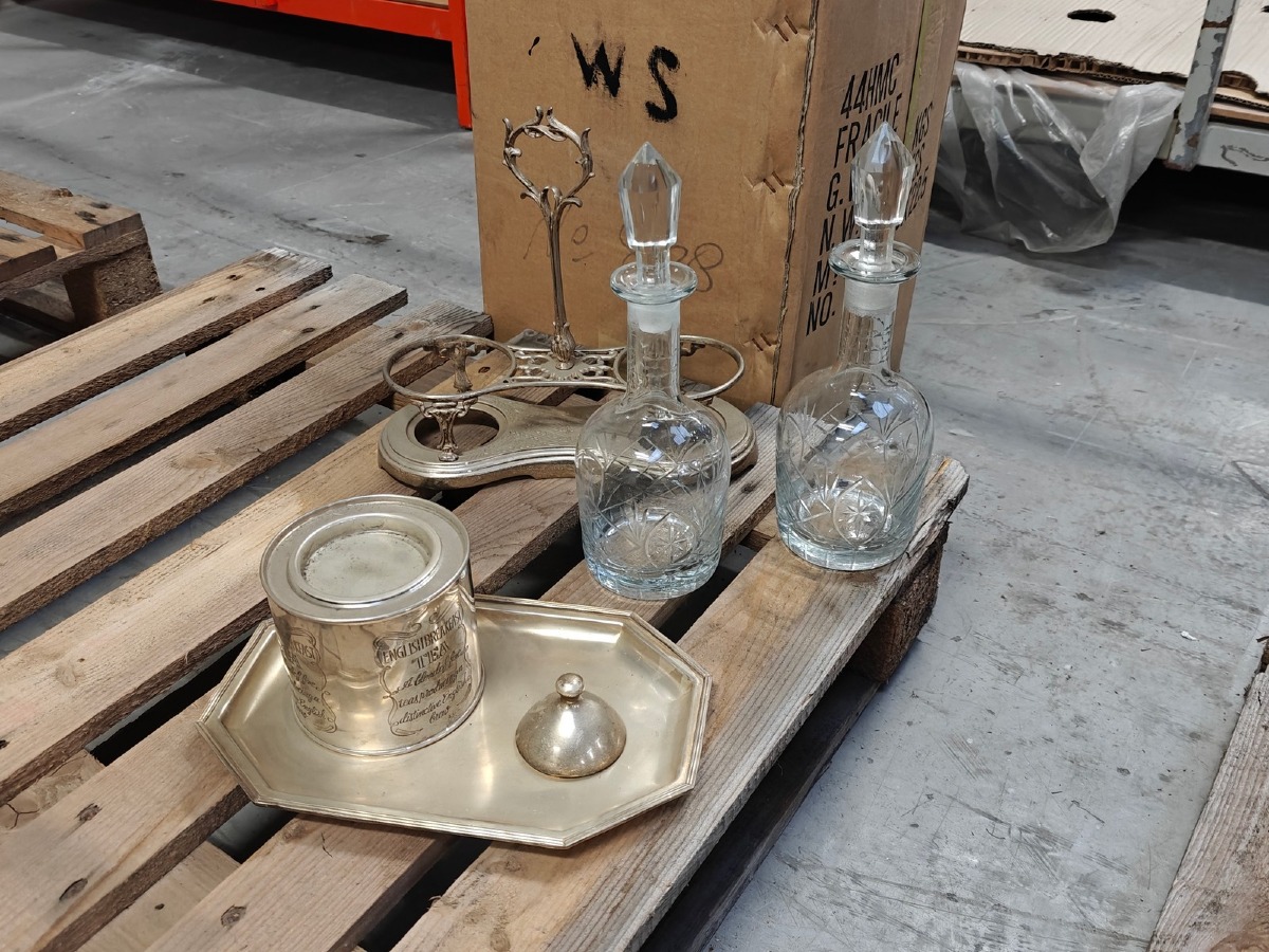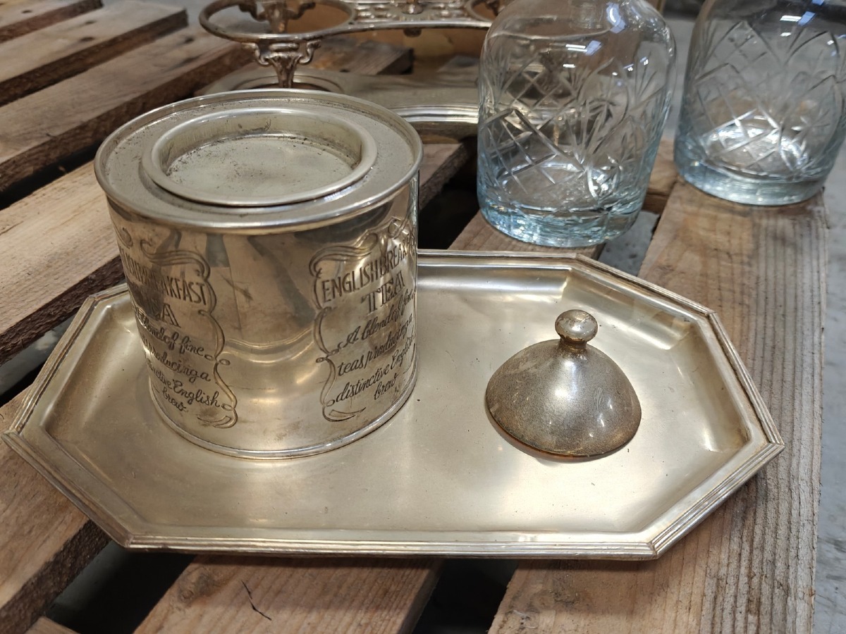 Stativ med 2 flasker/karafler & bakke m/thedåse.