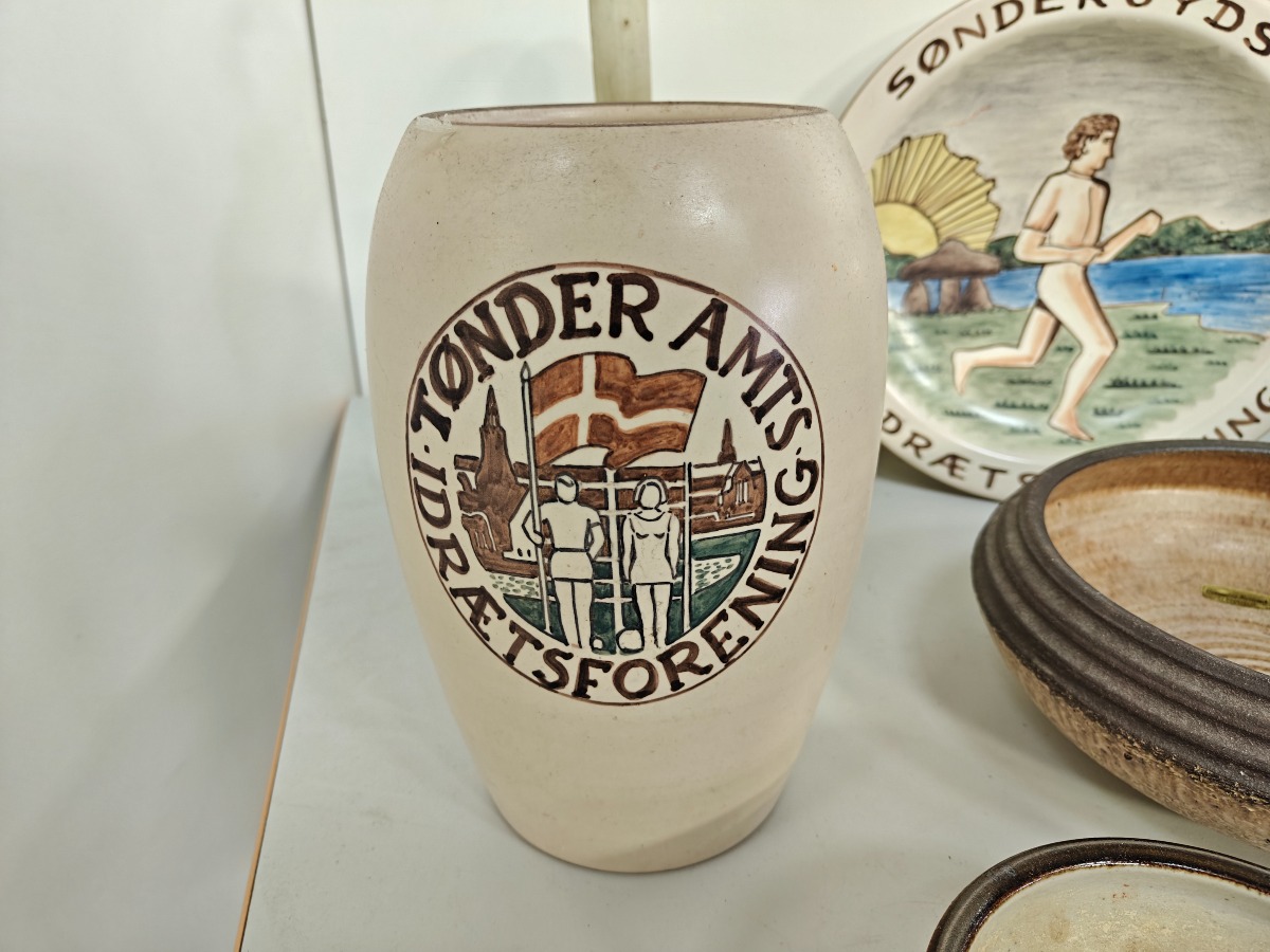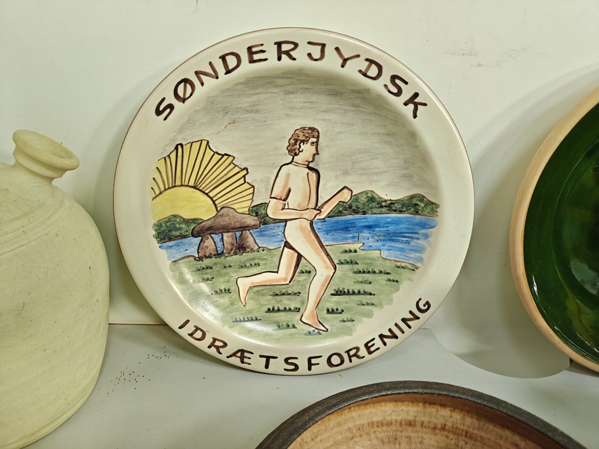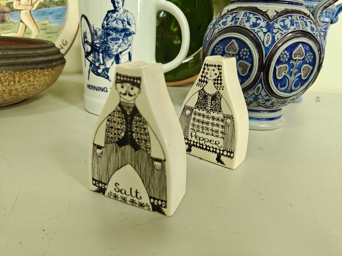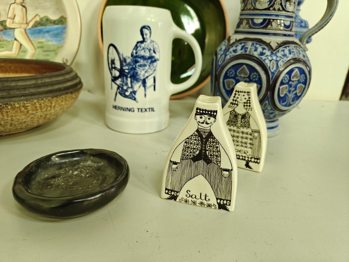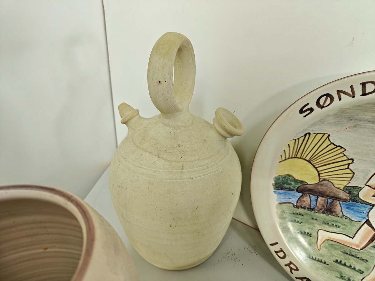 Dele keramik, lertøj m.m. mange forskellige kunstnere. Greb på saltglaserede kande med rep.