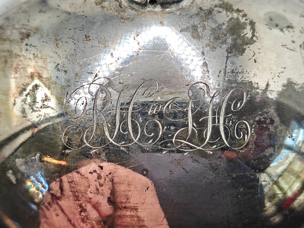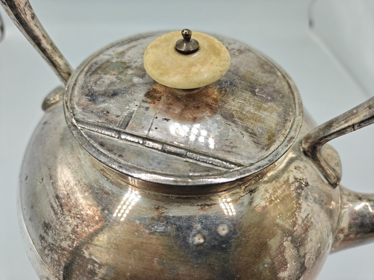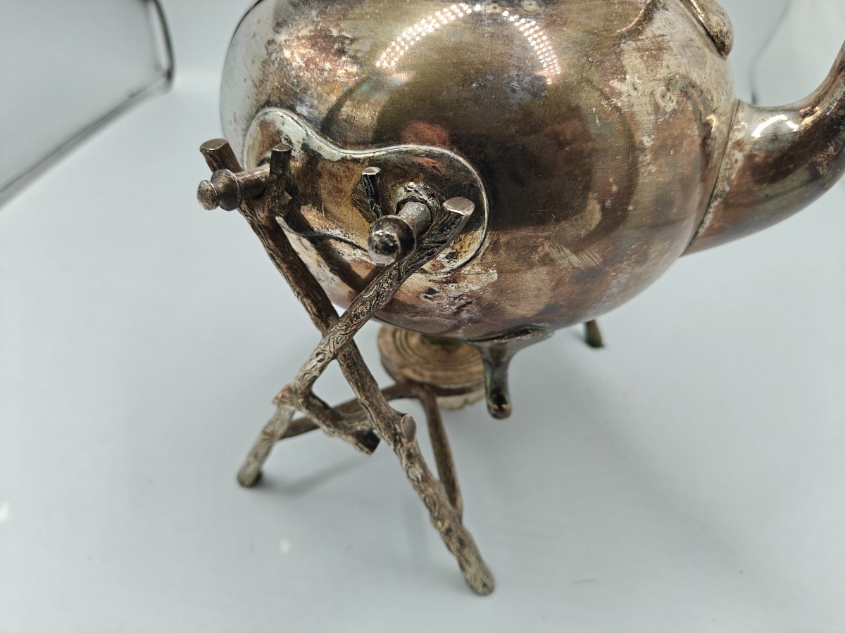 Engelsk spirit kedel af sølvplet. Kerdelstand med brænder i organisk form. Tydelige stempler i bunden. Gravering med initialer med dedikation.