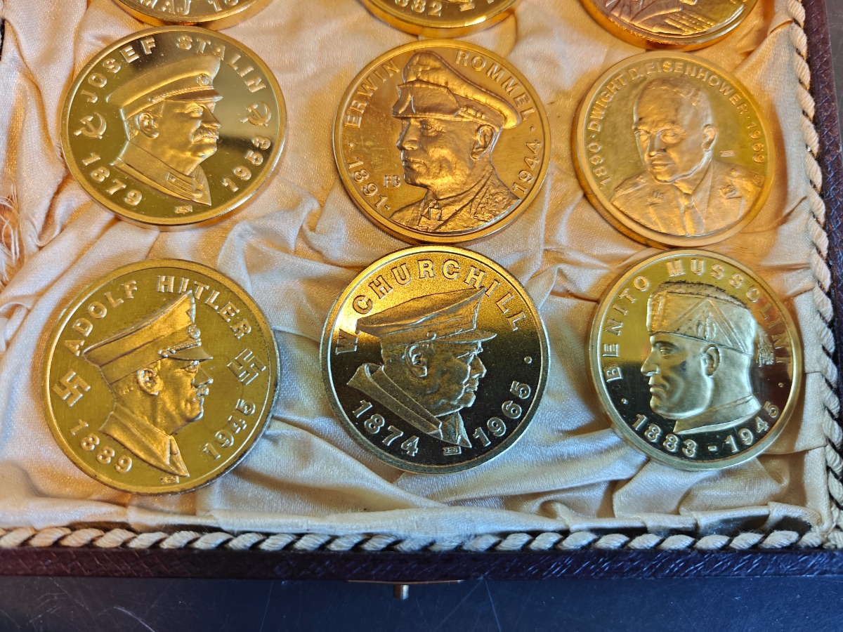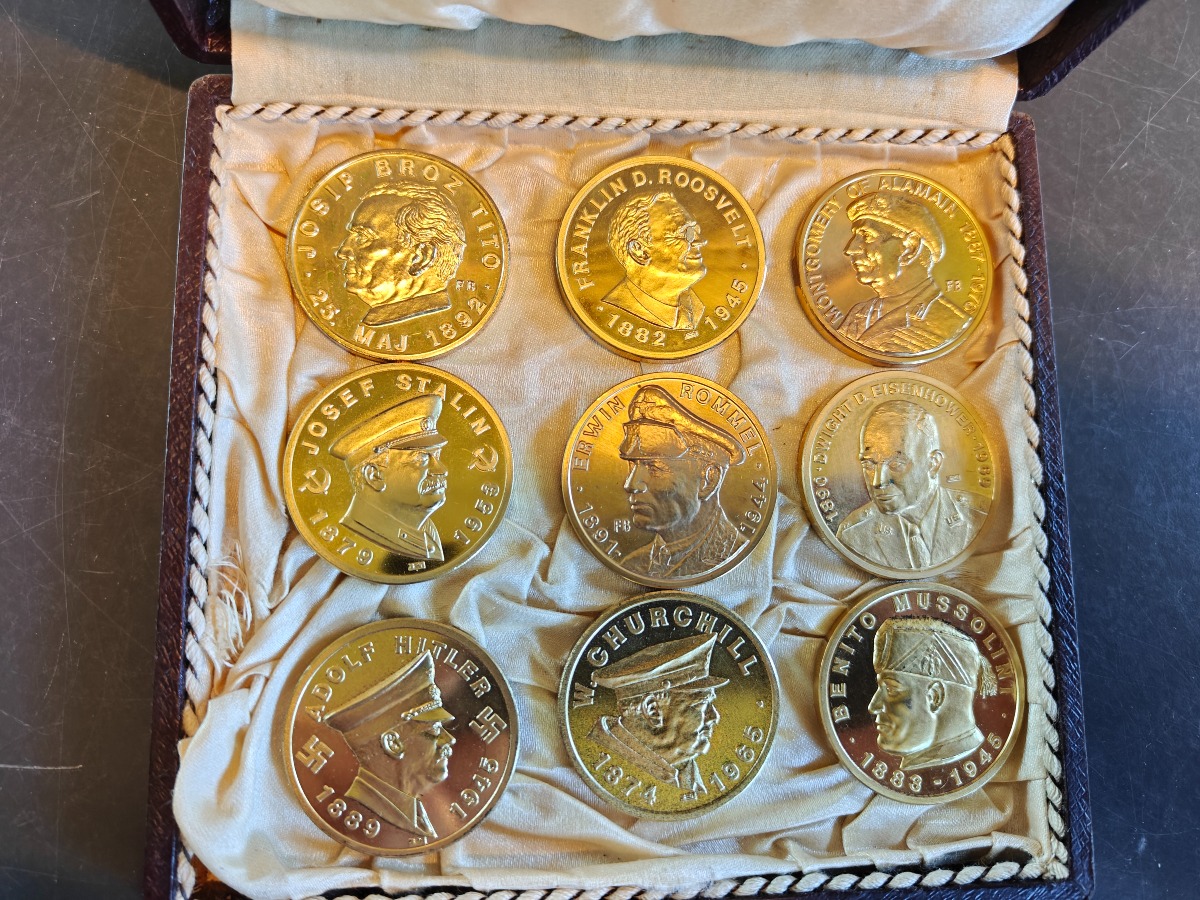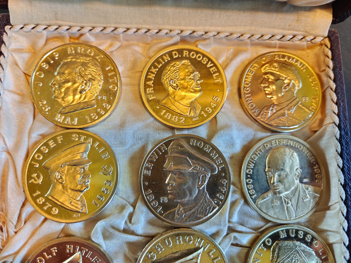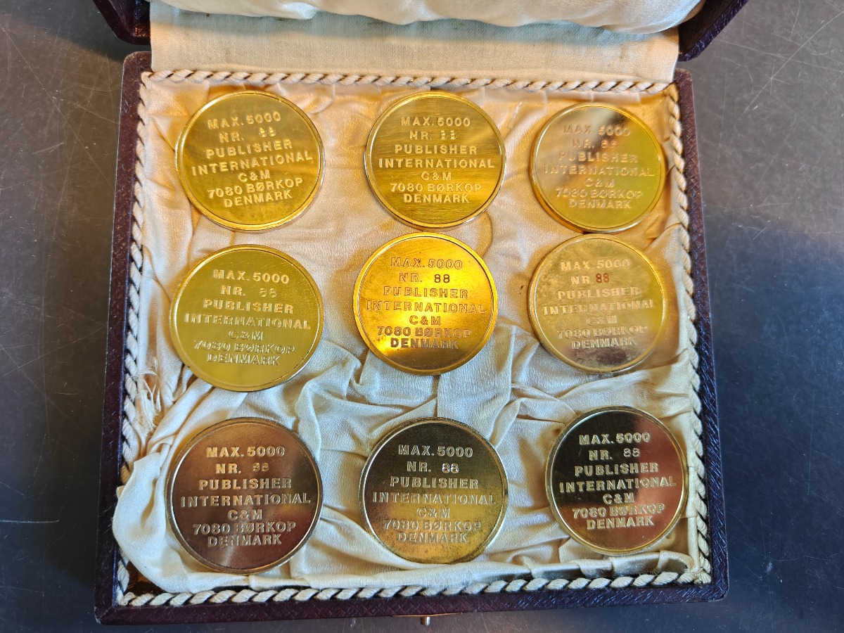 Erindringsmedaljer for ledere under 2. verdenskrig. 9 stk. i æske. Alle er nr. 88/5000. Fremstilllet af Publisher International C&M i Børkop.