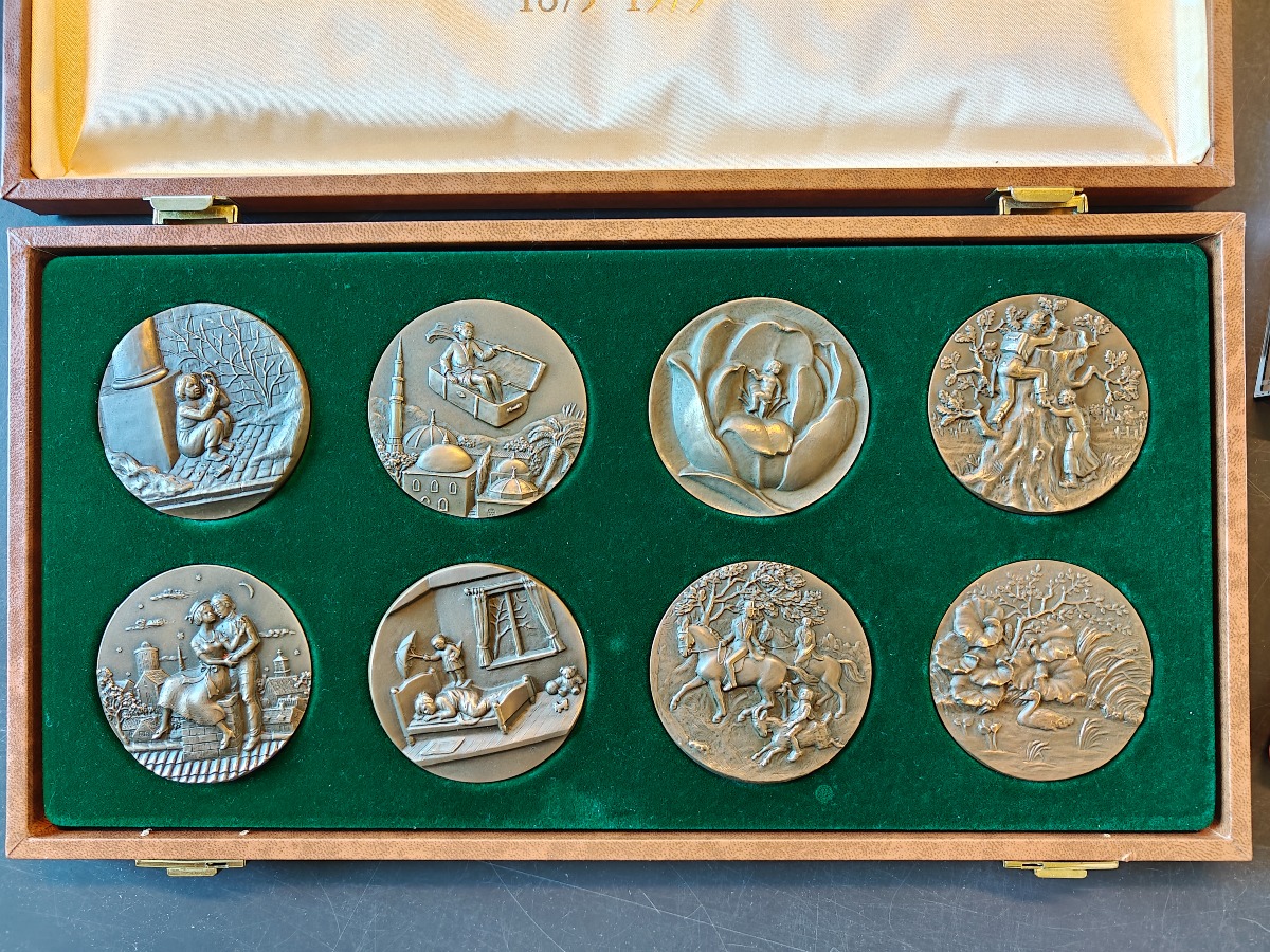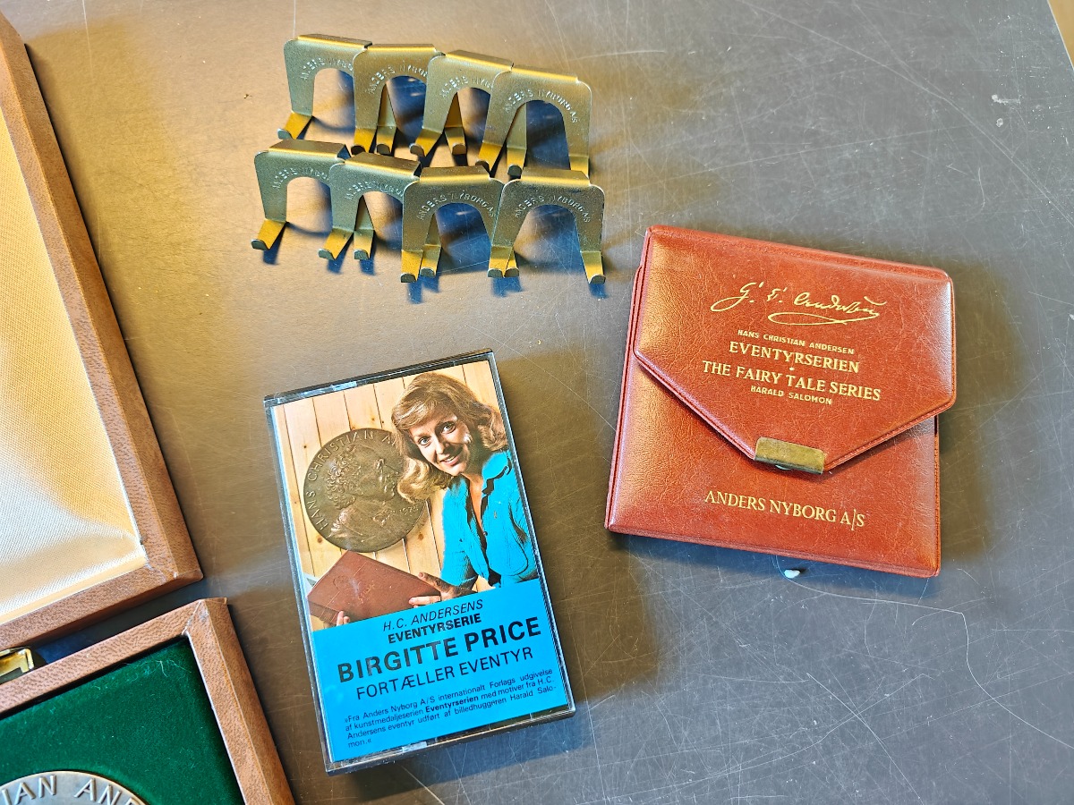 H. C. Andersen Eventyrserien medaljesæt af bronze, udgivet af Anders Nyborg A/S. Medfølger opbevaringsæske, displaystativer, kassettebånd med eventyr og lille etui.