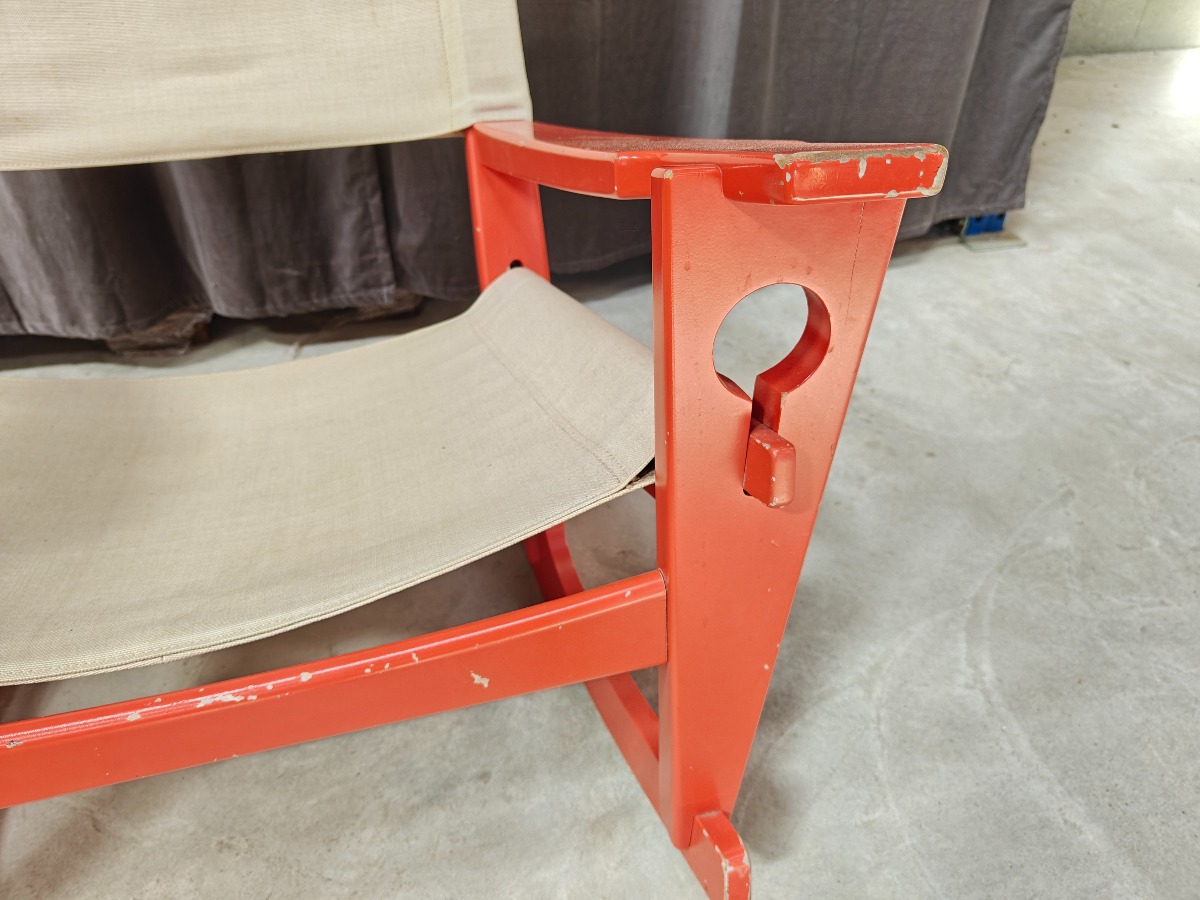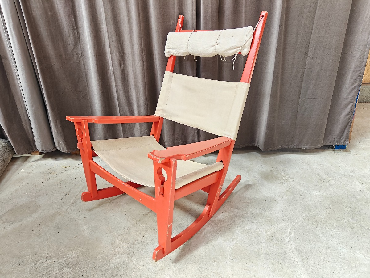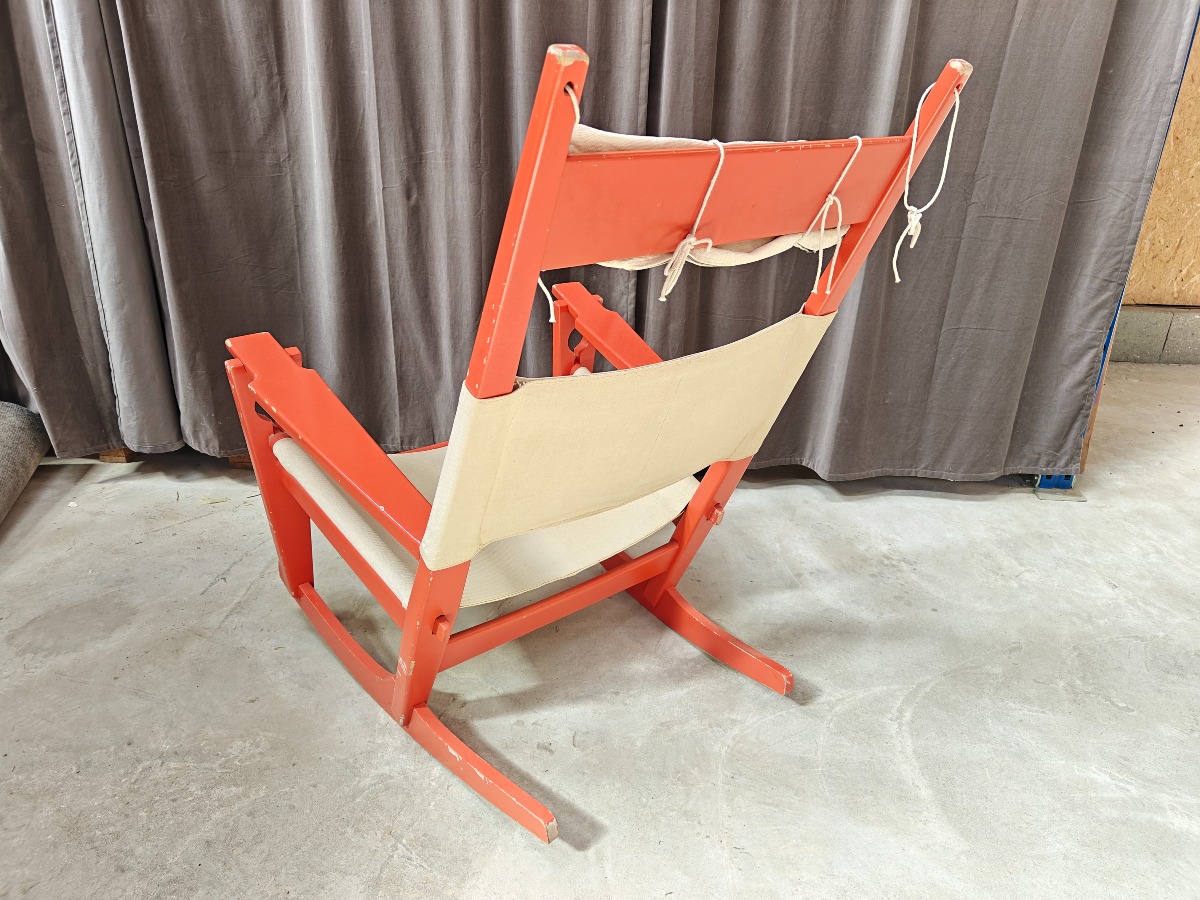 Hans J. Wegner GE673 gyngestol, "nøglehullet" Stel af rødlakeret bøg. Sæde og ryg af lærred. Fremstår med afslag på lakering. Stemplet i stellet.