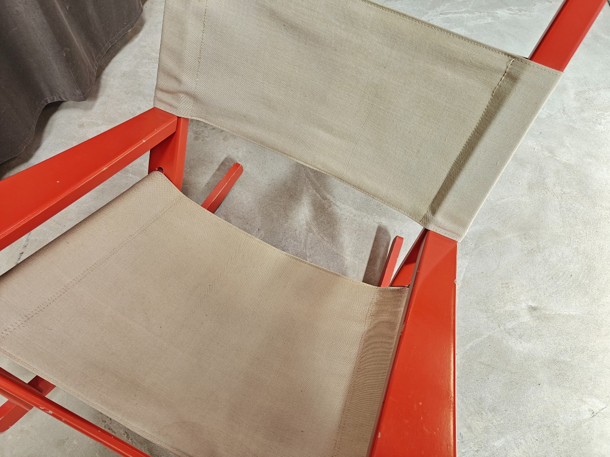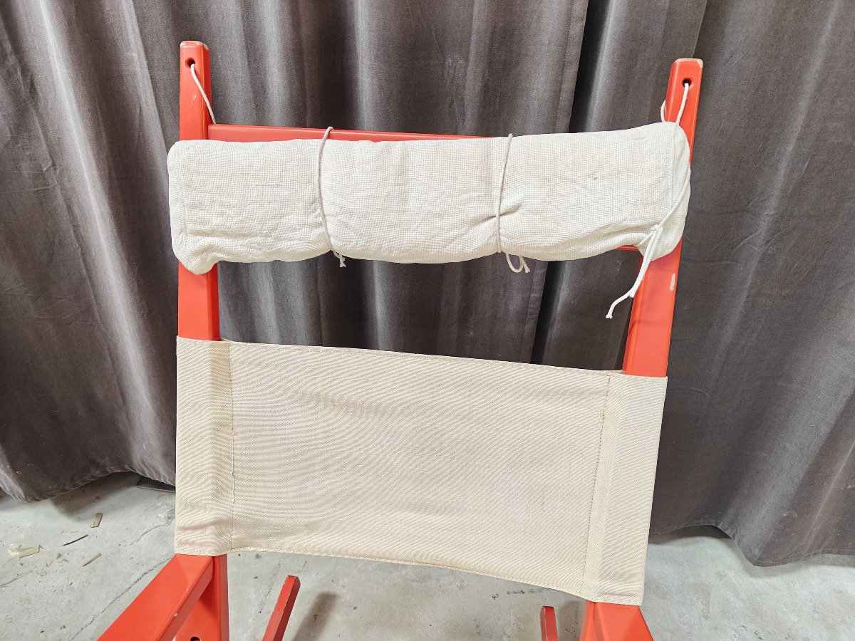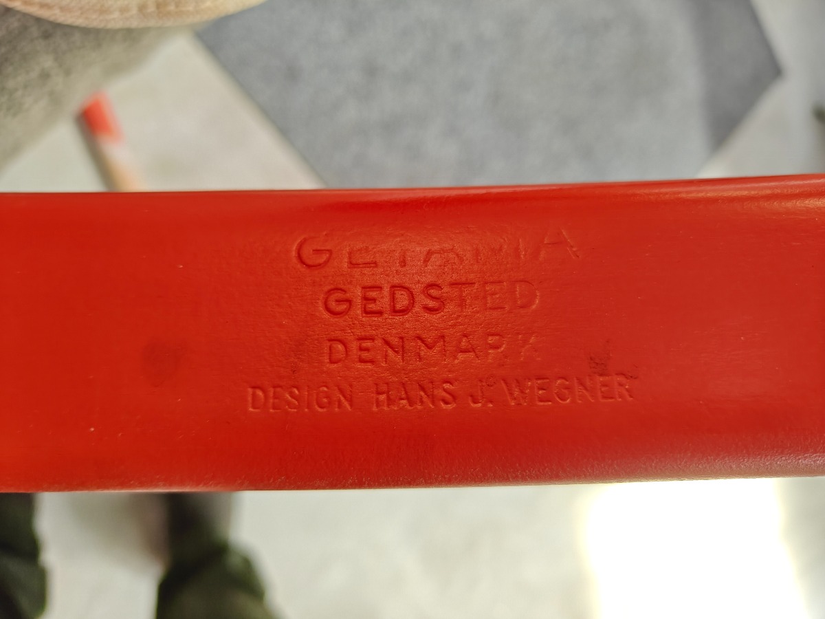 Hans J. Wegner GE673 gyngestol, "nøglehullet" Stel af rødlakeret bøg. Sæde og ryg af lærred. Fremstår med afslag på lakering. Stemplet i stellet.