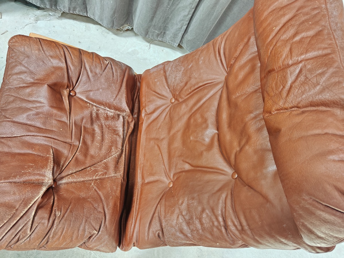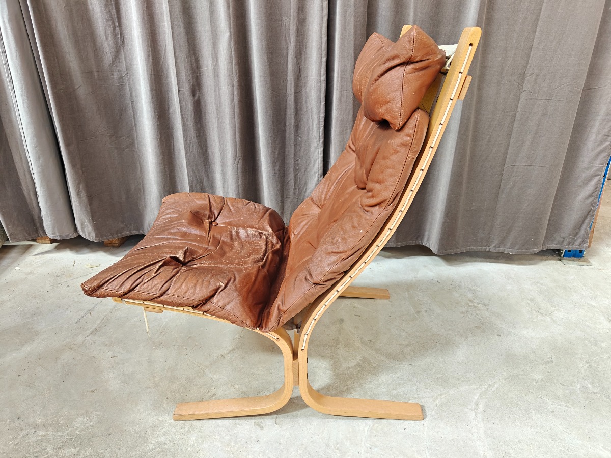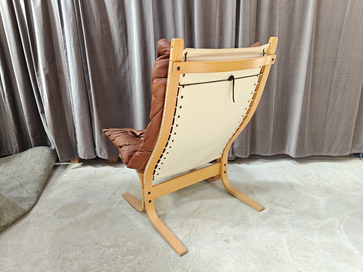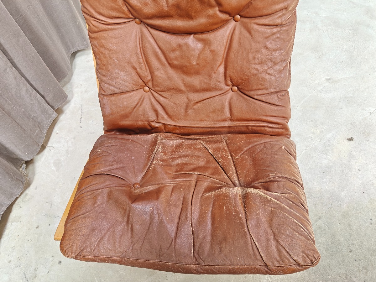 Ingmar Relling, Siesta stol med stel af formspændt bøg. Opspændt med lærred. løse hynder med brunt læder. Fremstår med slid på læder.