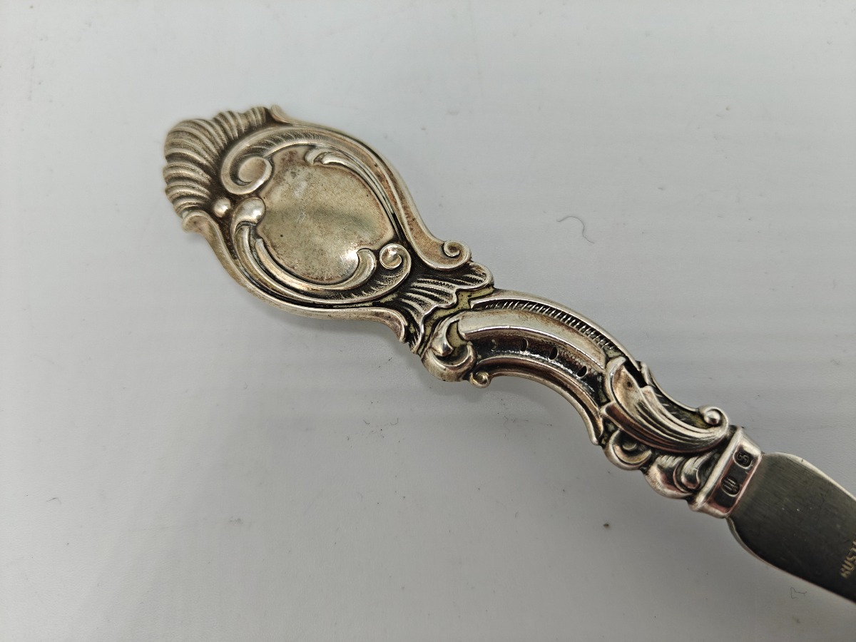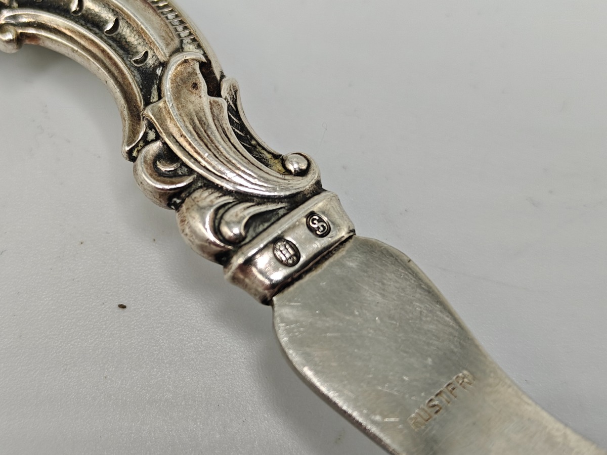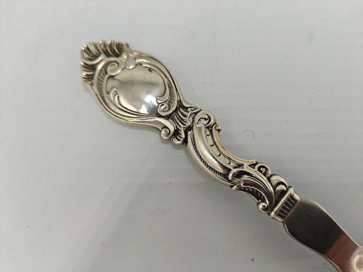 Kartoffelske af 3-tårnet sølv og stål. Skaft i rokokoform. Samlet vægt 69 g.