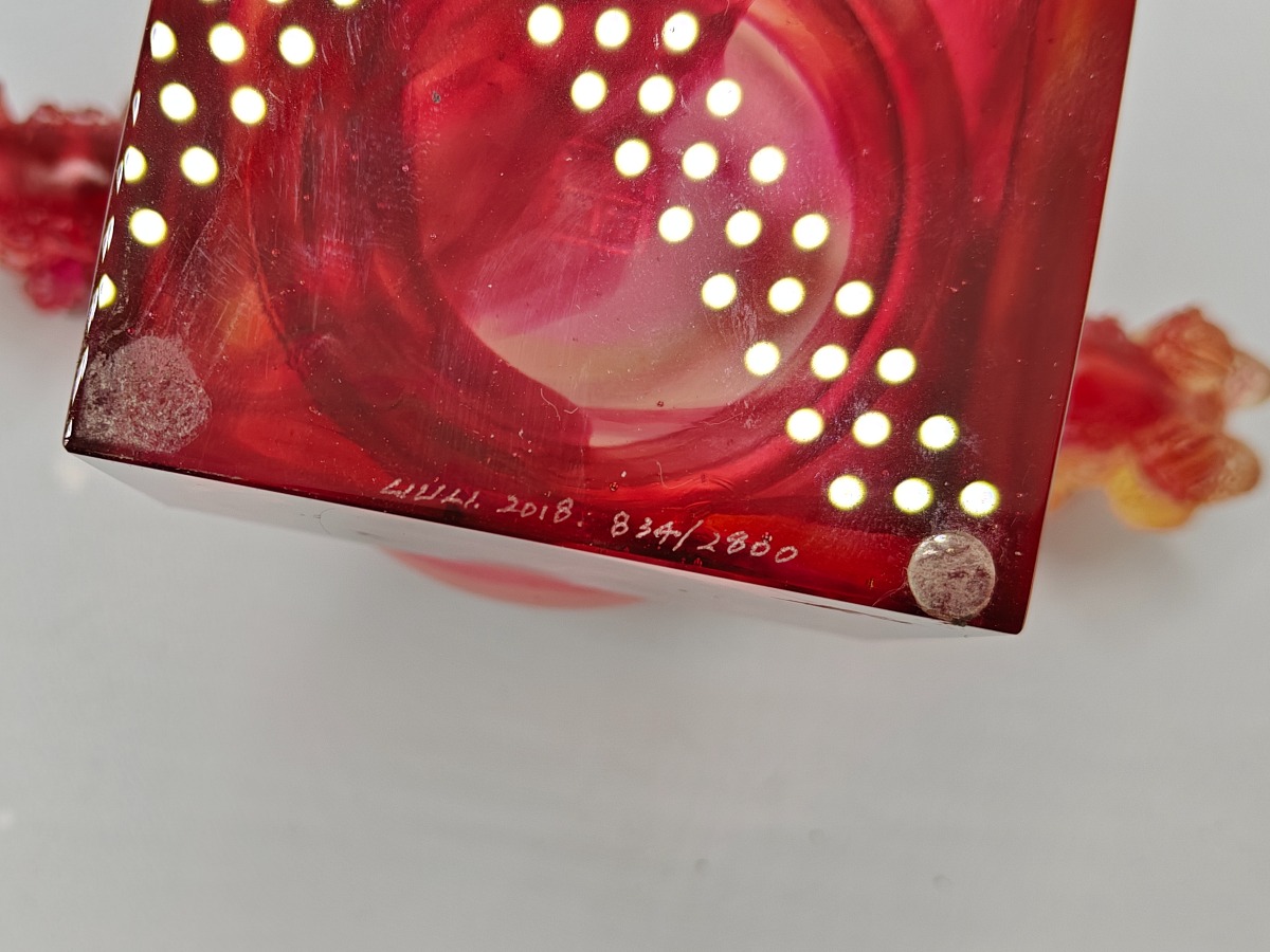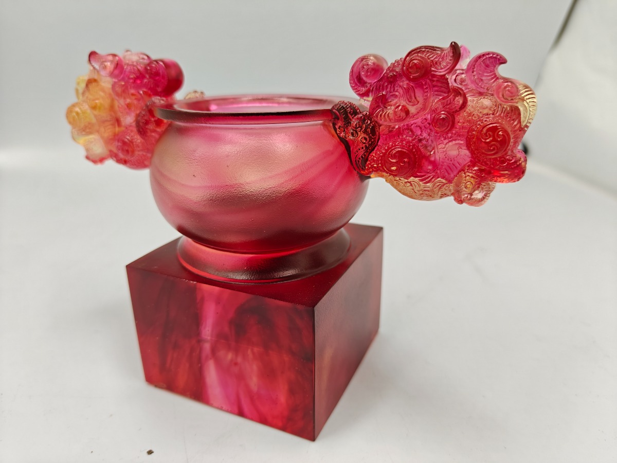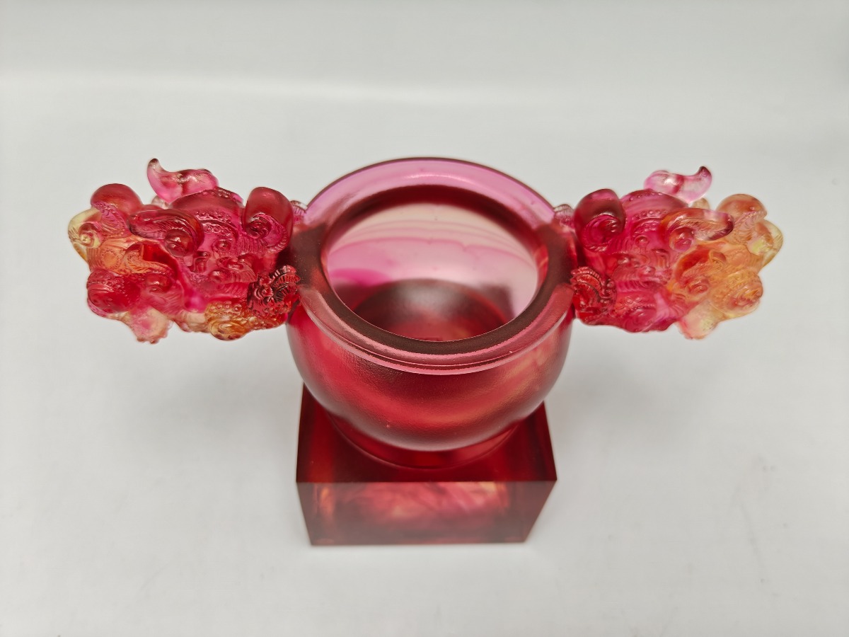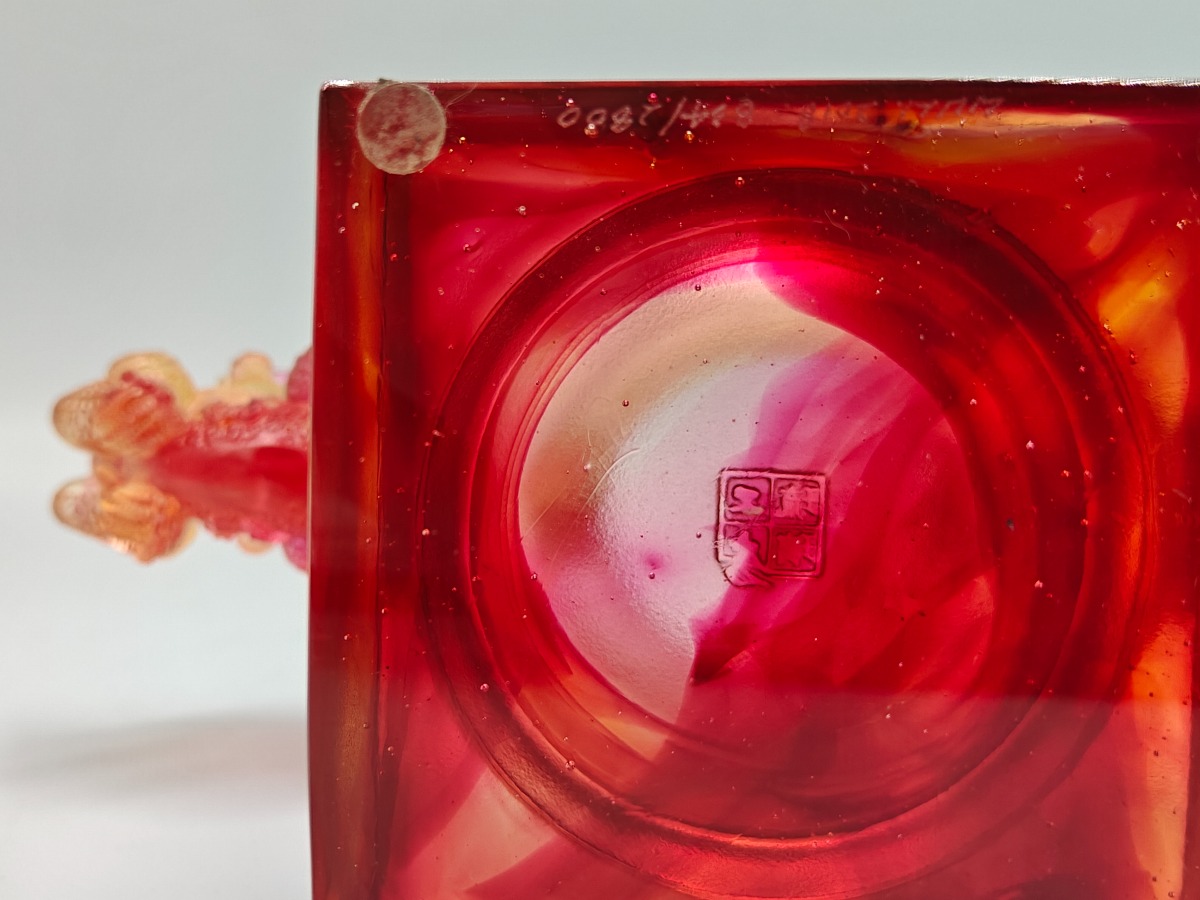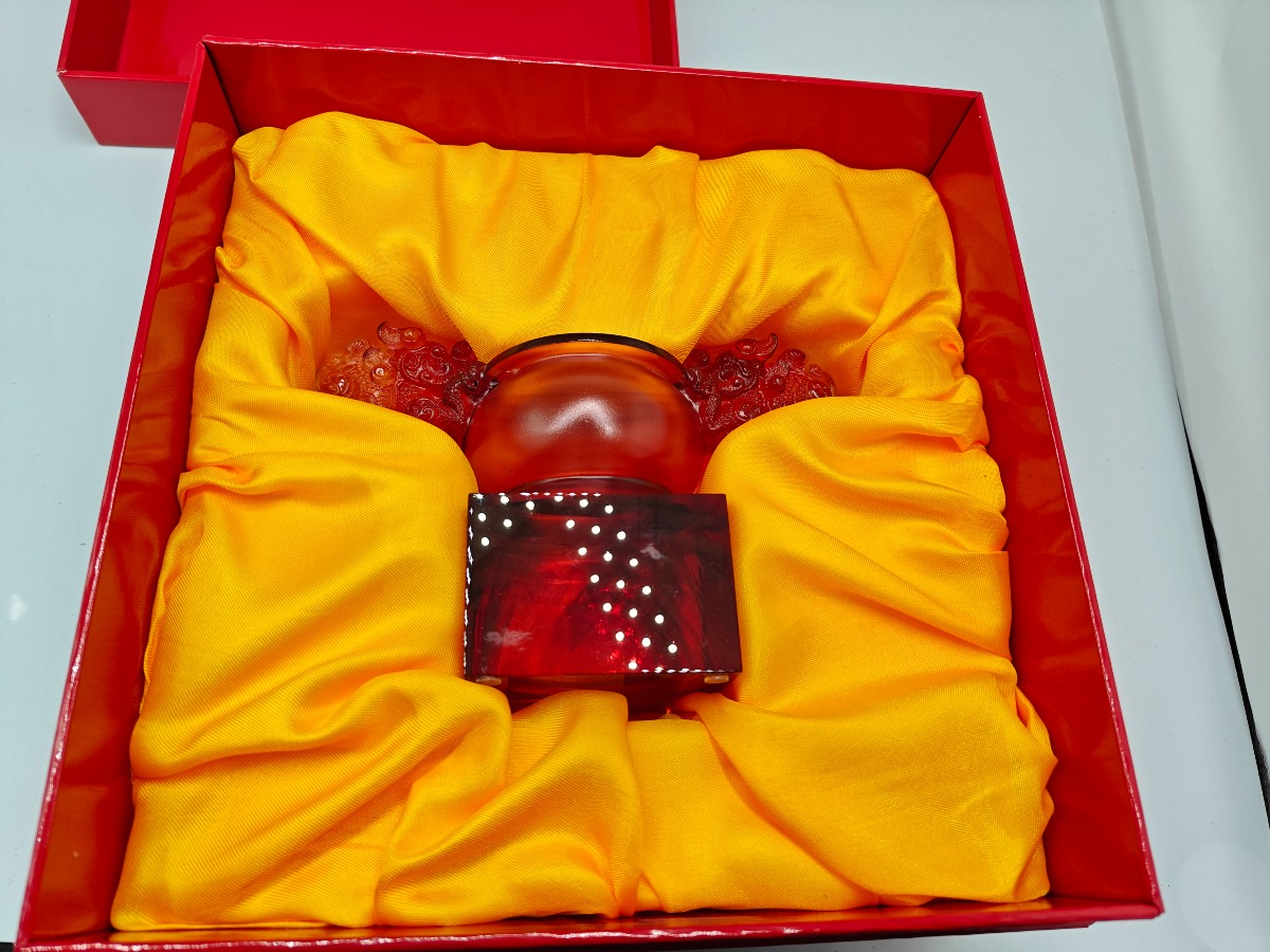 Liuligongfang krystalfigur i røde og gyldne toner. Original kasse og ertifikat medfølger. 12,5 x 17,5 cm.
