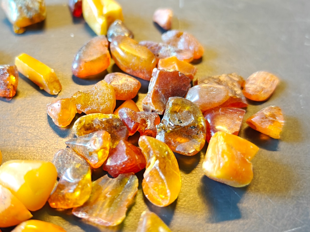 Samling af ravstykker. Både slebne og uslebne. Nogen med hul fra tidligere anvendelse til smykke. Ca. 27 g.